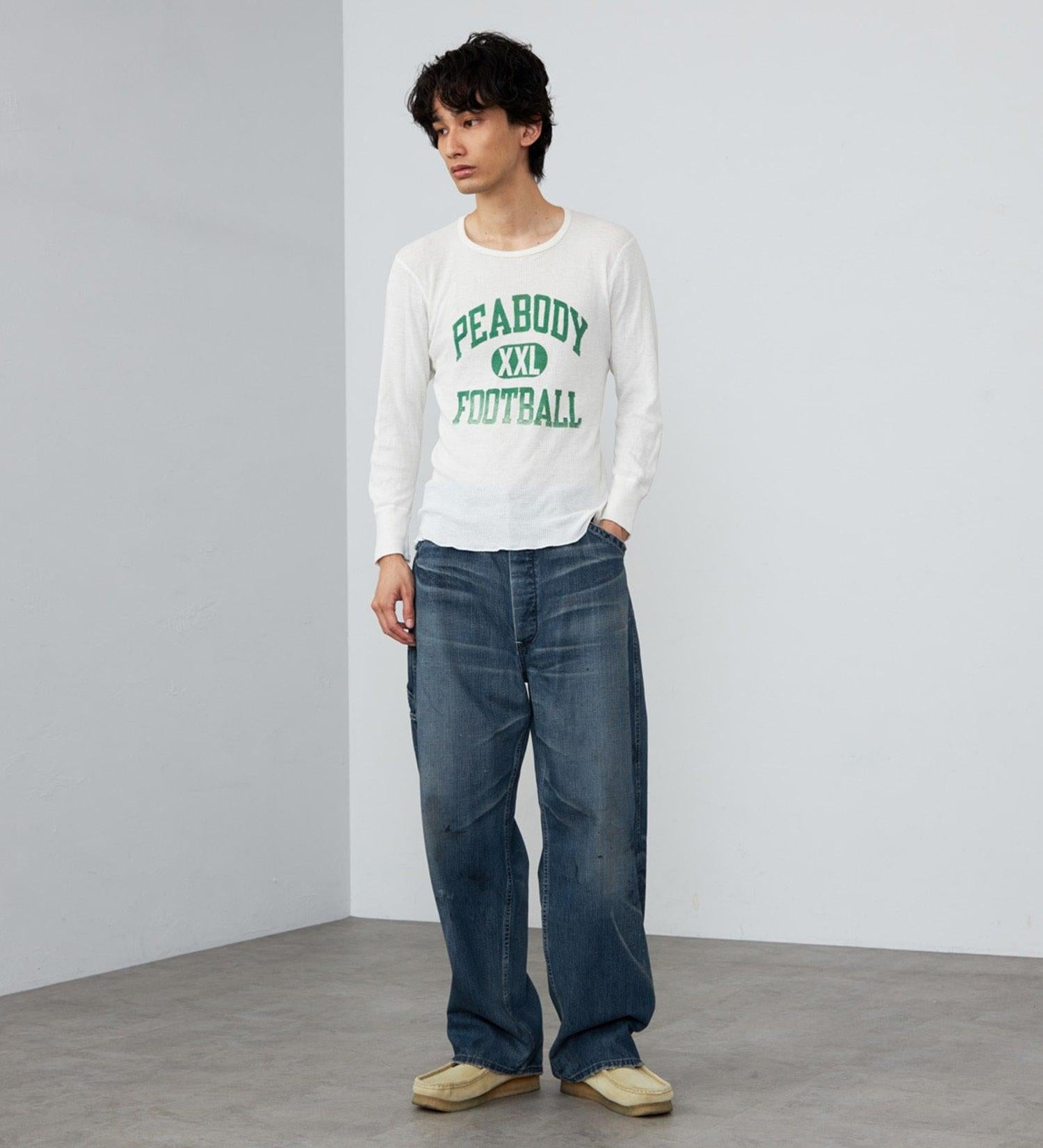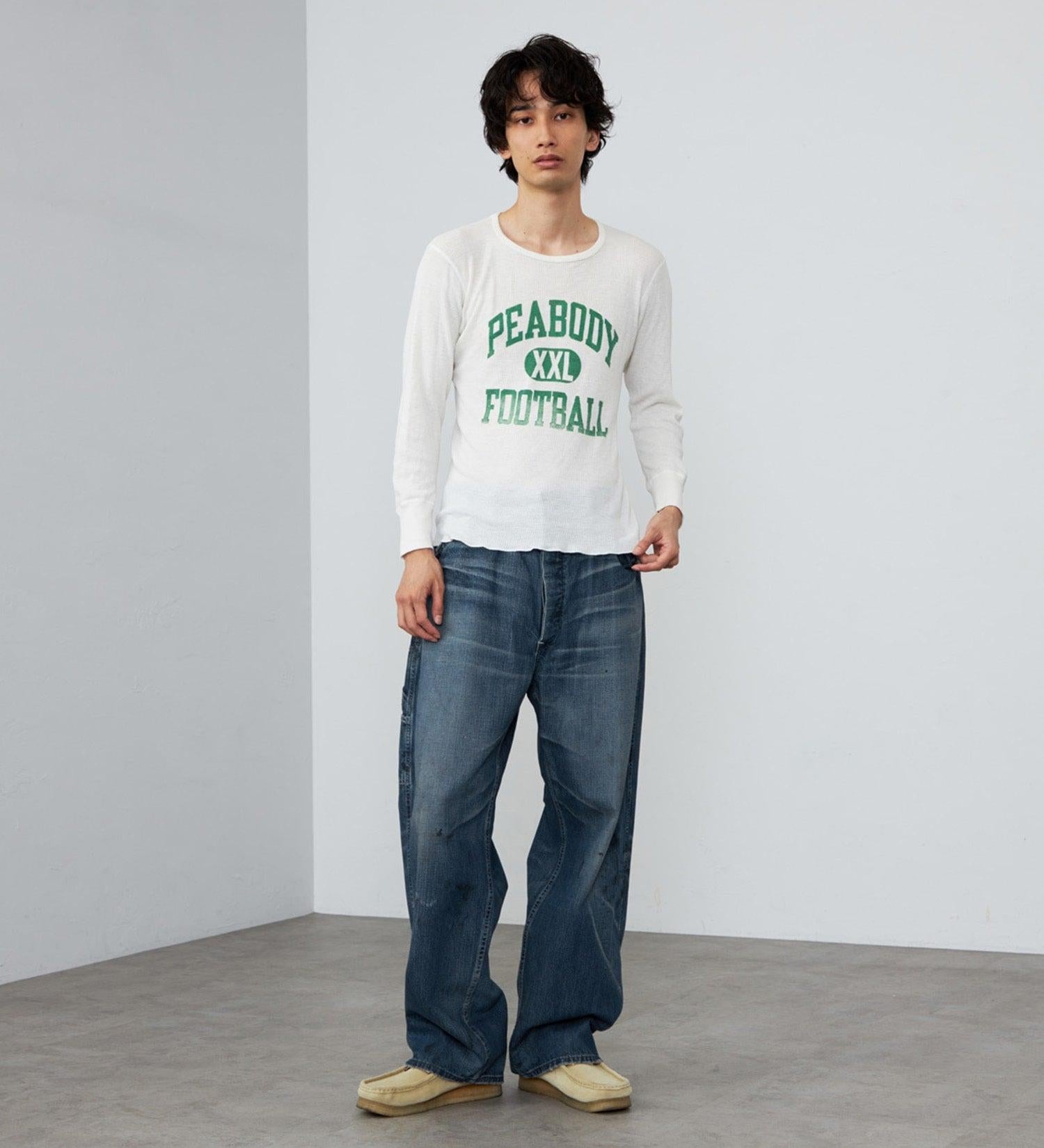 略微寬腰的版型和復古服裝的硬質加工感,給人一種復古的感覺。