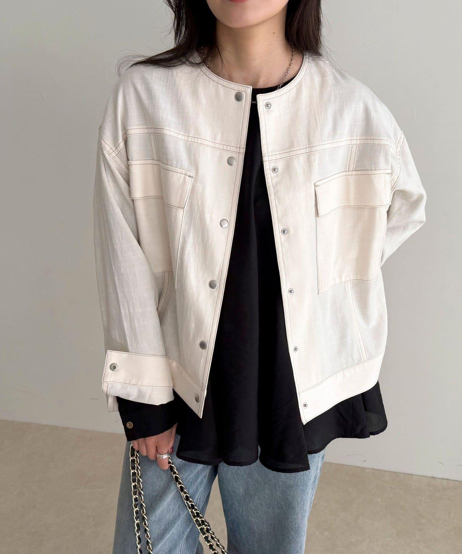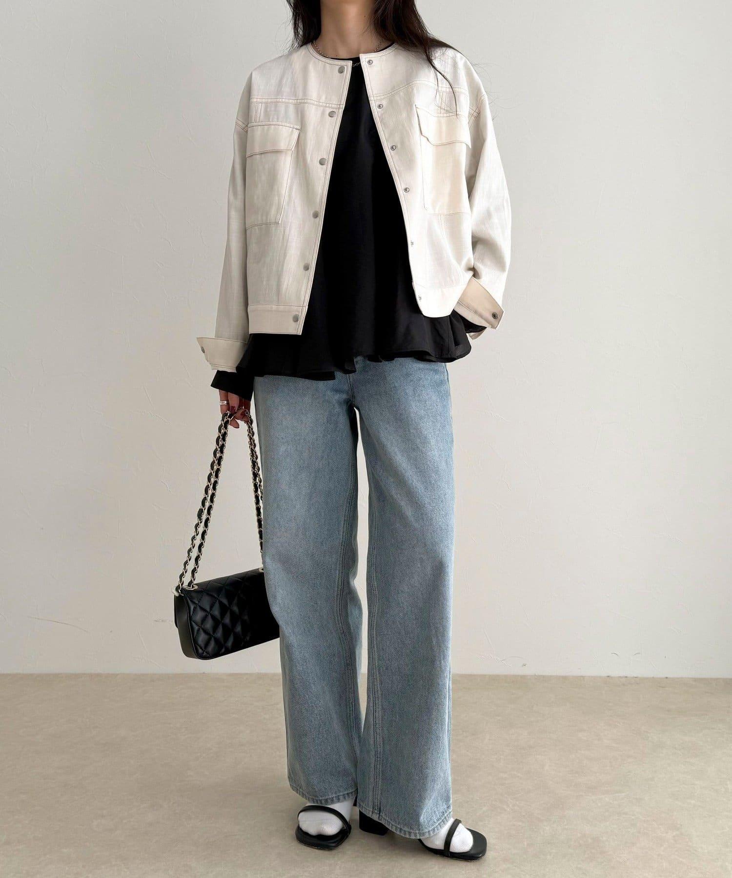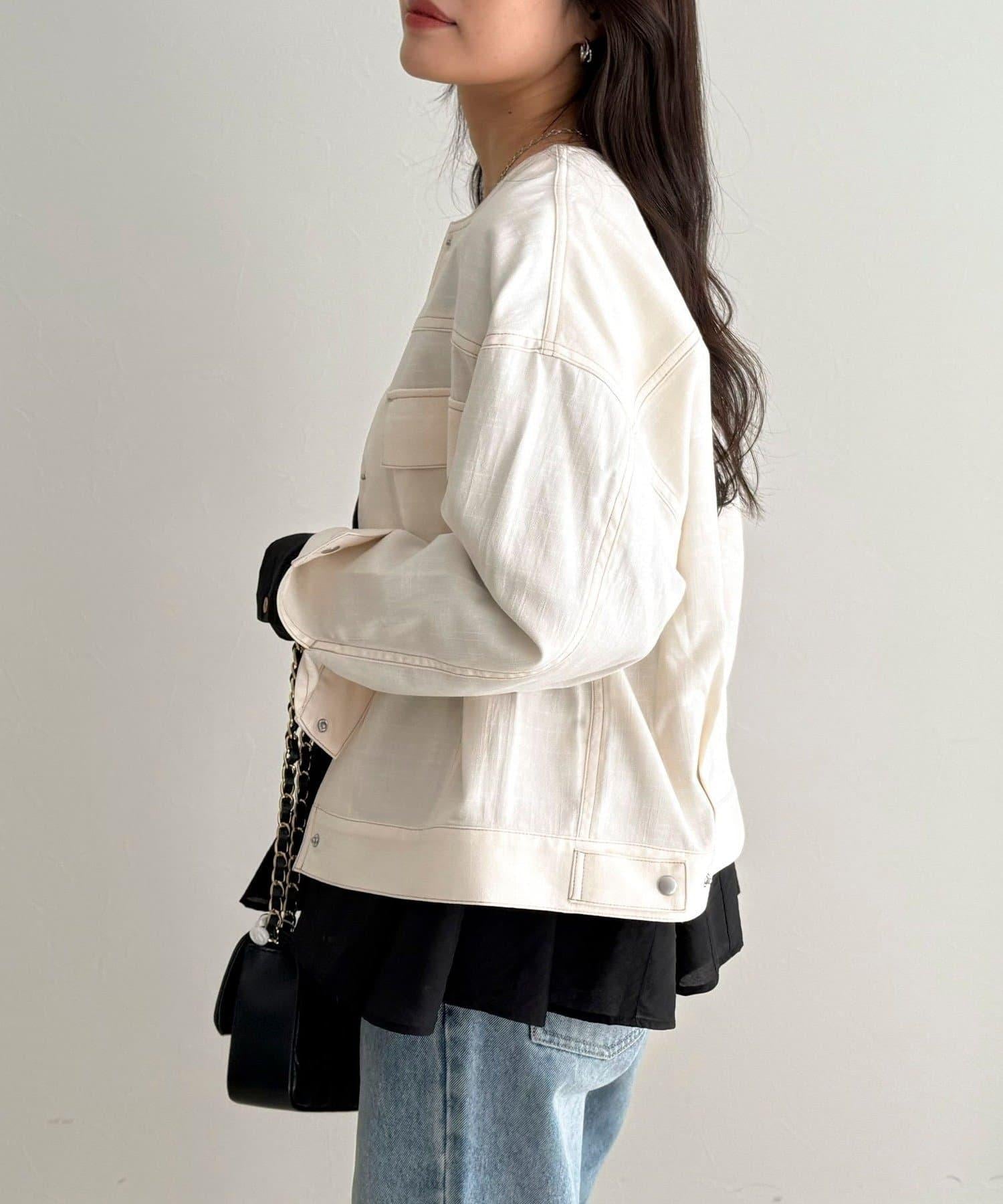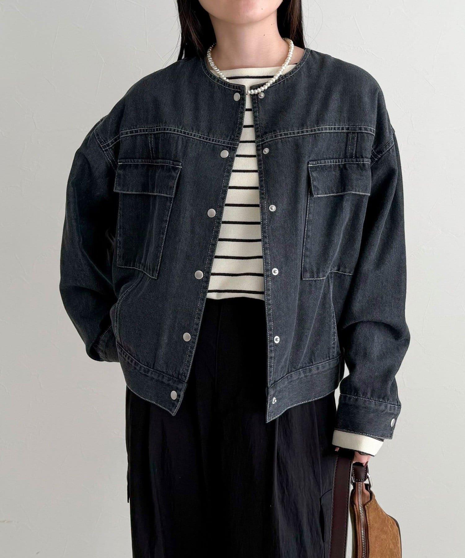 牛仔布料雖然休閒,但無領設計卻給人一種簡潔優雅的印象。