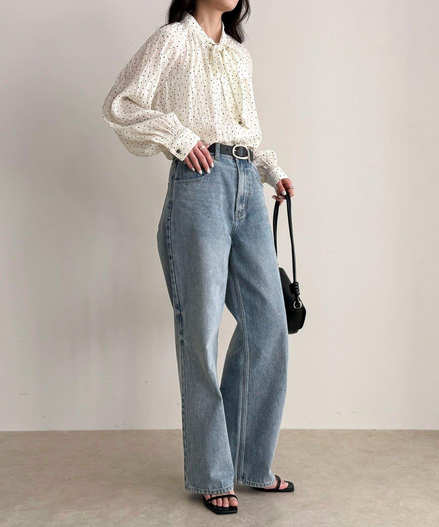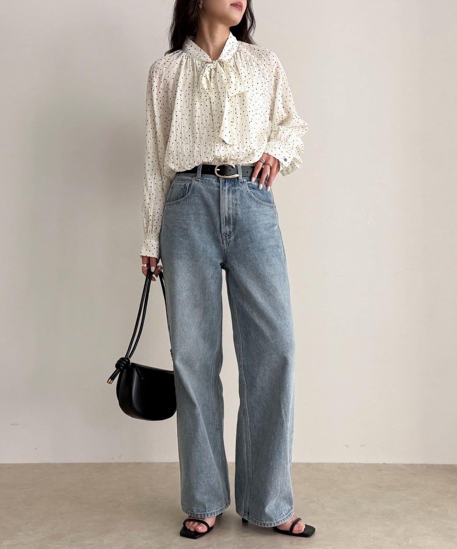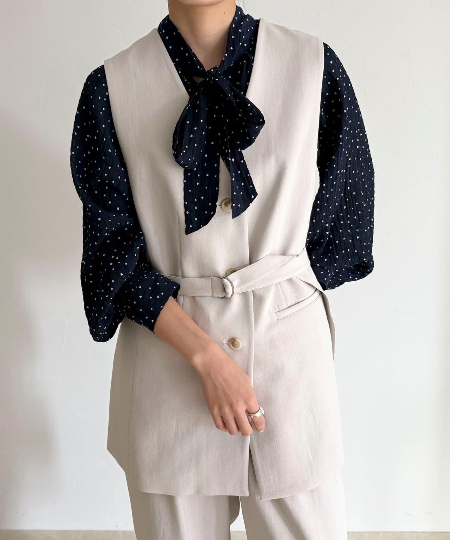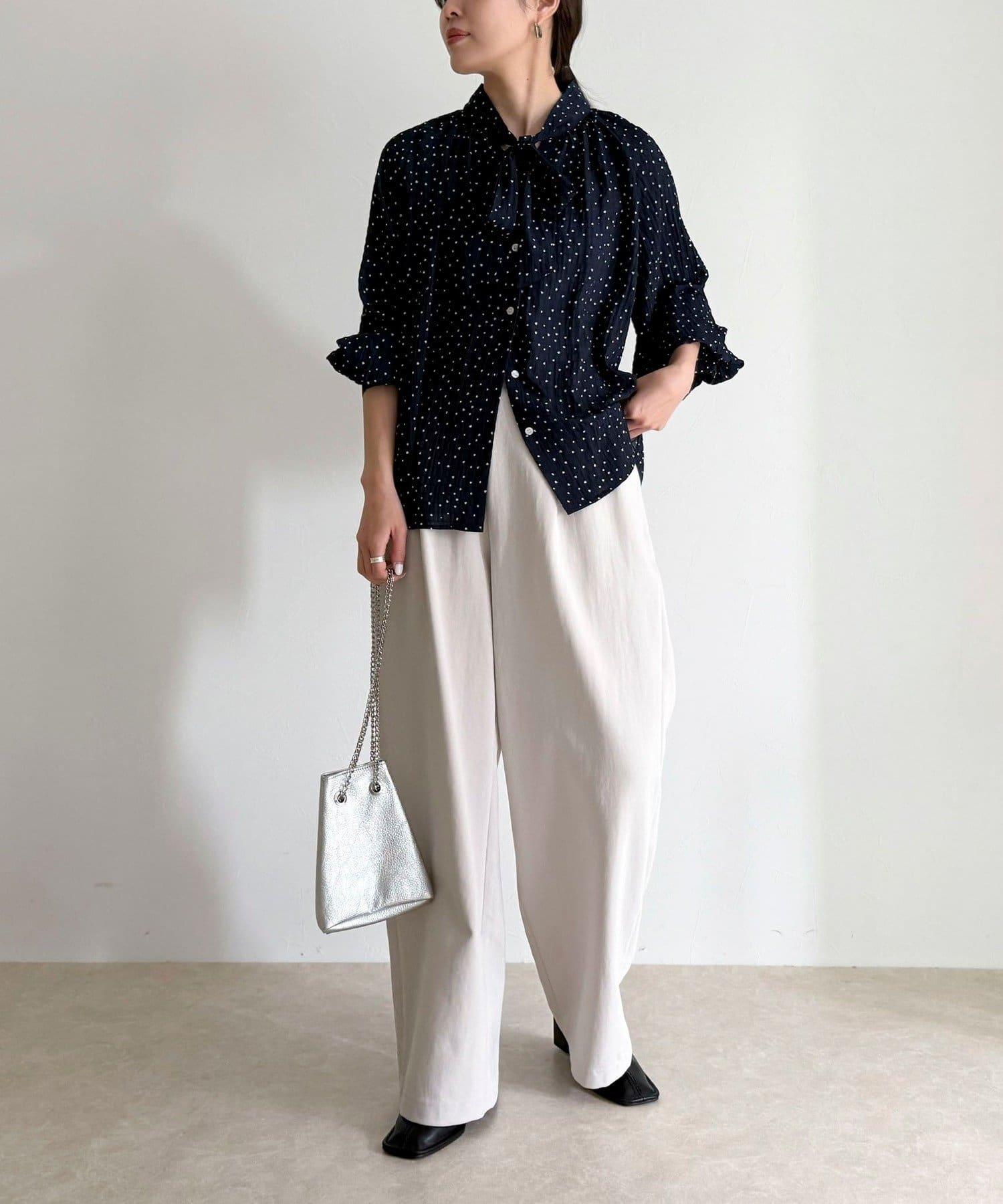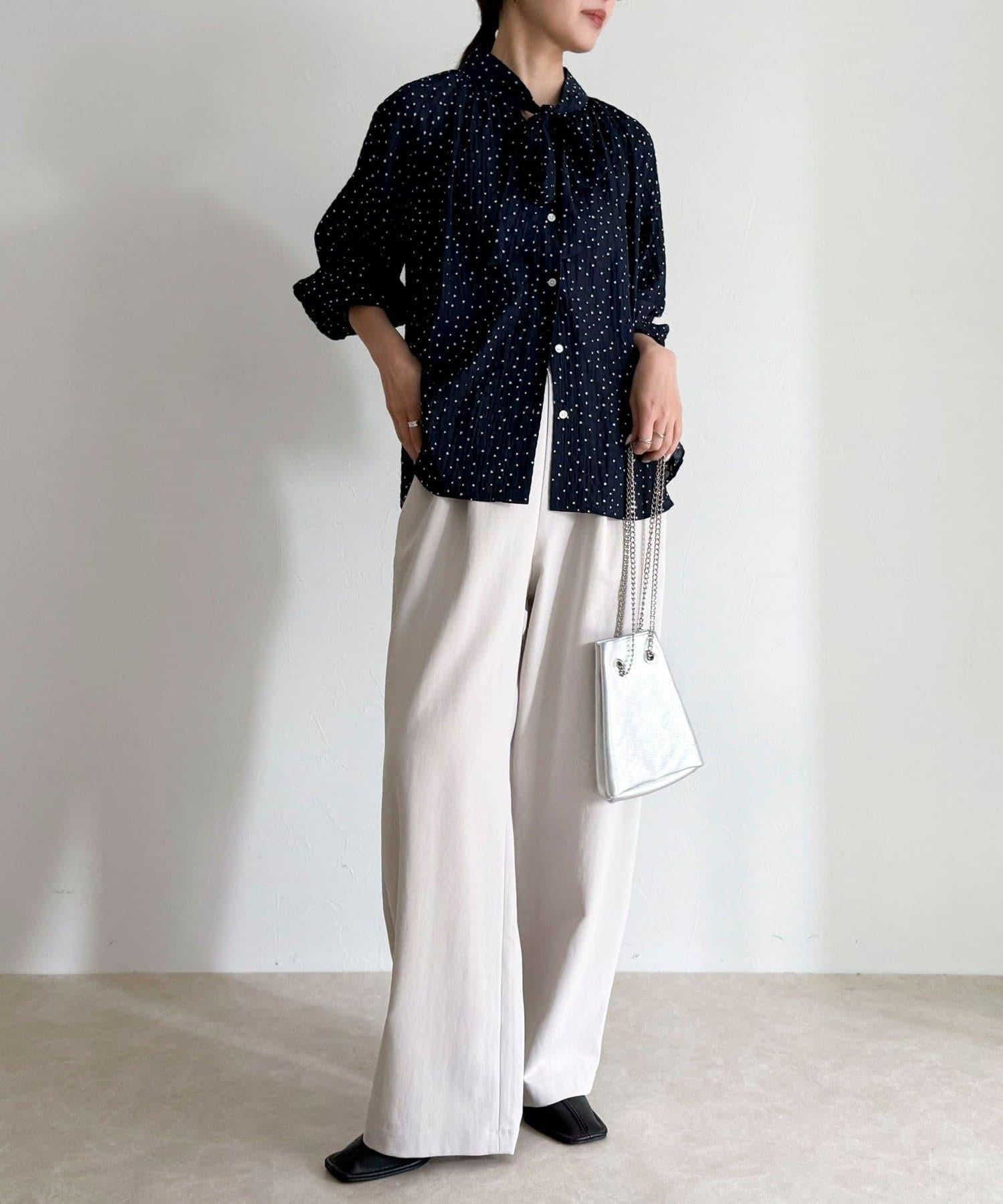 面料具有墜感,搭配蝴蝶結領帶也不會顯得過於甜美。