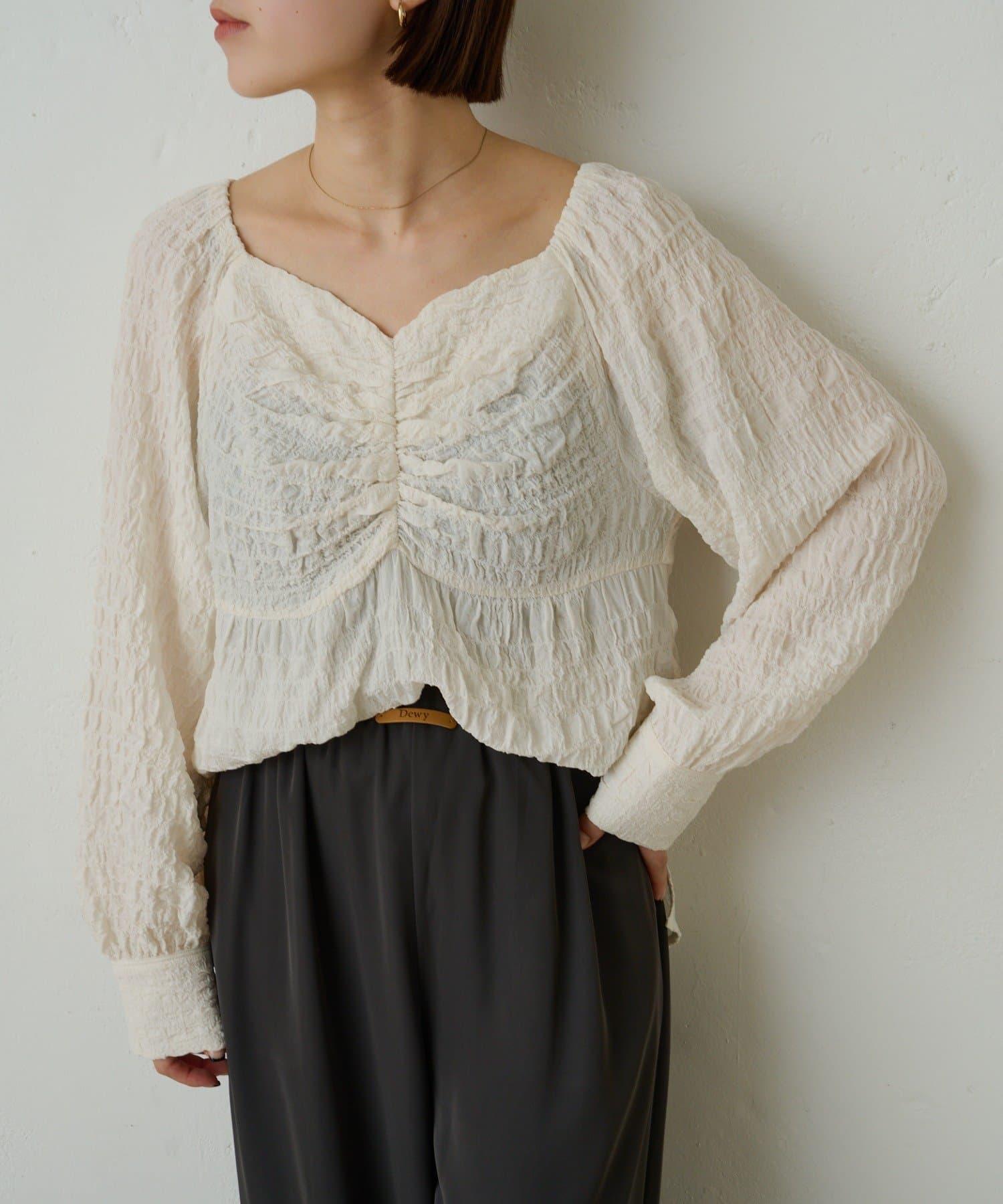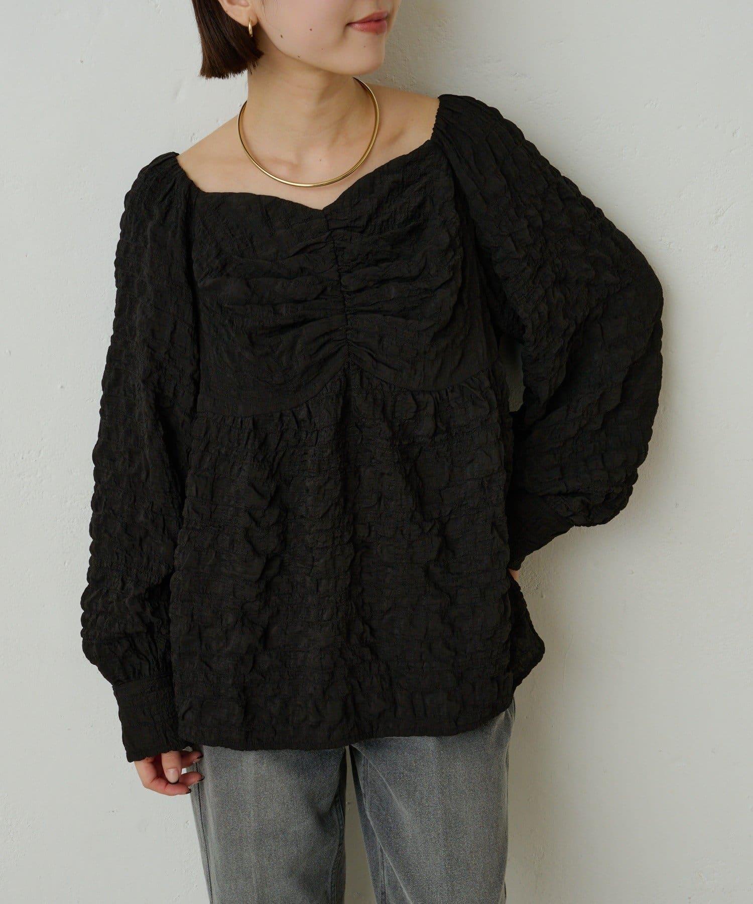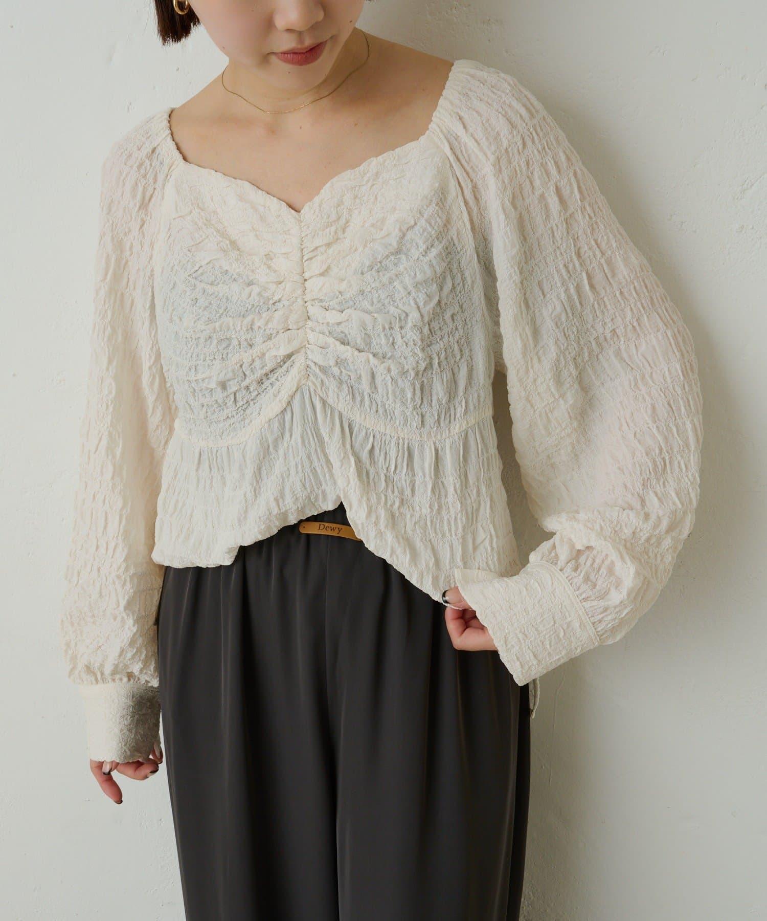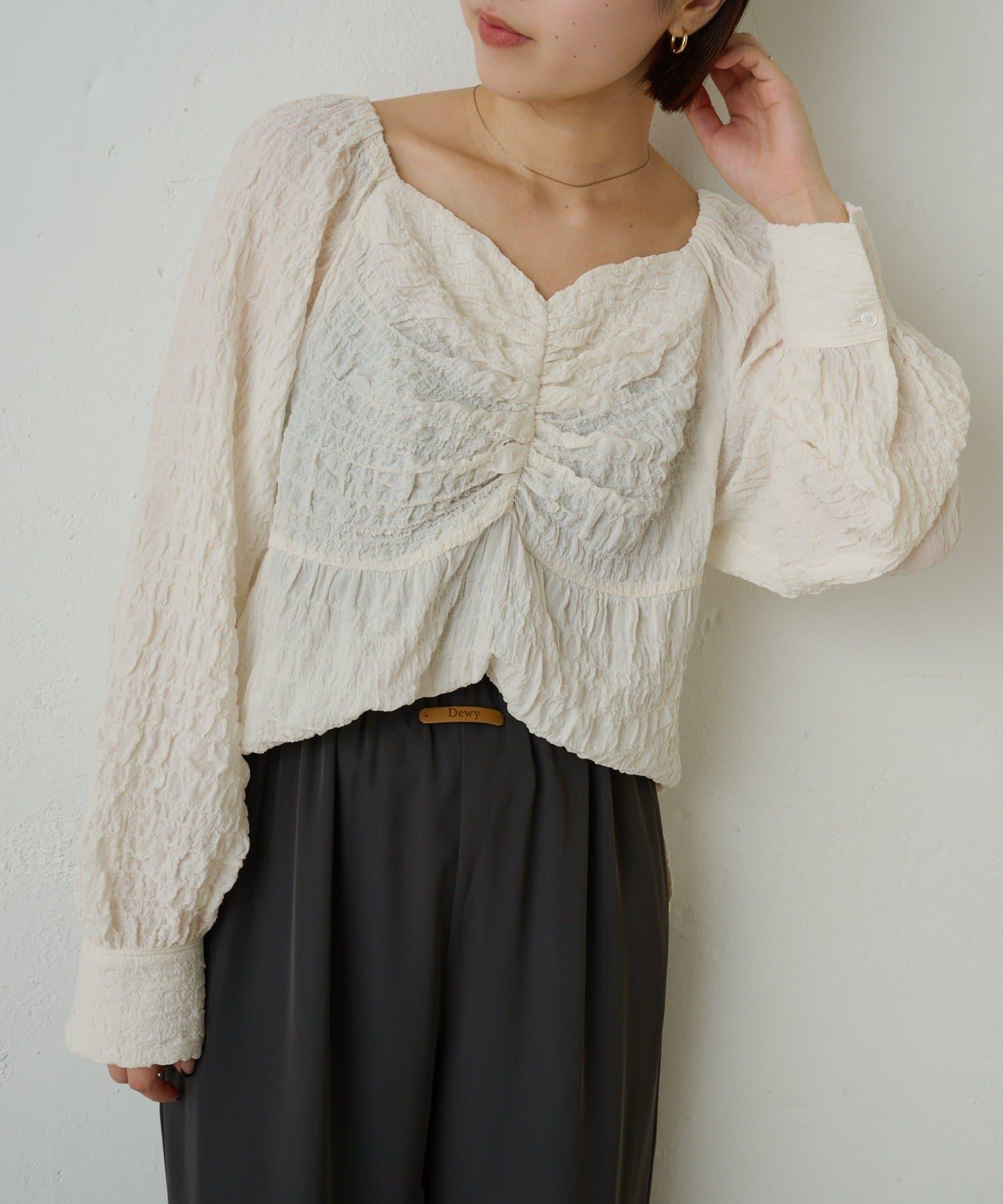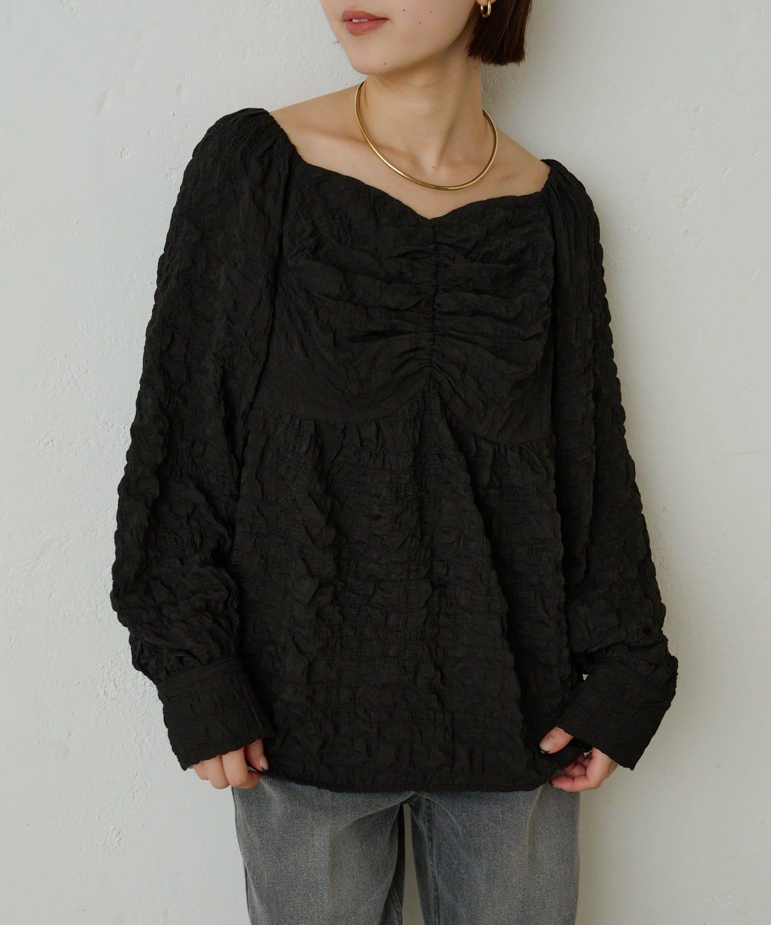 這款心形領上衣胸前的設計和凹凸不平的面料是這款上衣的亮點。