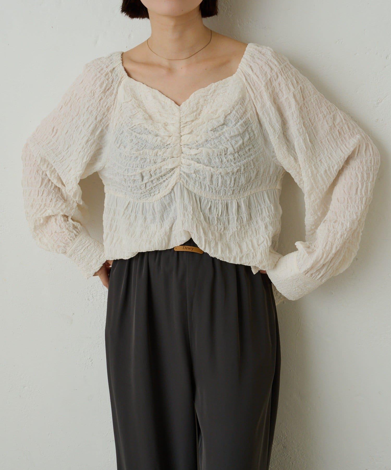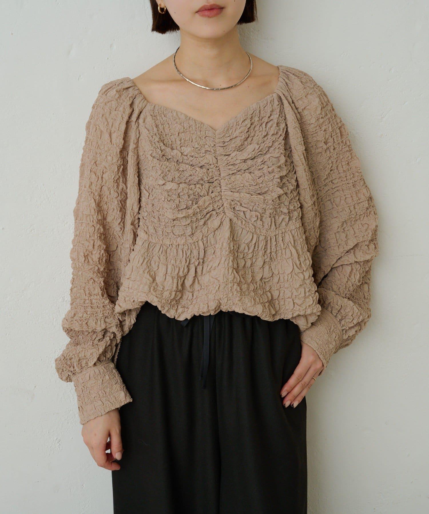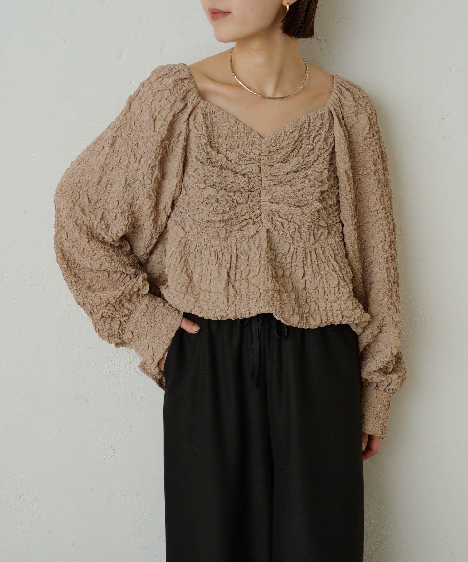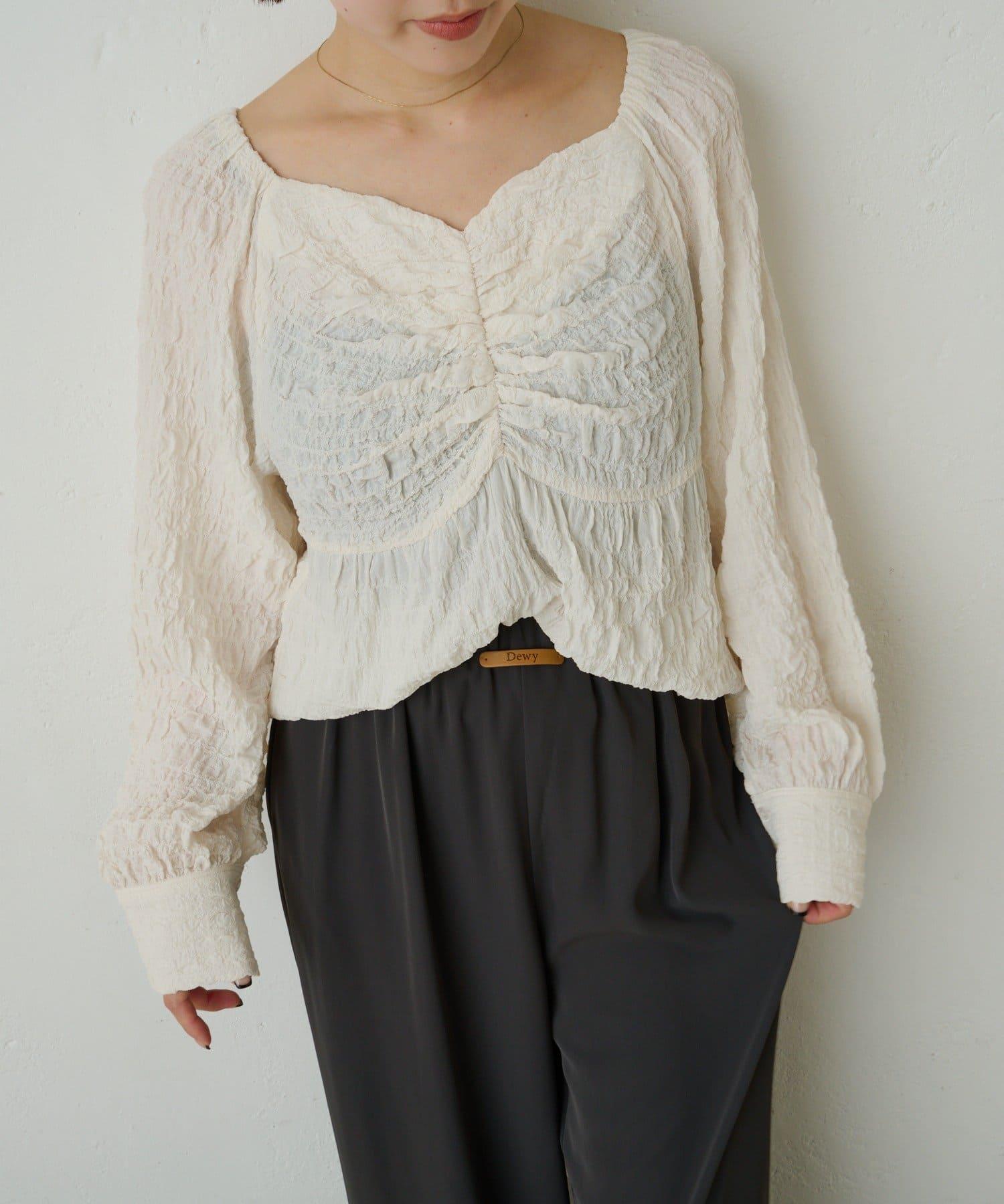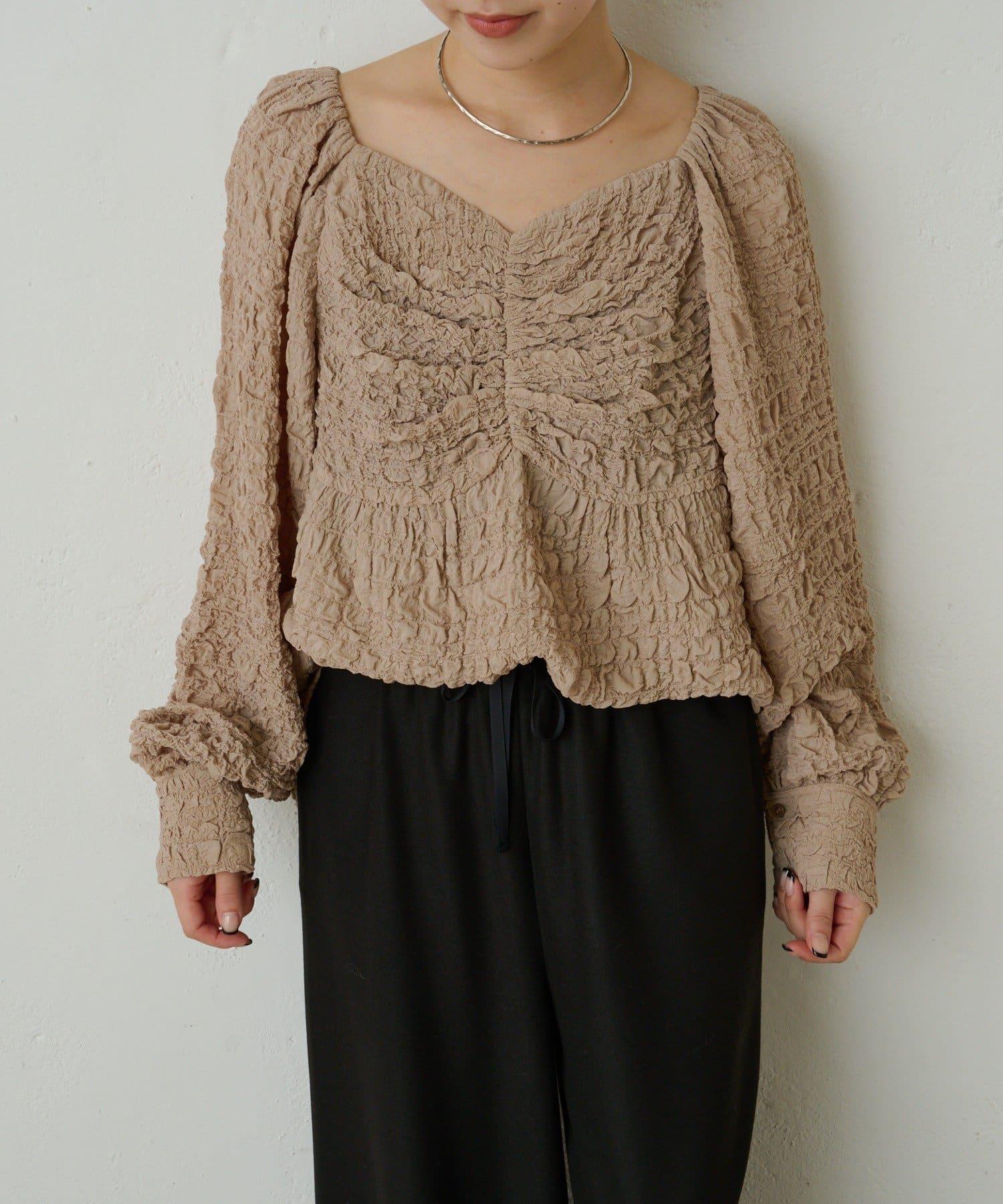 這款心形領上衣胸前的設計和凹凸不平的面料是這款上衣的亮點。