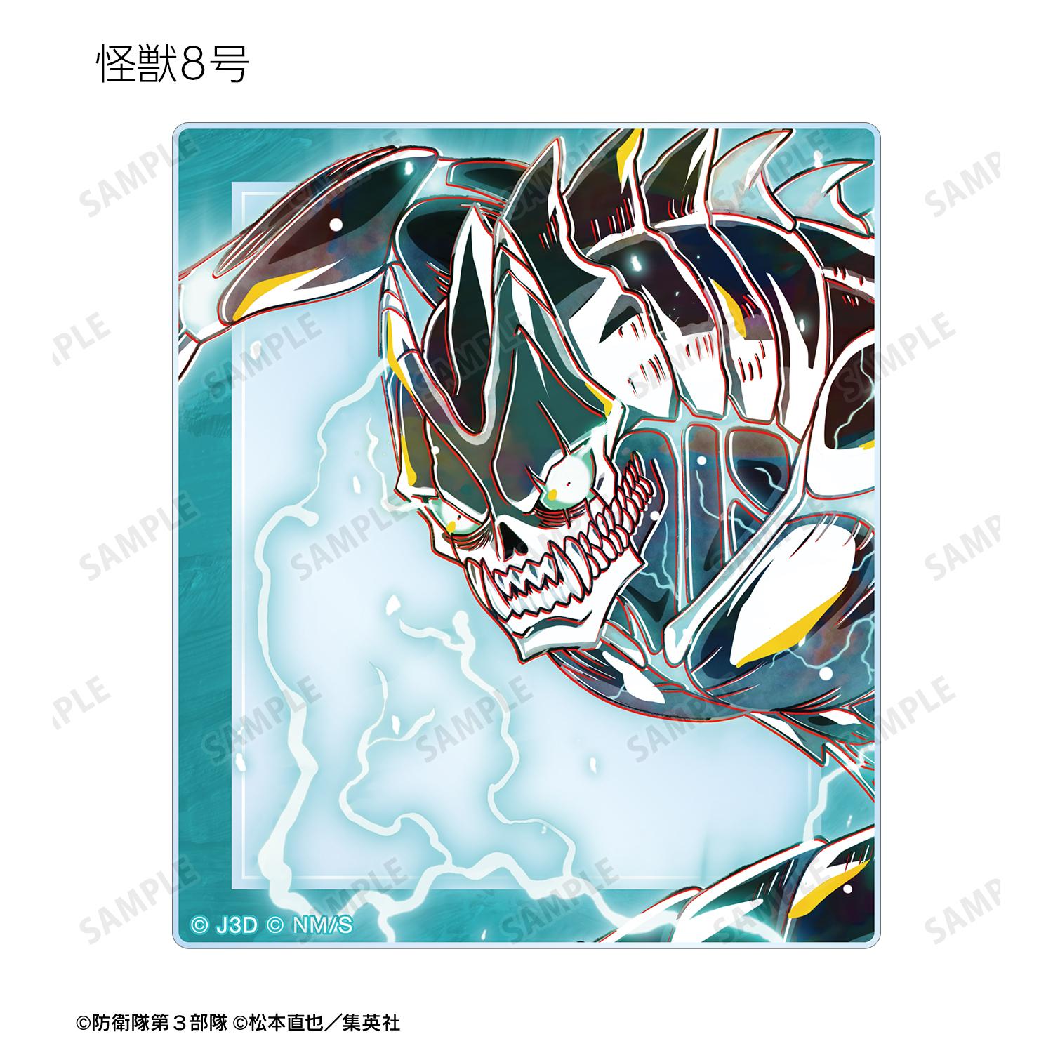8 號怪獸、日比野卡夫卡、市川雷諾、筱宮喜鶴、阿比拉美娜、星名宗次郎、成海元、古橋伊春、筱宮勲和 9 號怪獸的插圖以嶄新的方式呈現在亞克力卡片上,魅力十足。