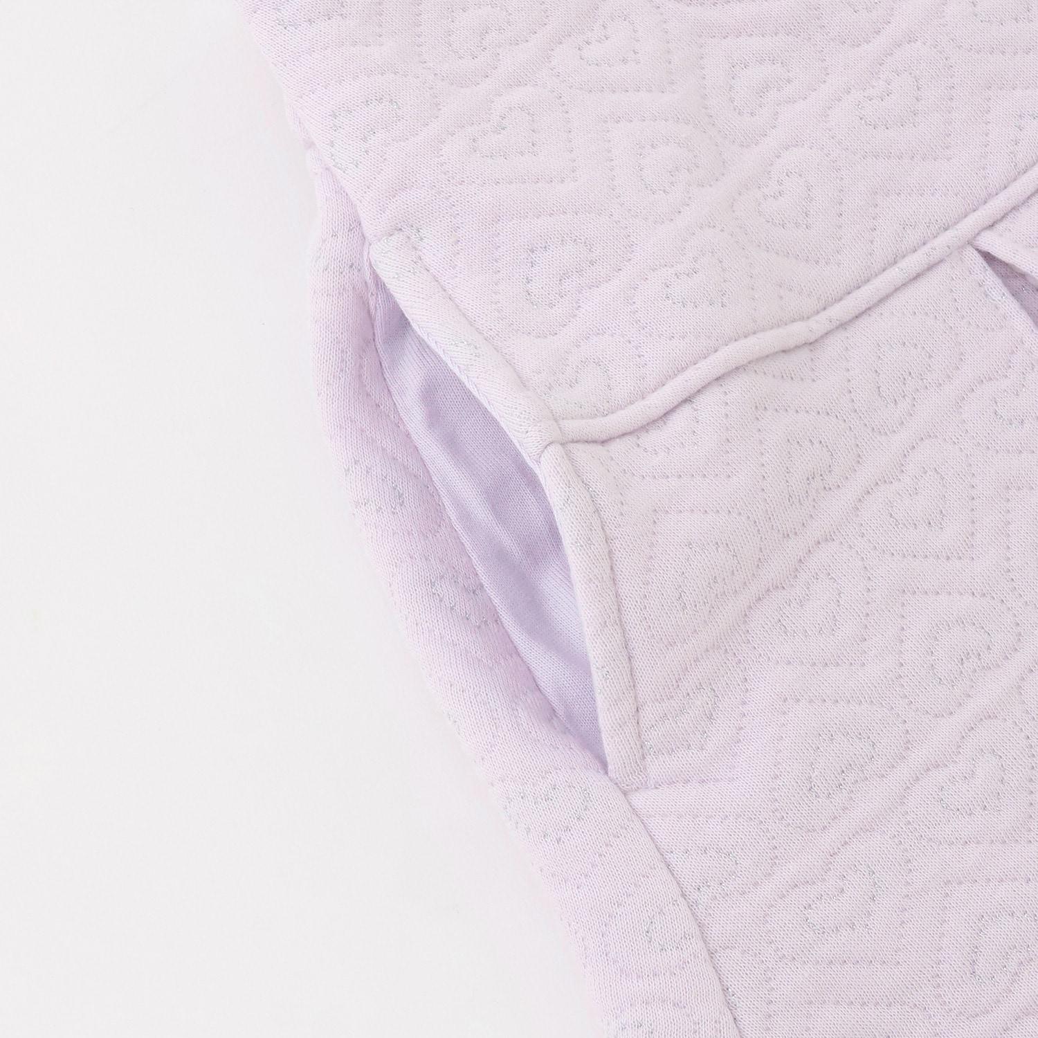 裙子前部有方形褶皺,腰部有鬆緊帶,方便穿著。