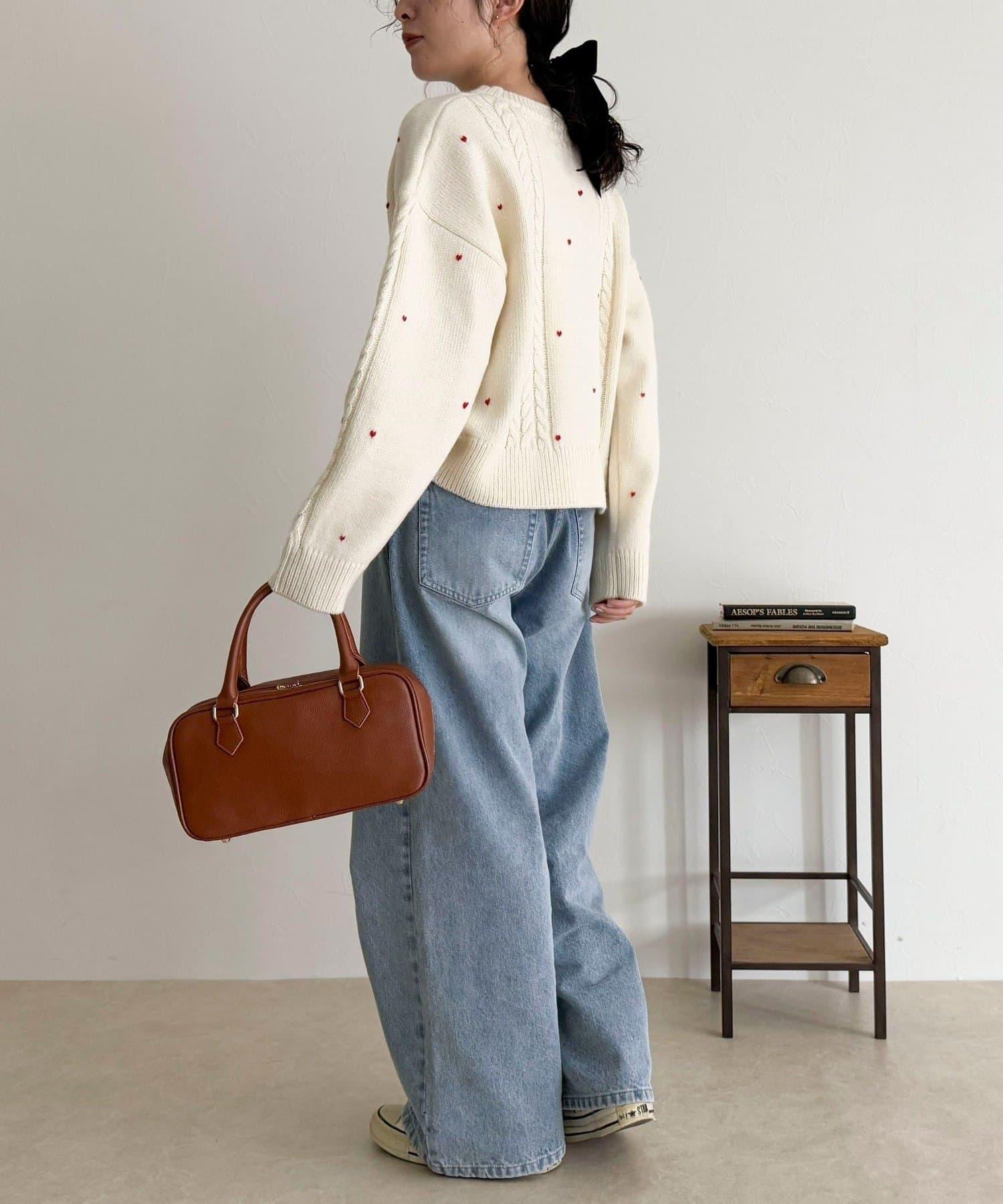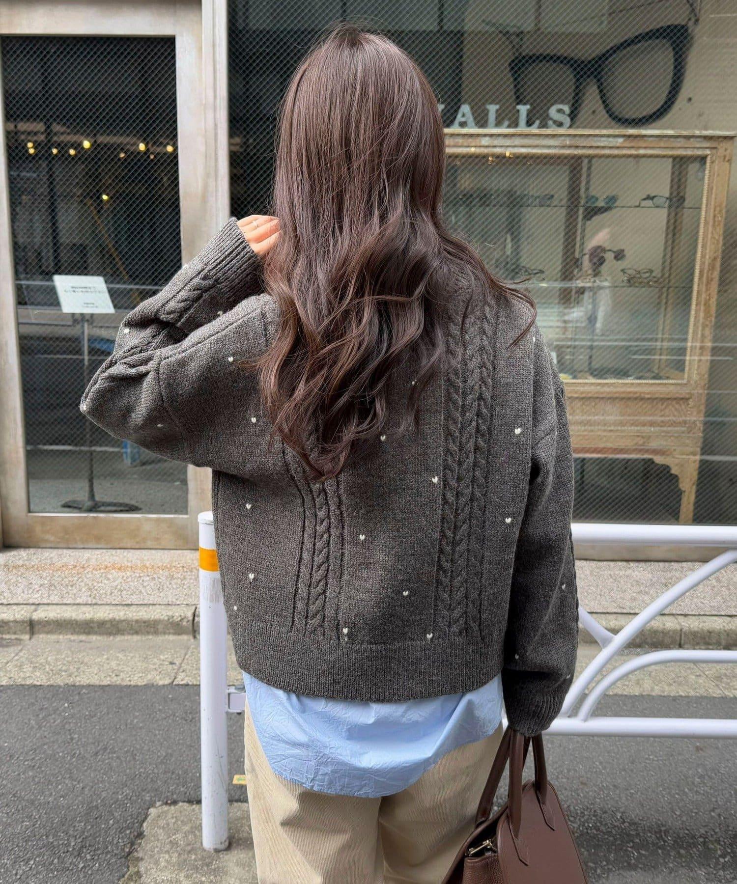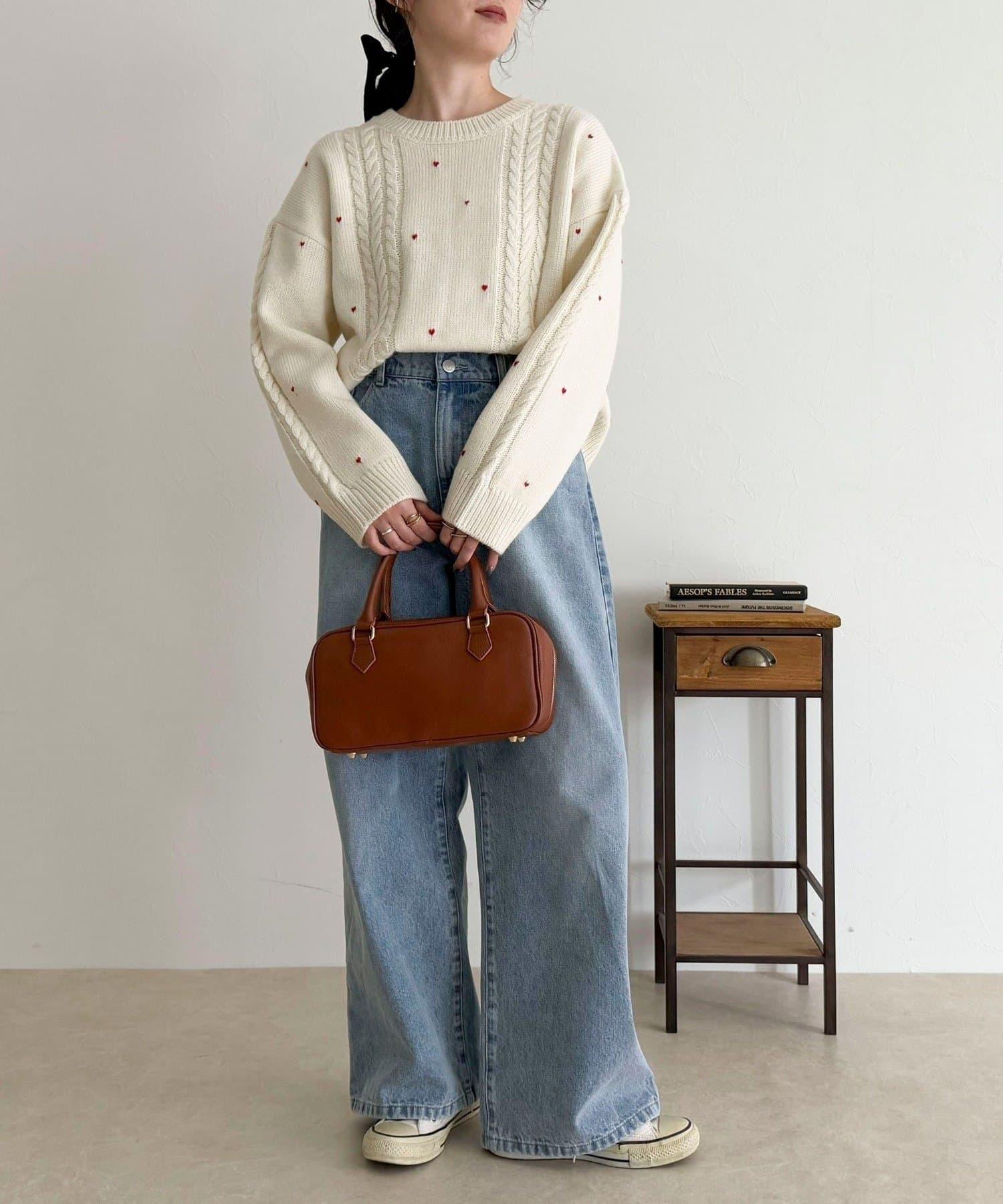 身高 156 厘米的工作人員(穿 38 號):心形刺繡近看很可愛,遠看也不浮誇,我可以像大人一樣穿它!即使疊穿也不會有緊繃感,很有可能作為秋冬針織衫的主角活躍起來◎。