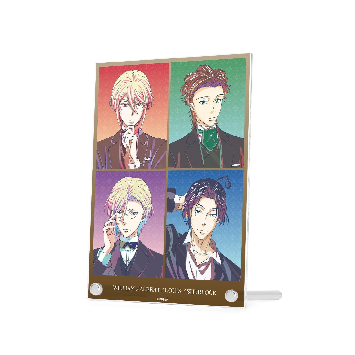 威廉-詹姆斯-莫里亞蒂、阿爾伯特-詹姆斯-莫里亞蒂、劉易斯-詹姆斯-莫里亞蒂和夏洛克-福爾摩斯的插圖被賦予了新的魅力,現在可以製成 A5 大小的亞克力面板。