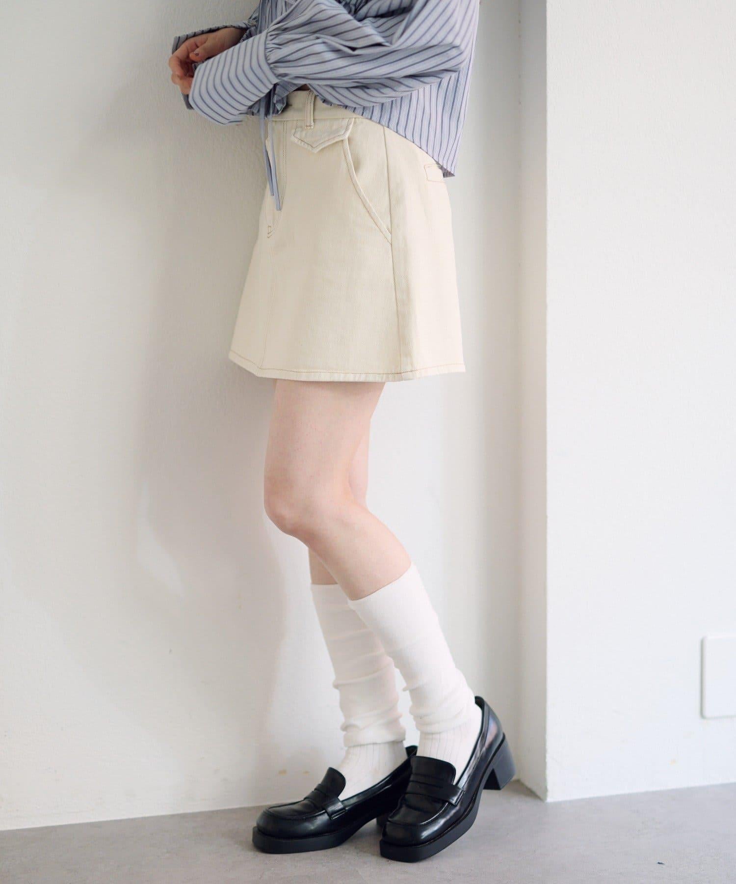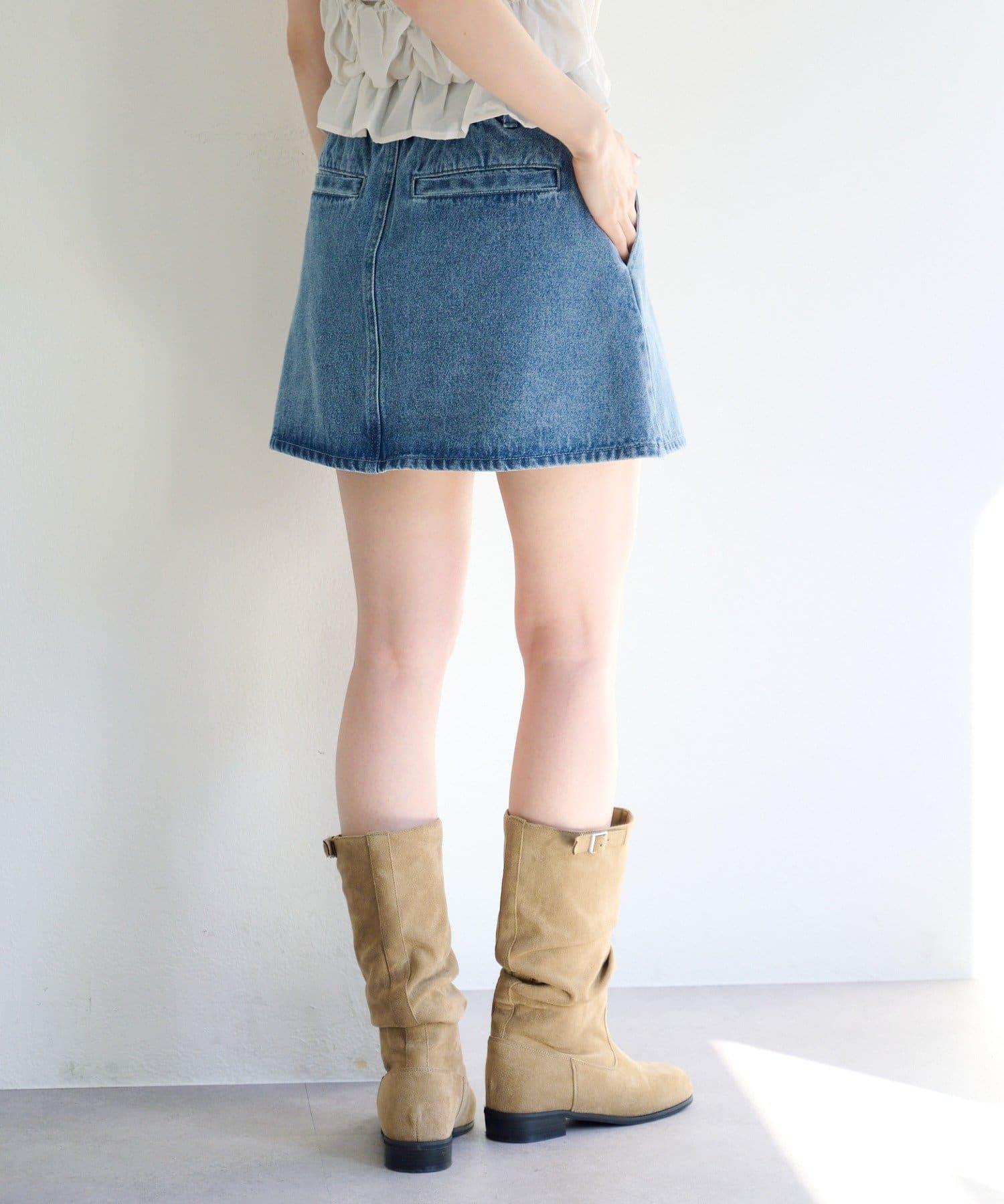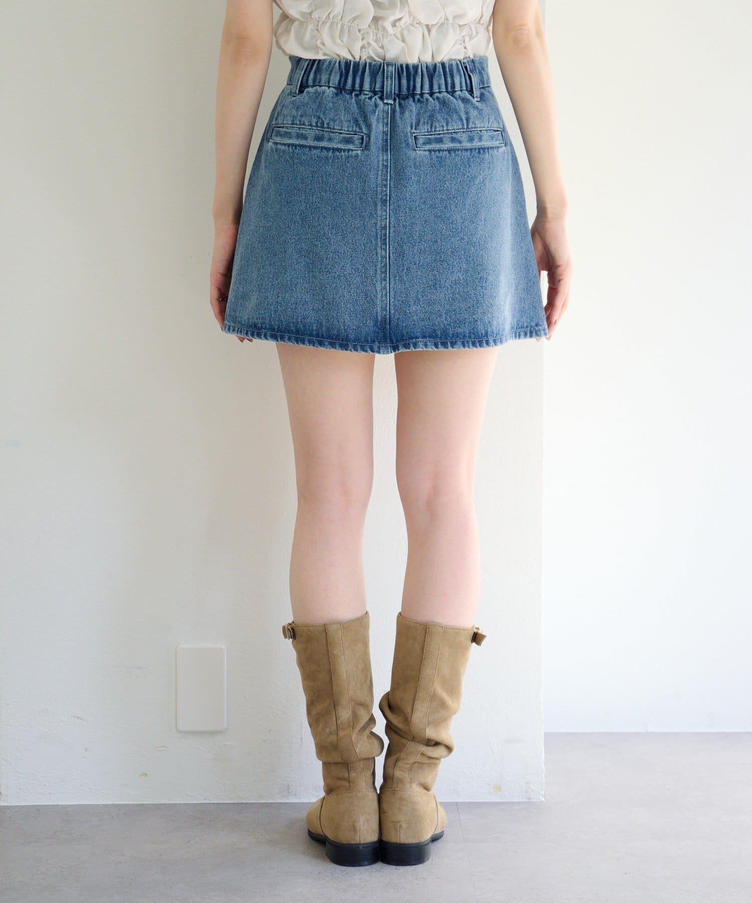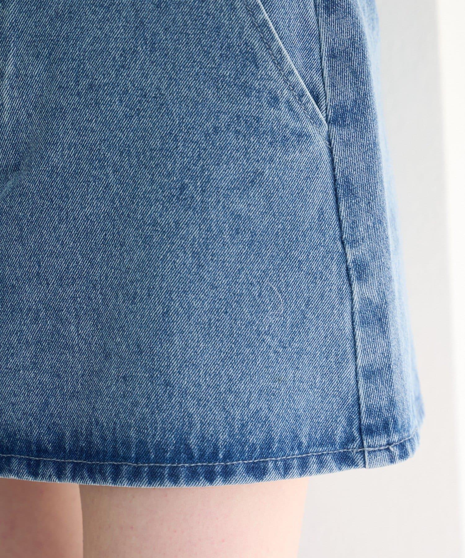 這款牛仔迷你裙的前襟採用翻邊設計。