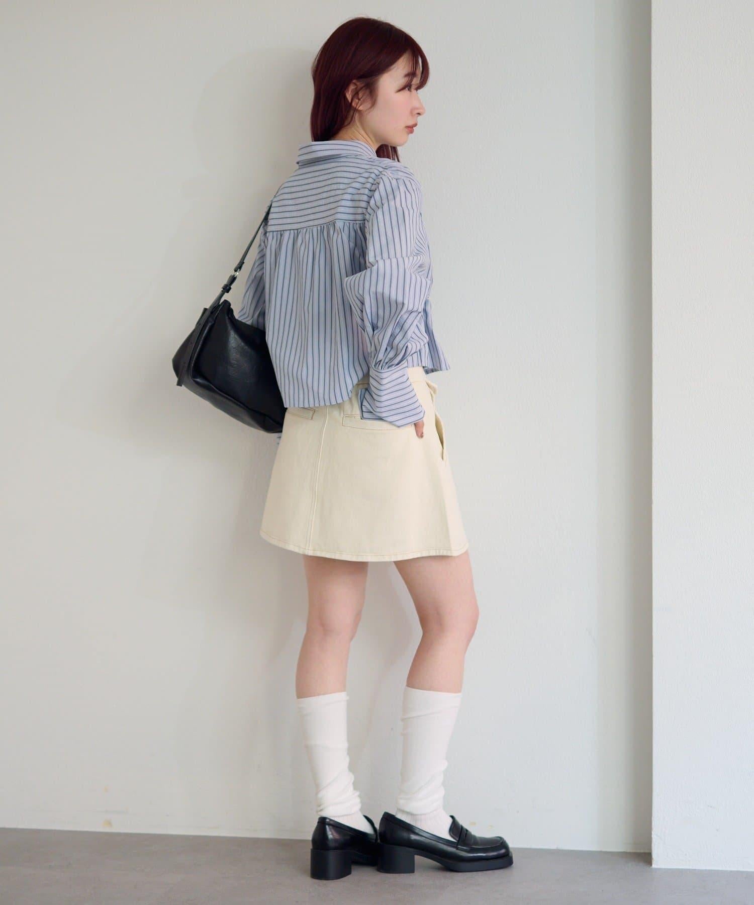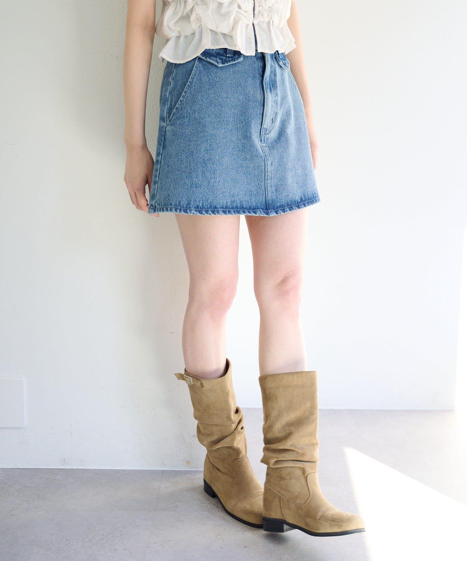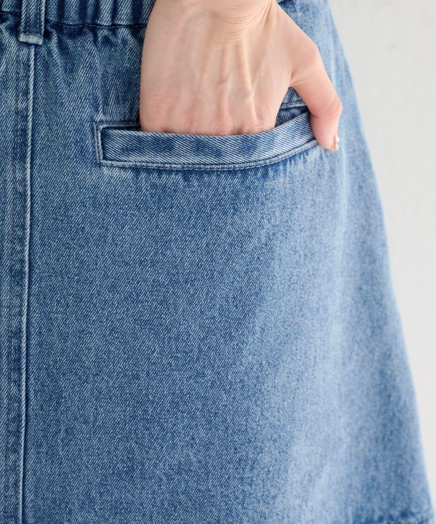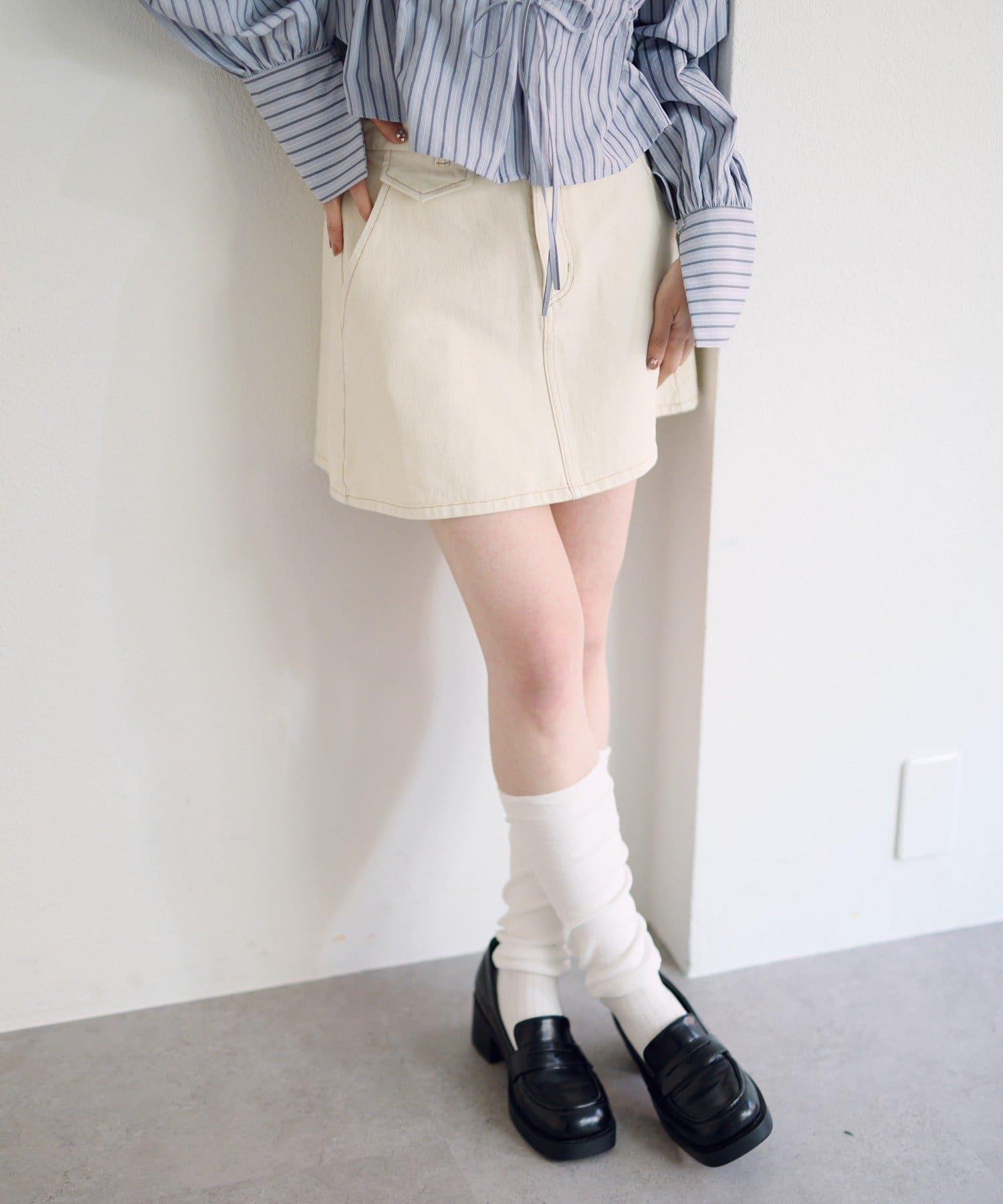 這款牛仔迷你裙的前襟採用翻邊設計。