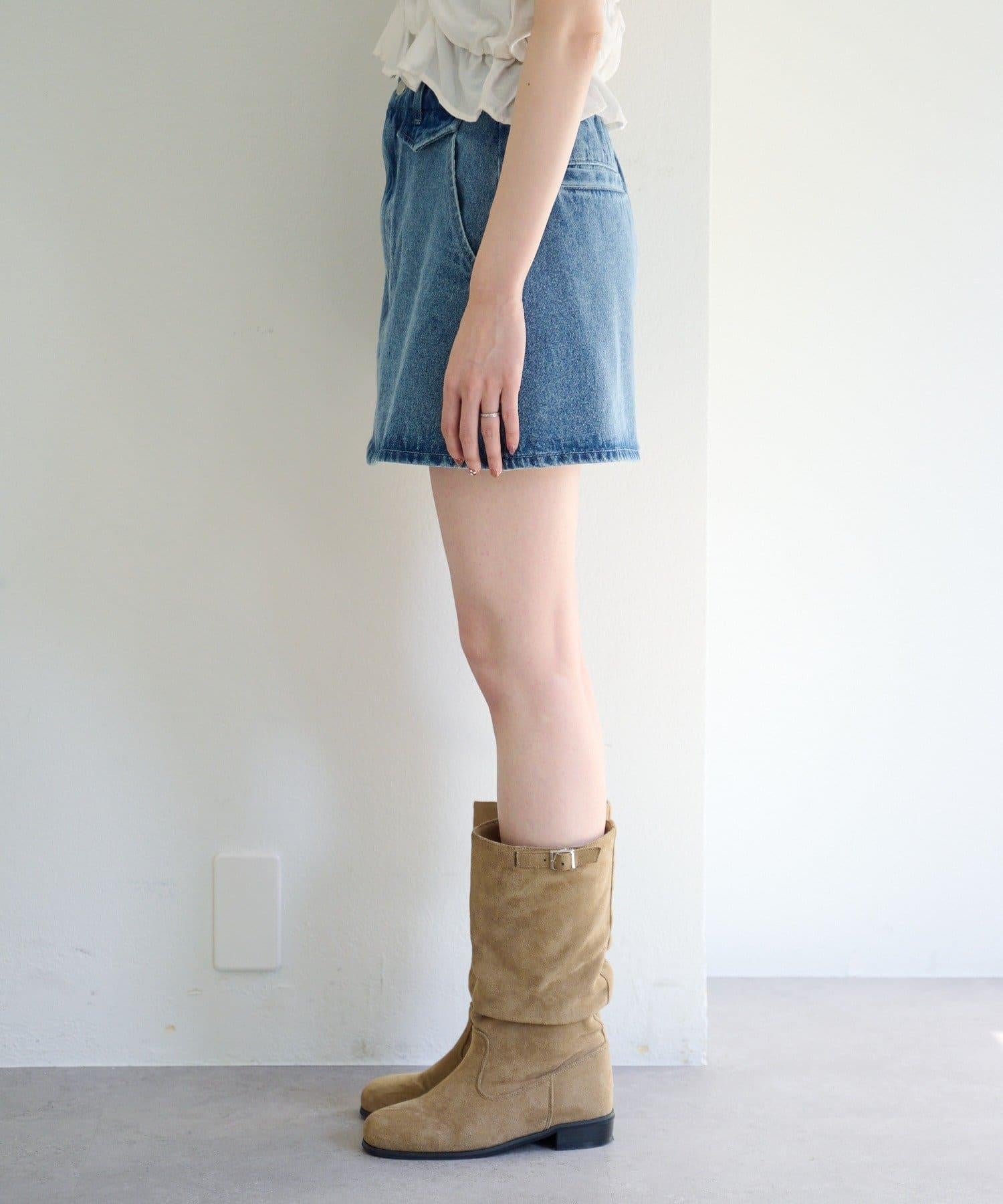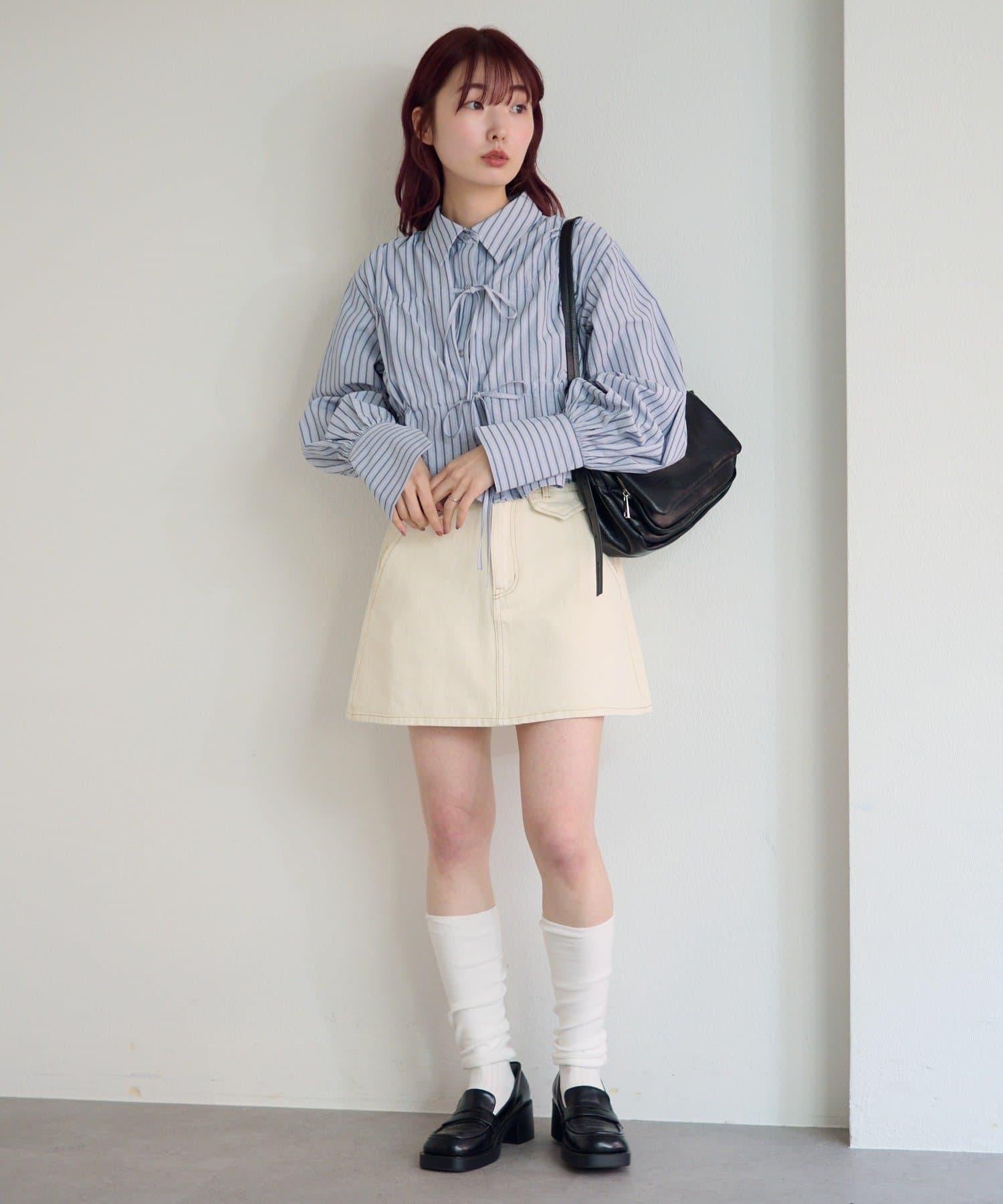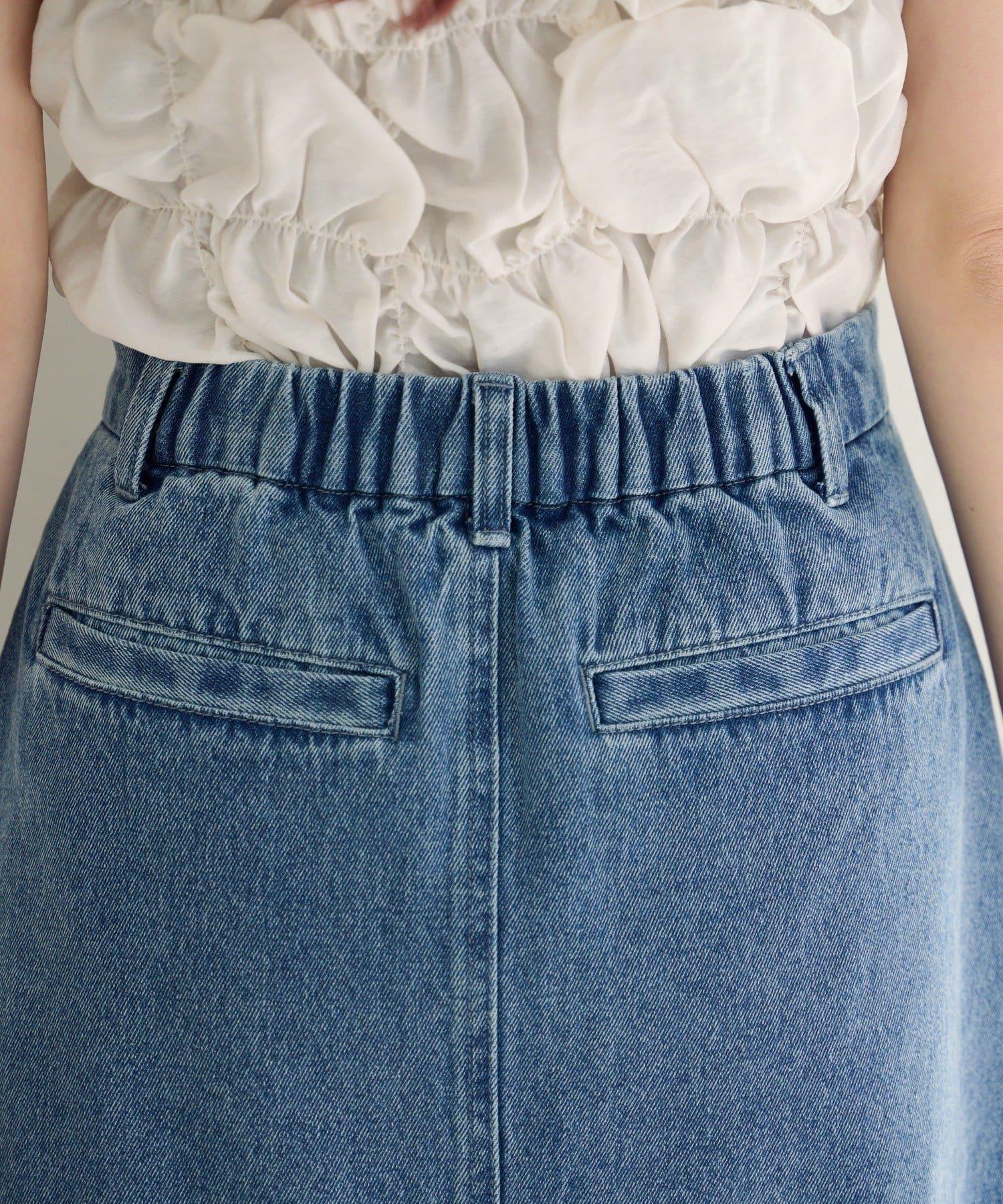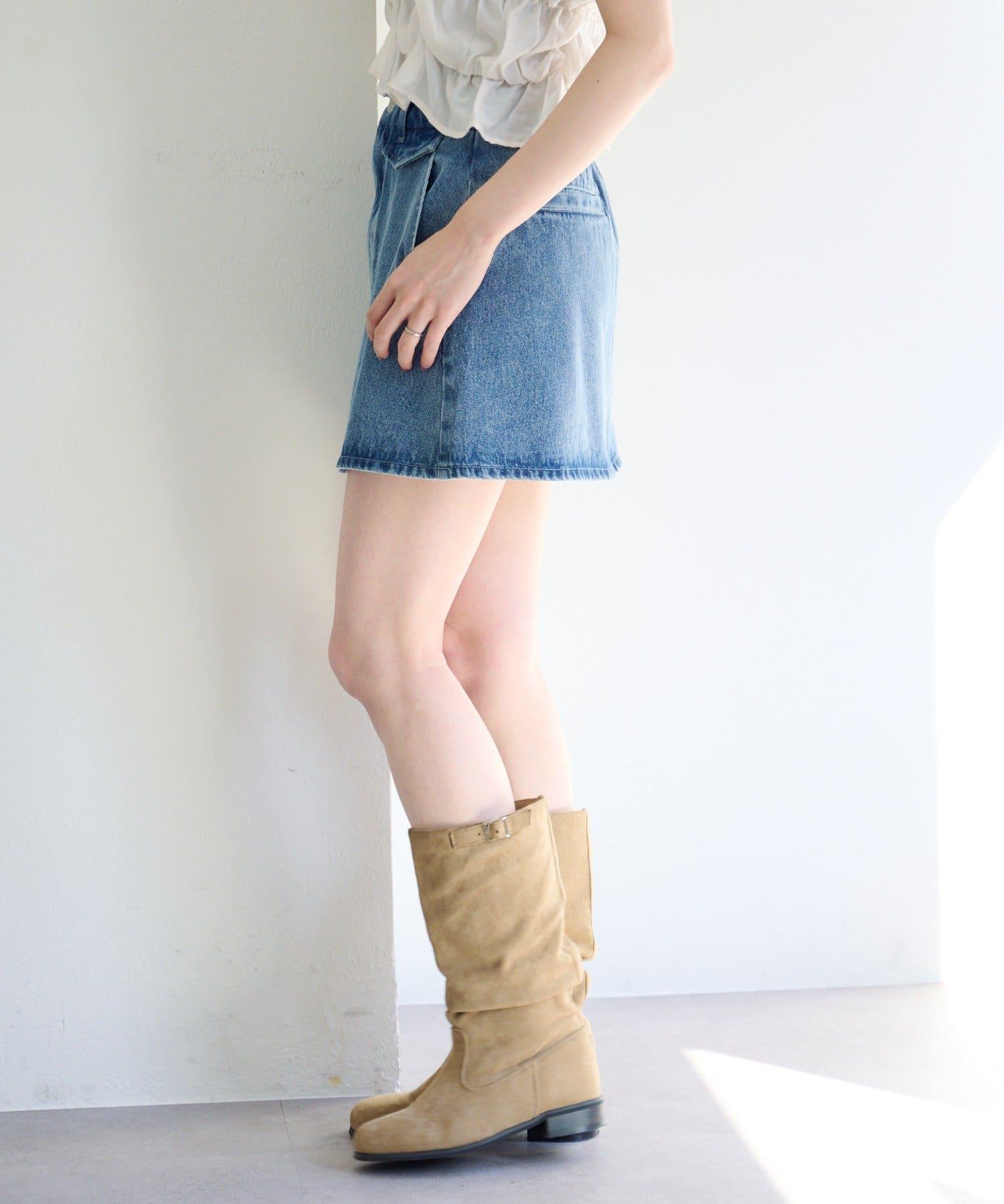 這款牛仔迷你裙的前襟採用翻邊設計。