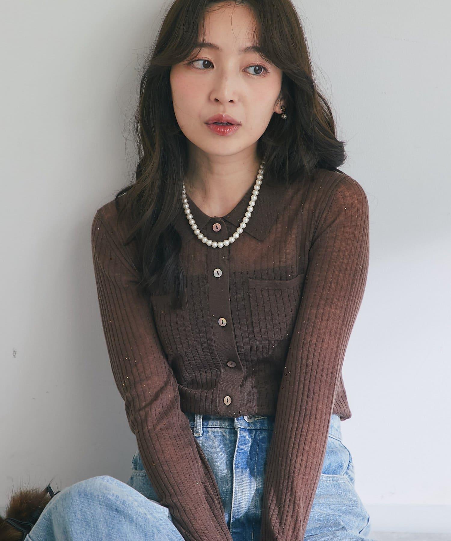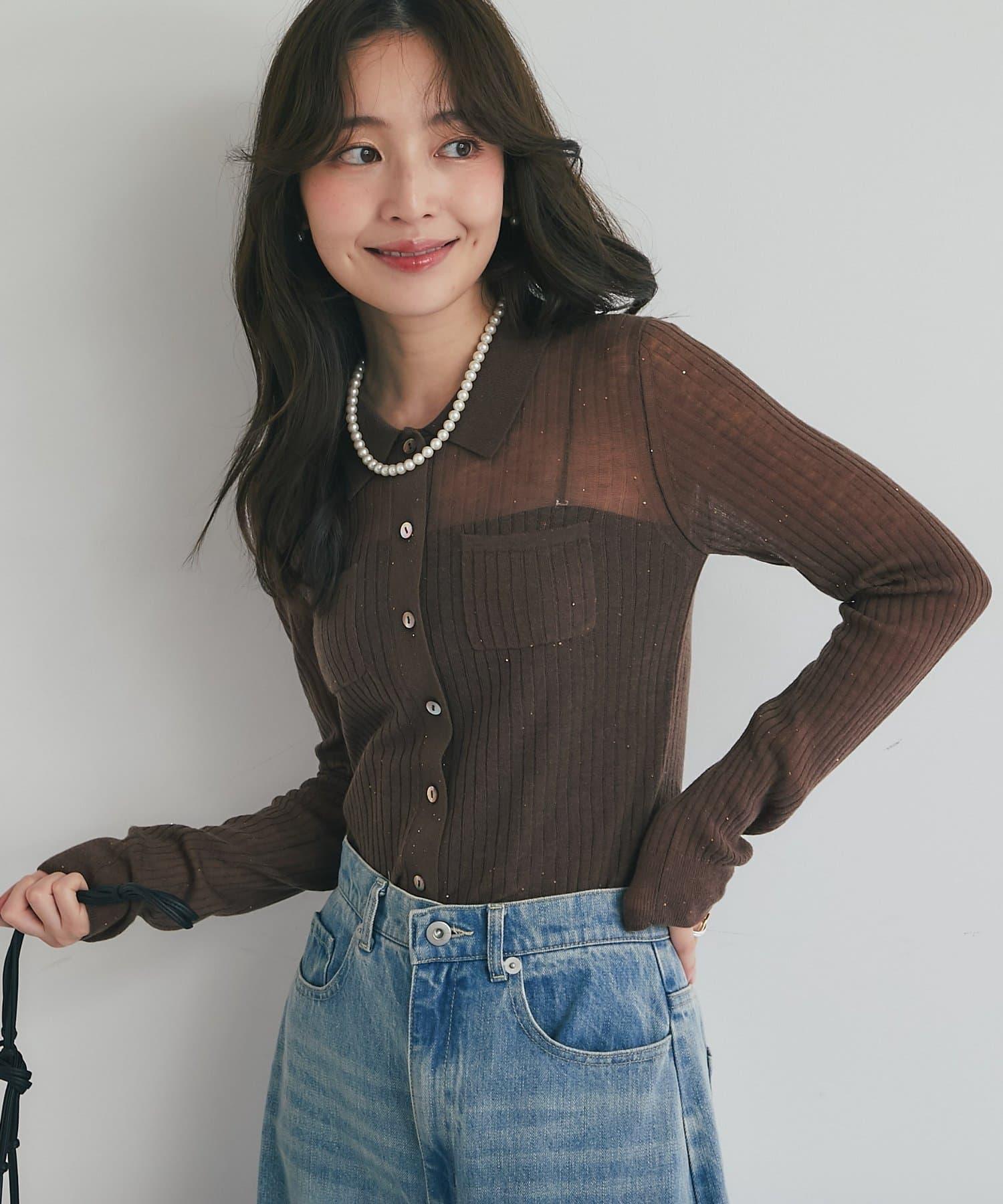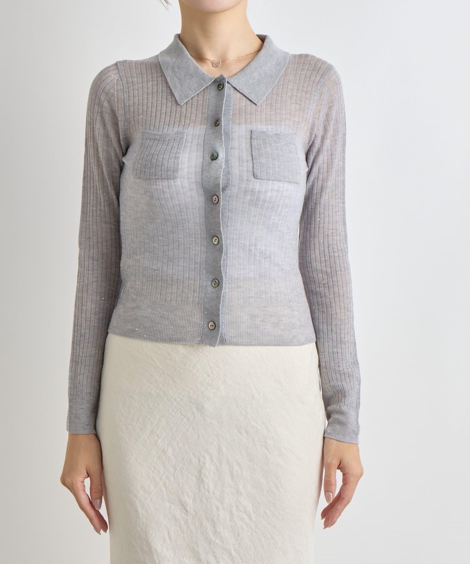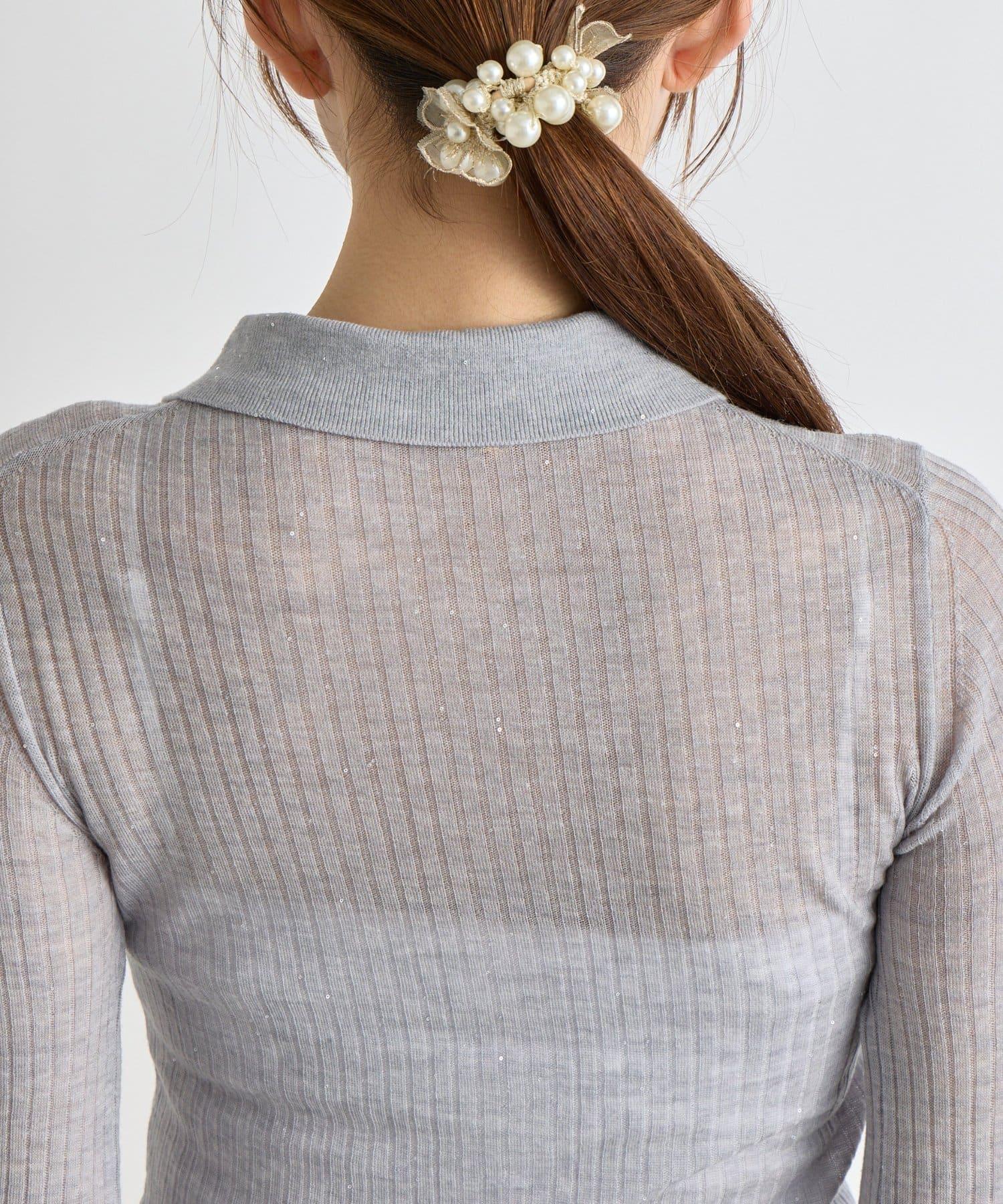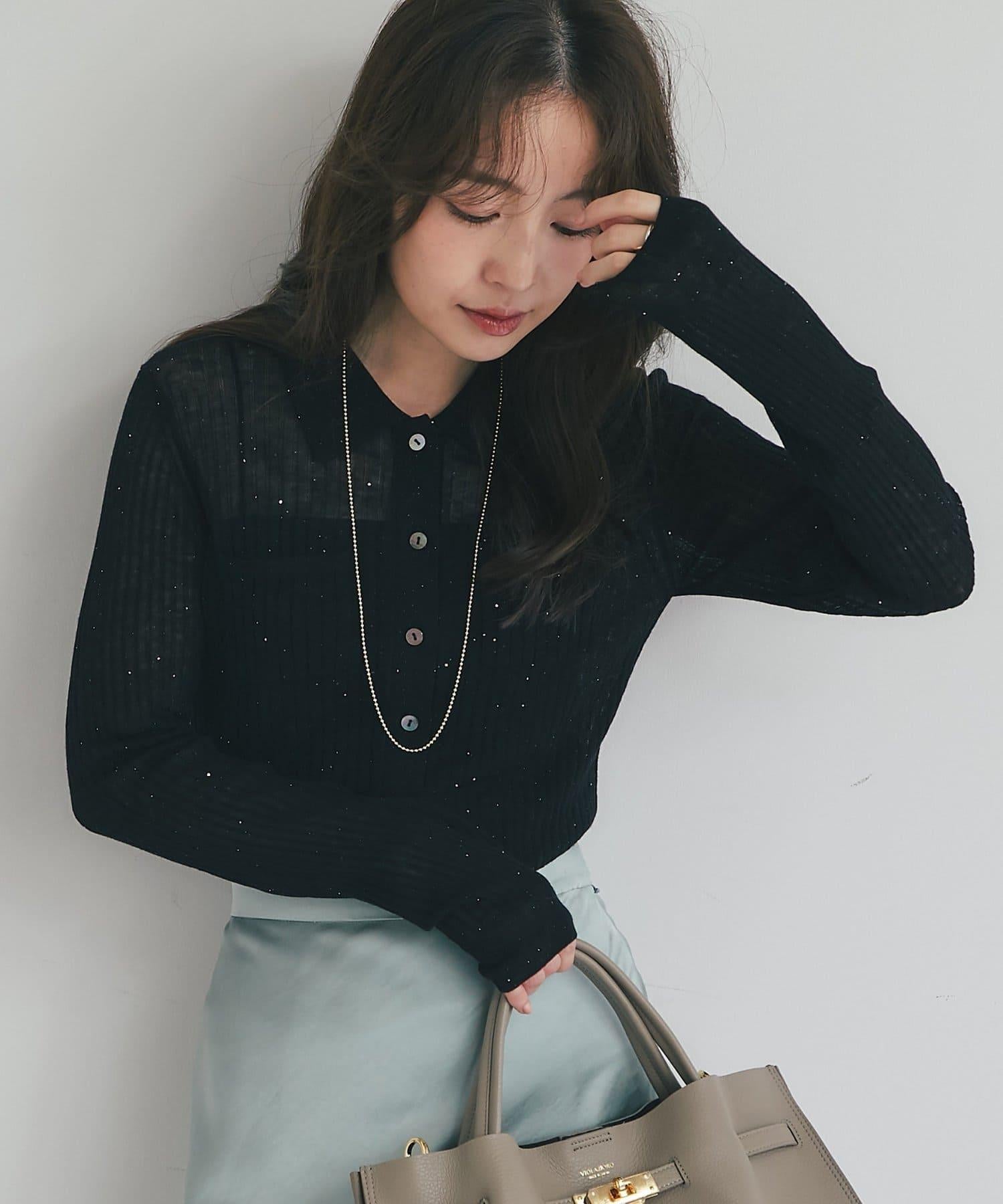 【成熟感透視針織衫】透視亮片翻領羅紋針織衫
