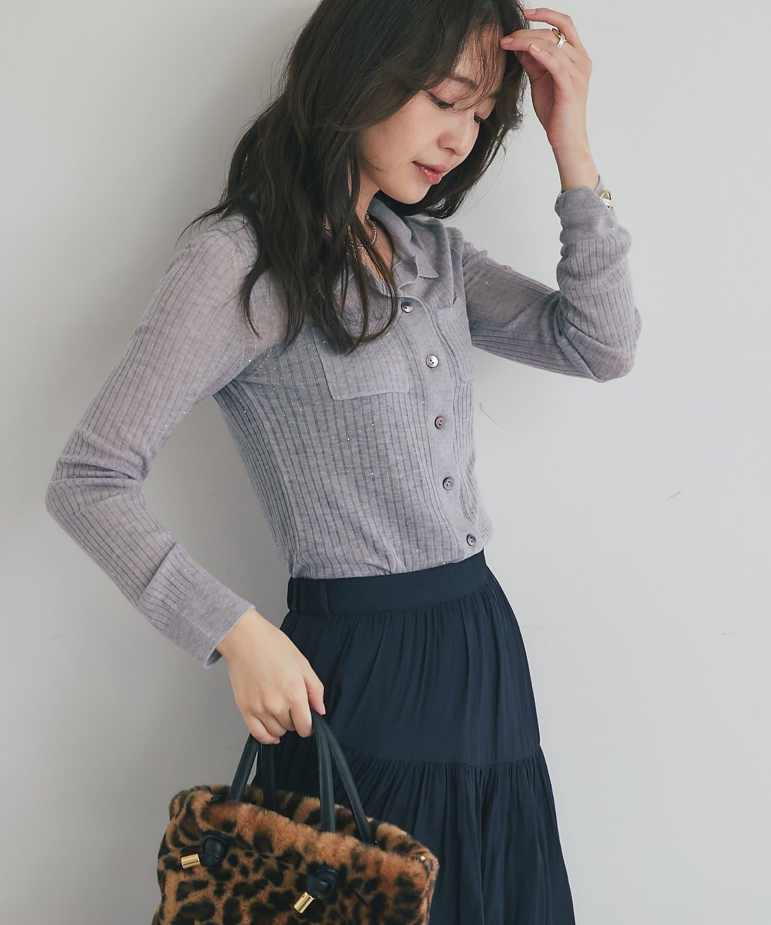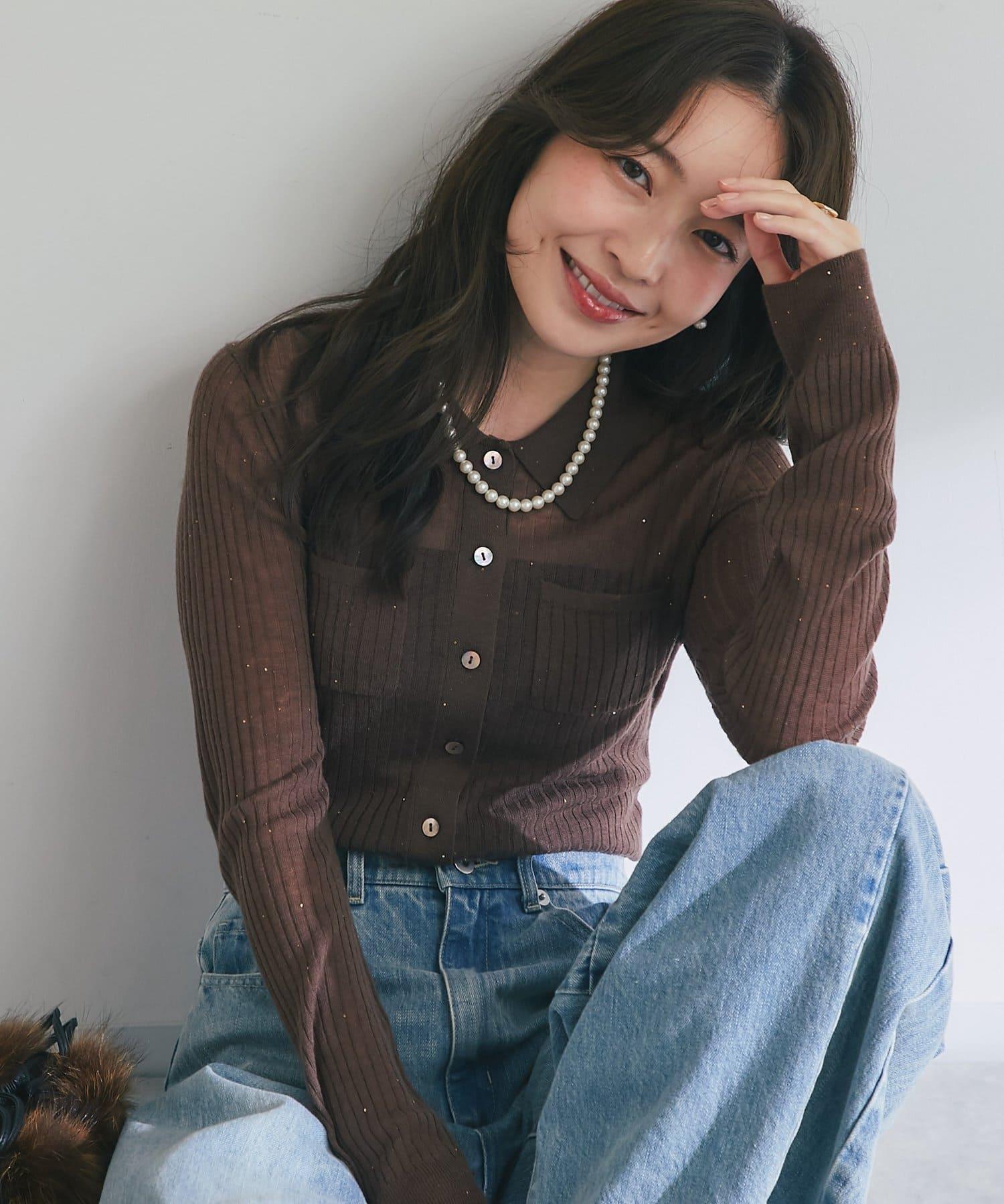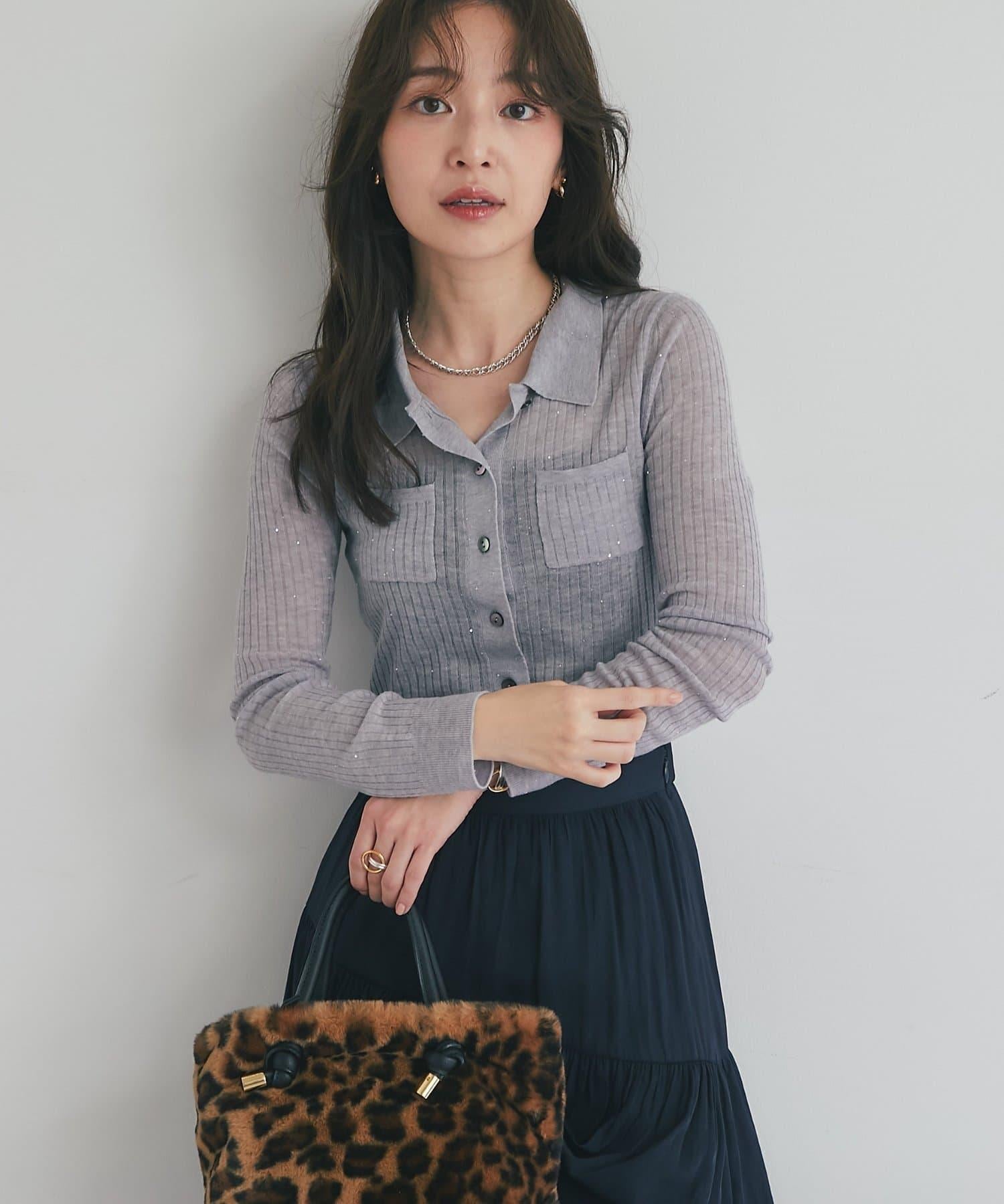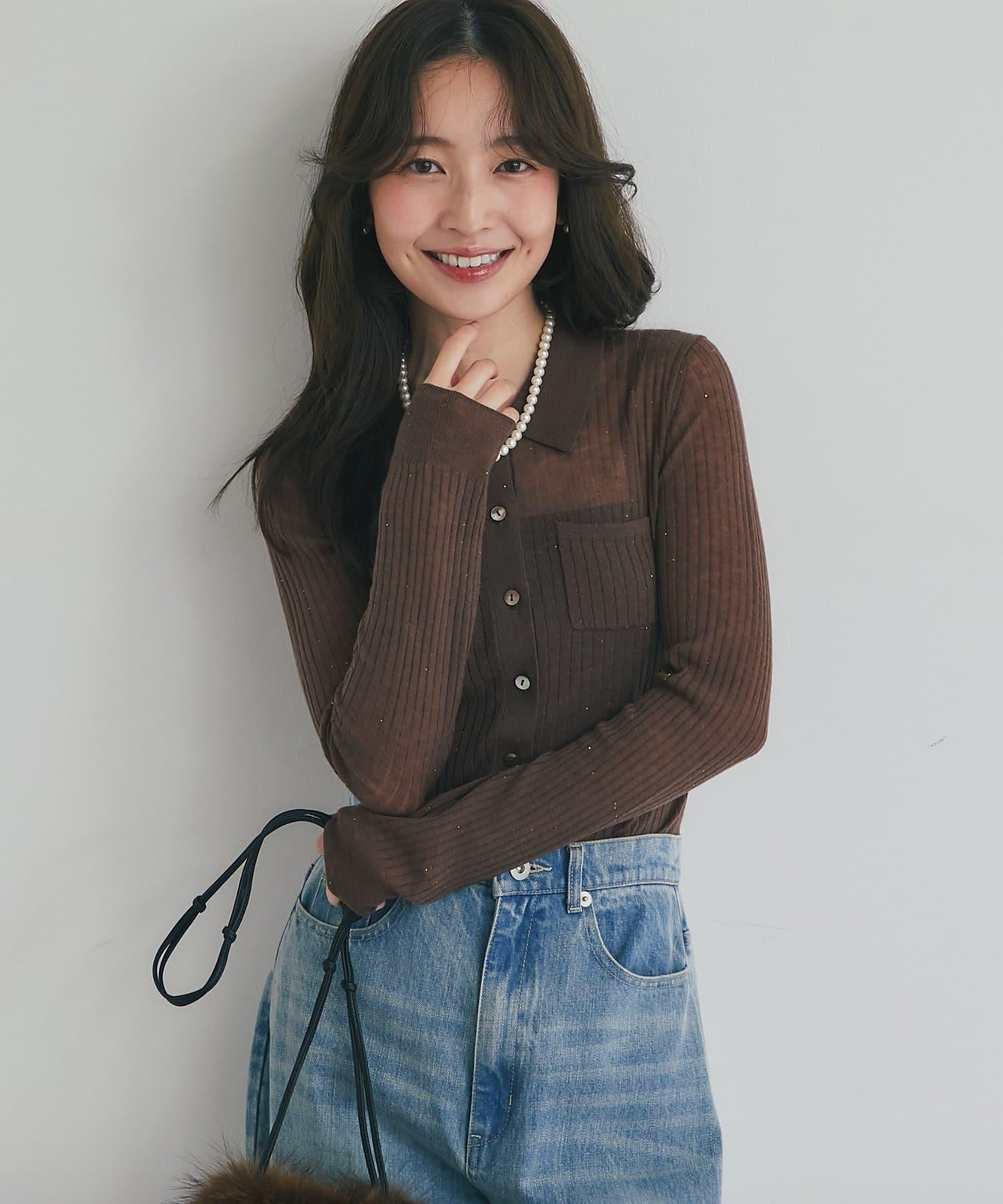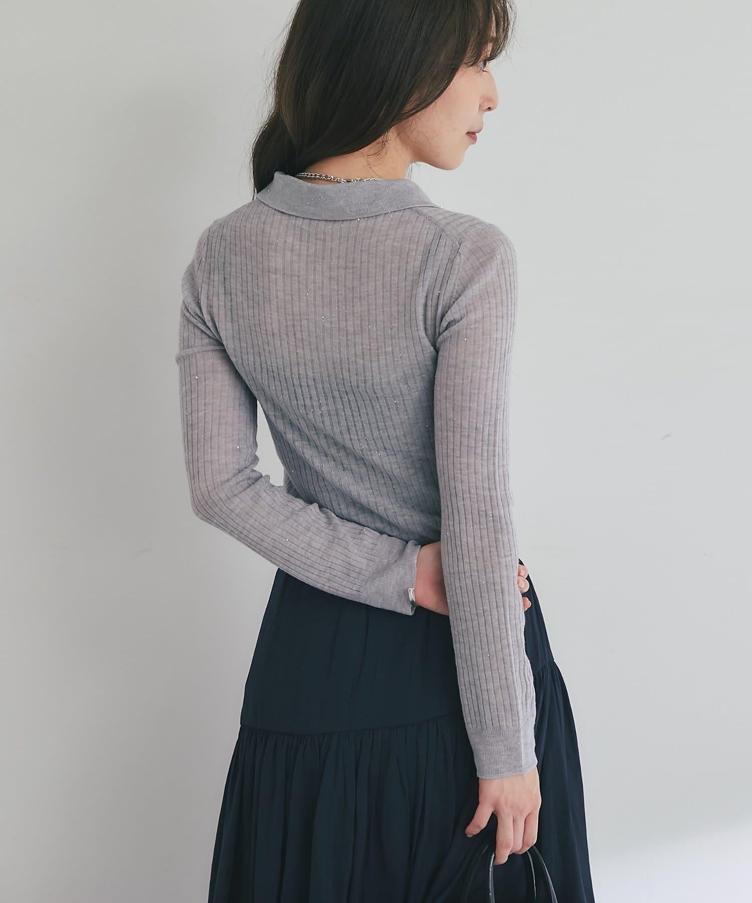 【成熟感透視針織衫】透視亮片翻領羅紋針織衫