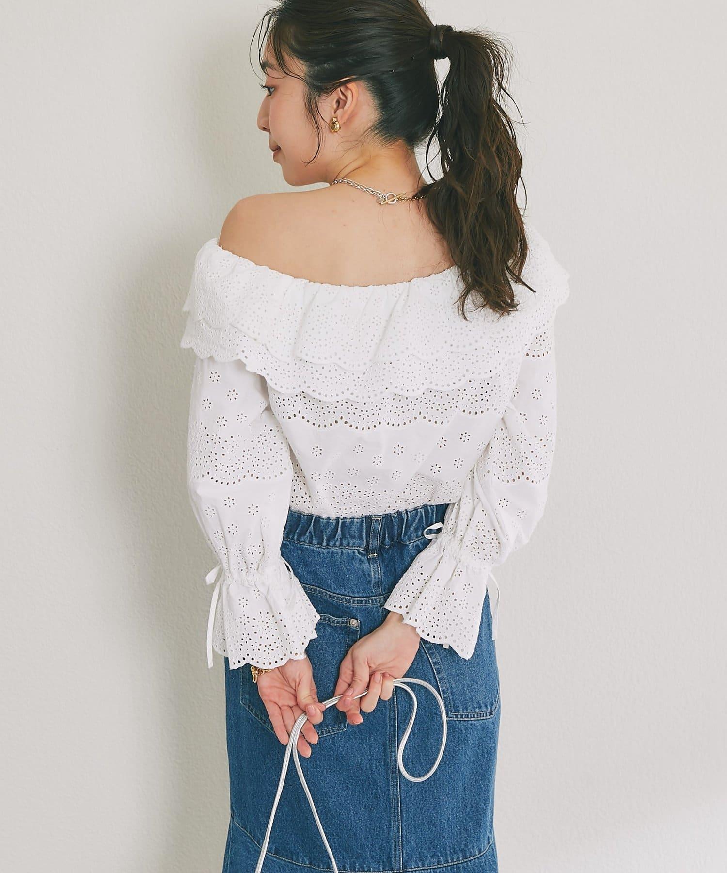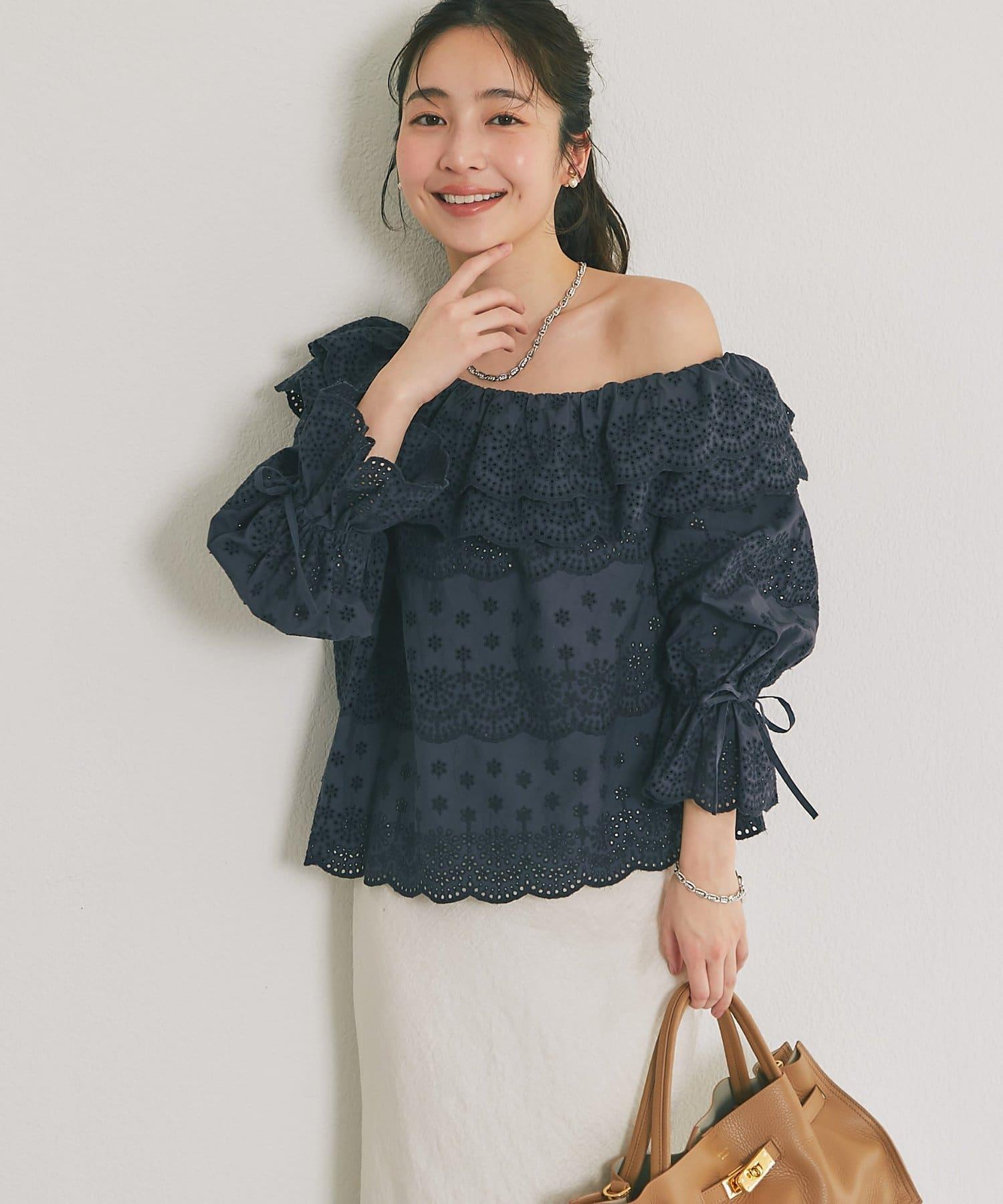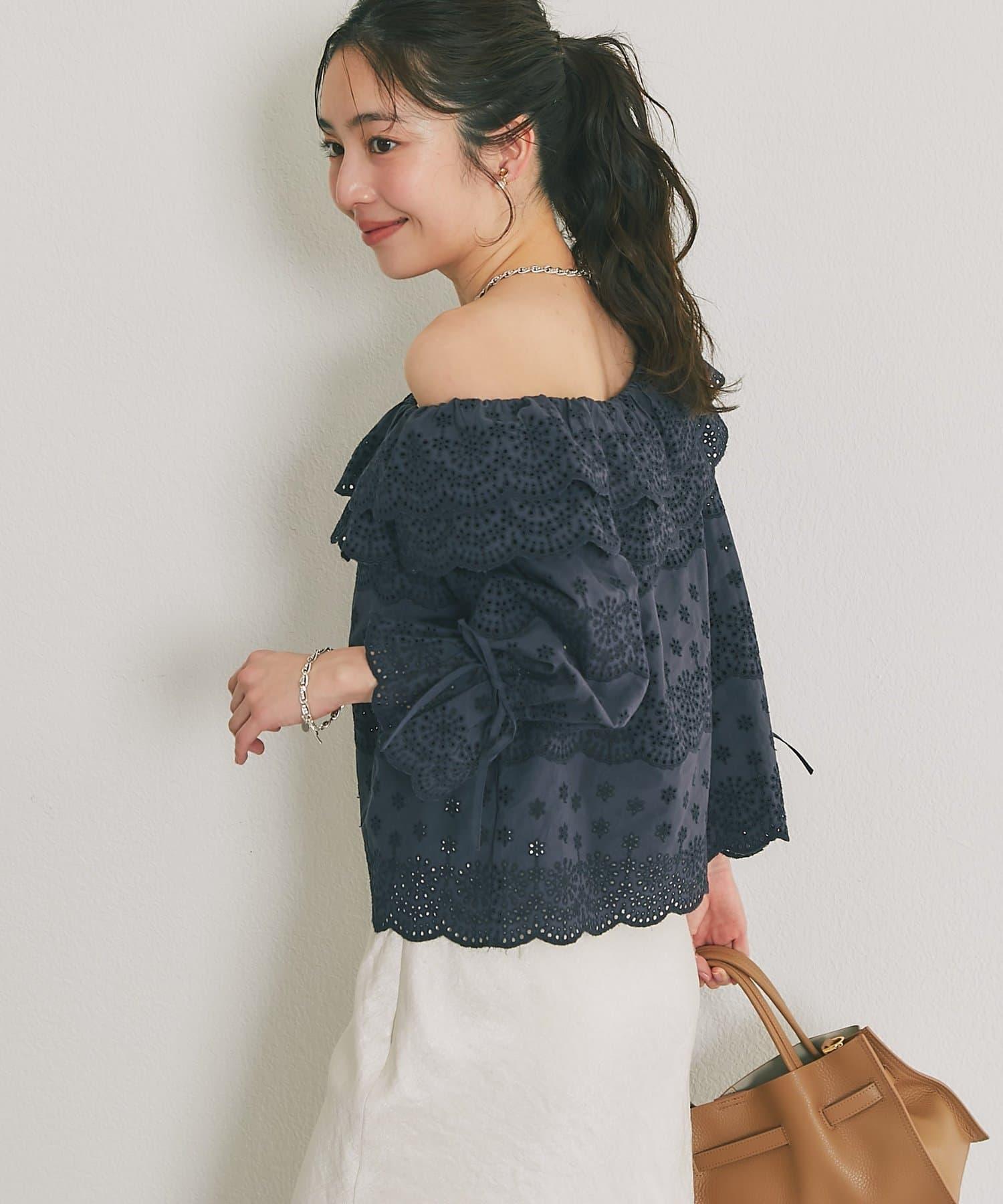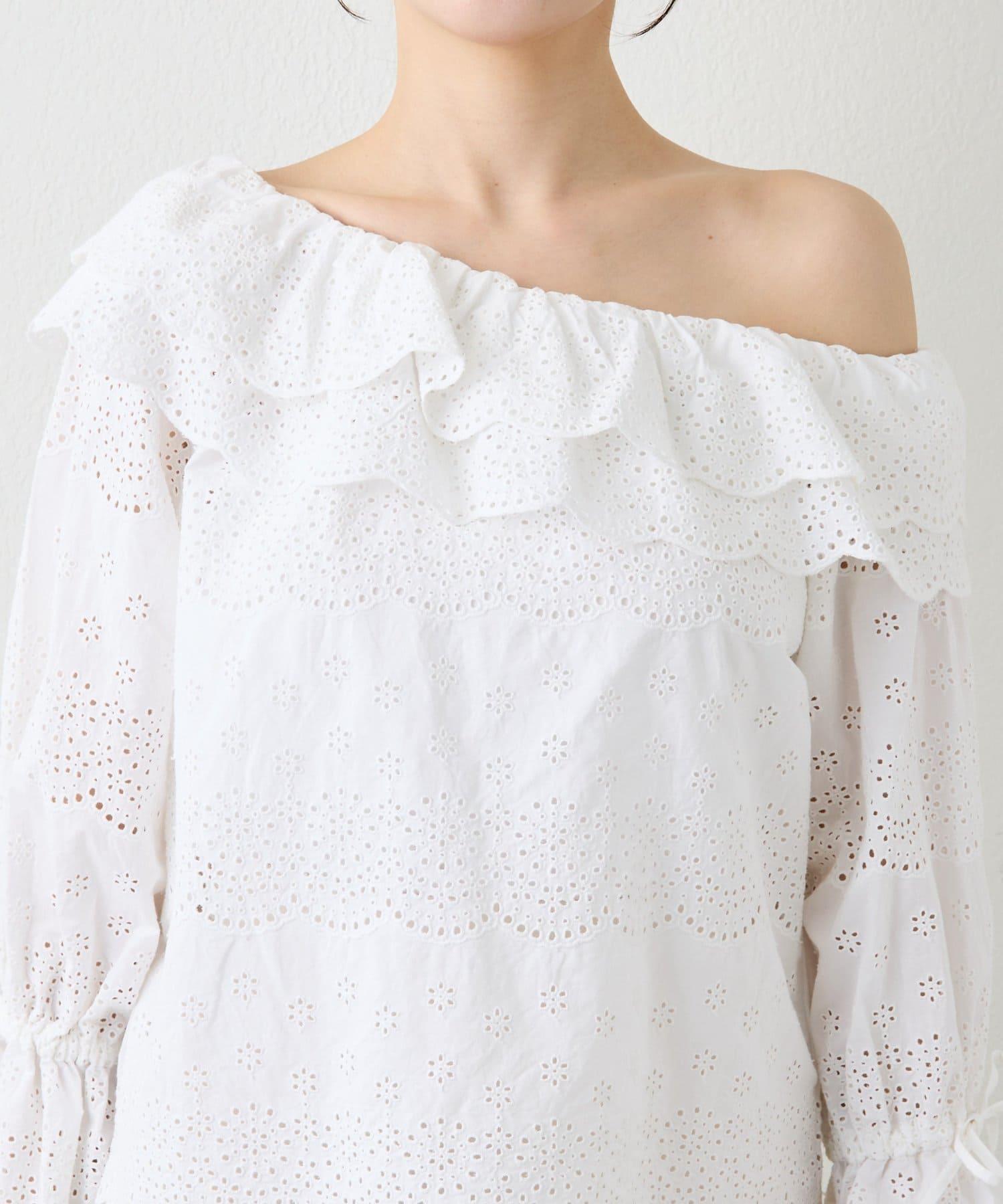 單肩流蘇設計上衣,飾有扇形刺繡。