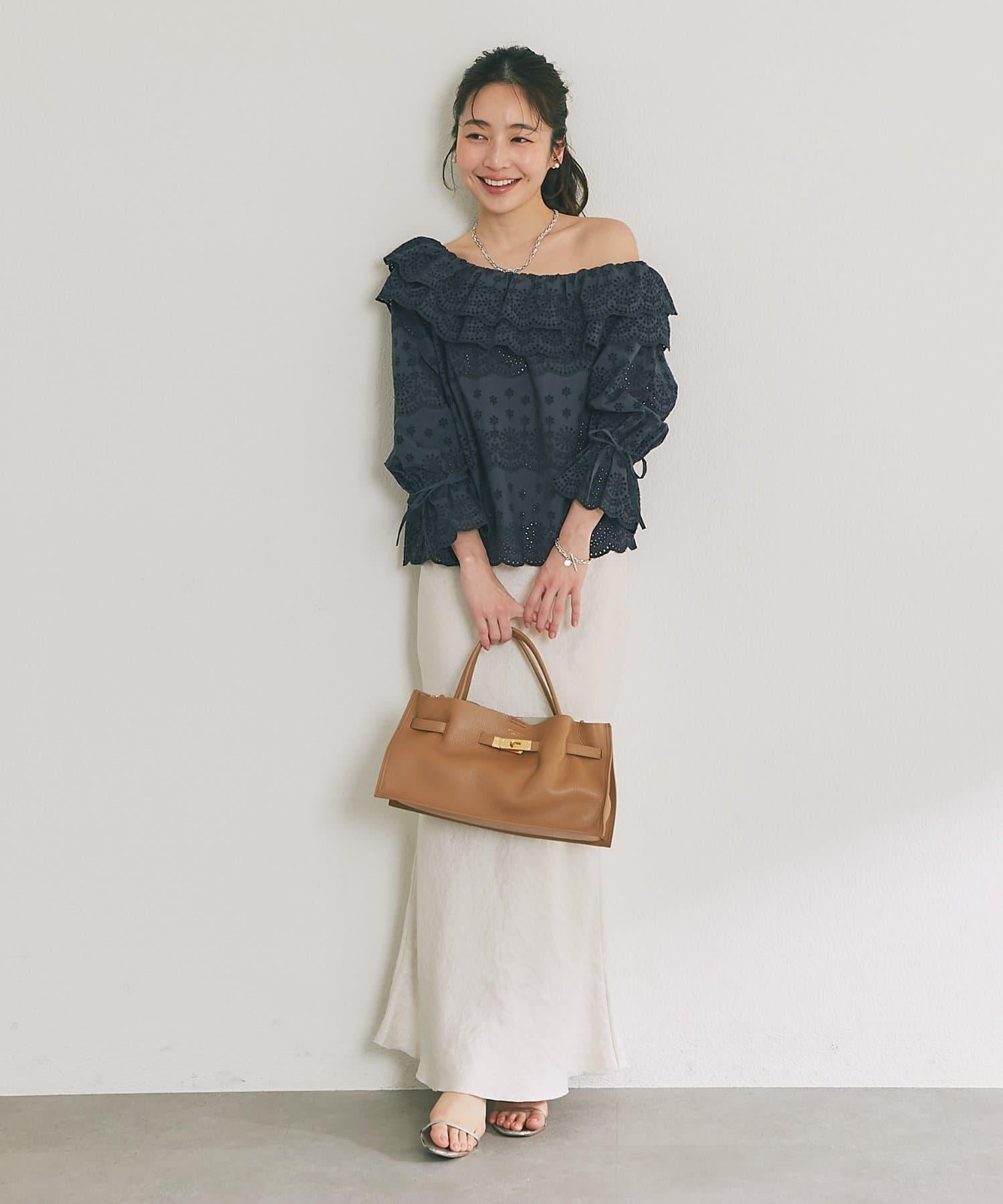 兩層流蘇的廓形充滿女人味,大量的褶皺很好地展現了鎖骨和肩部線條。