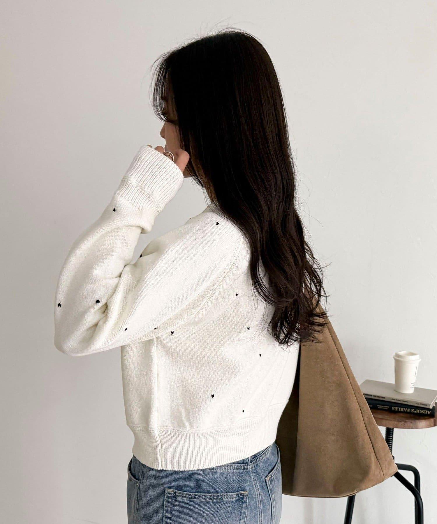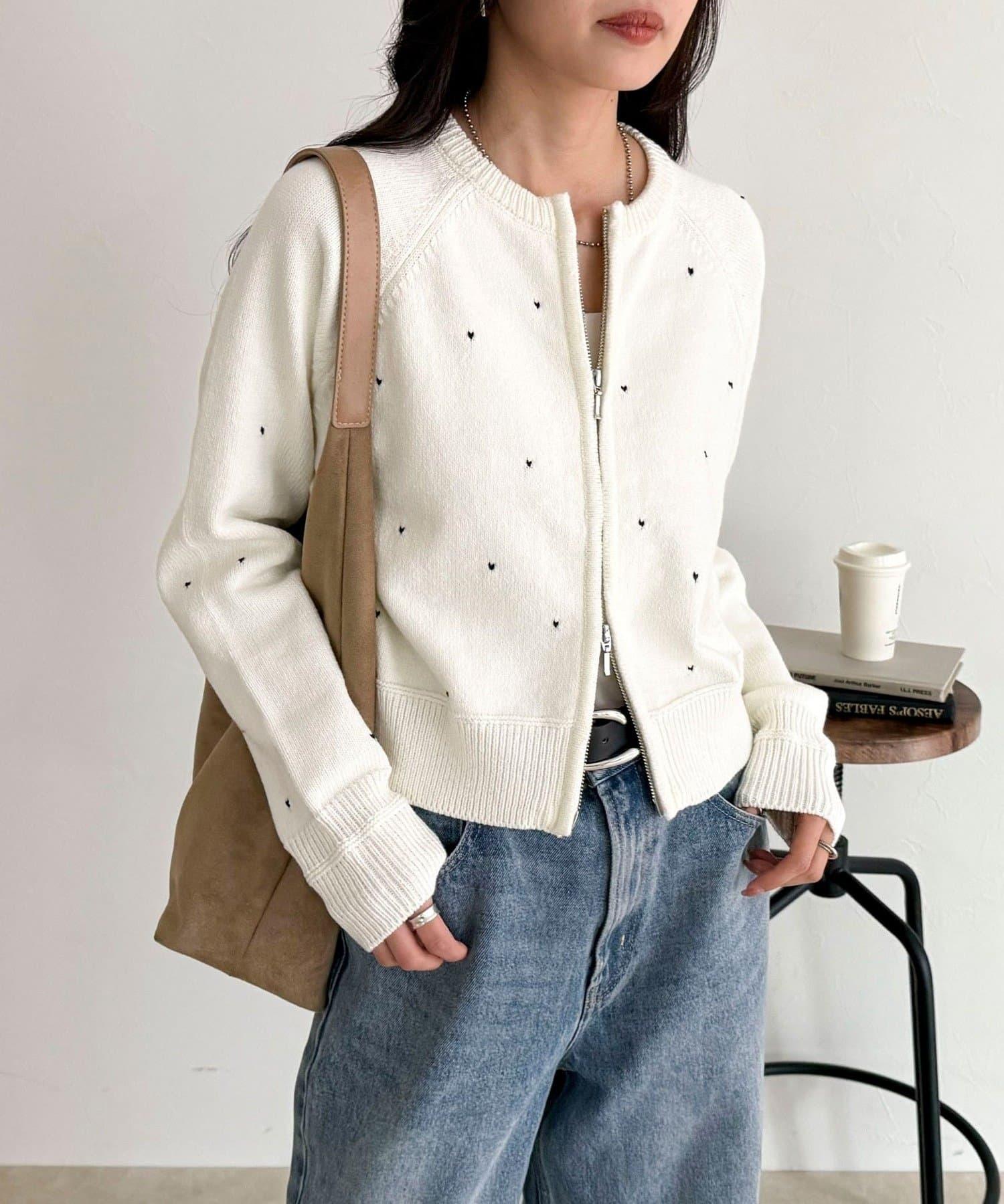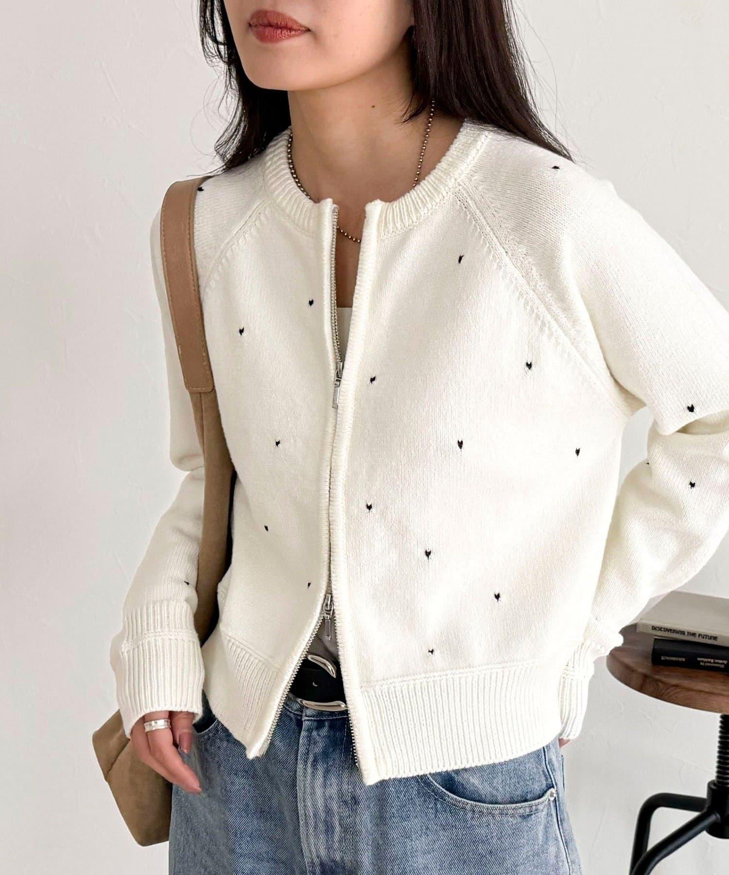 手工刺繡心形拉鍊開衫,讓你看起來像個可愛的成人。