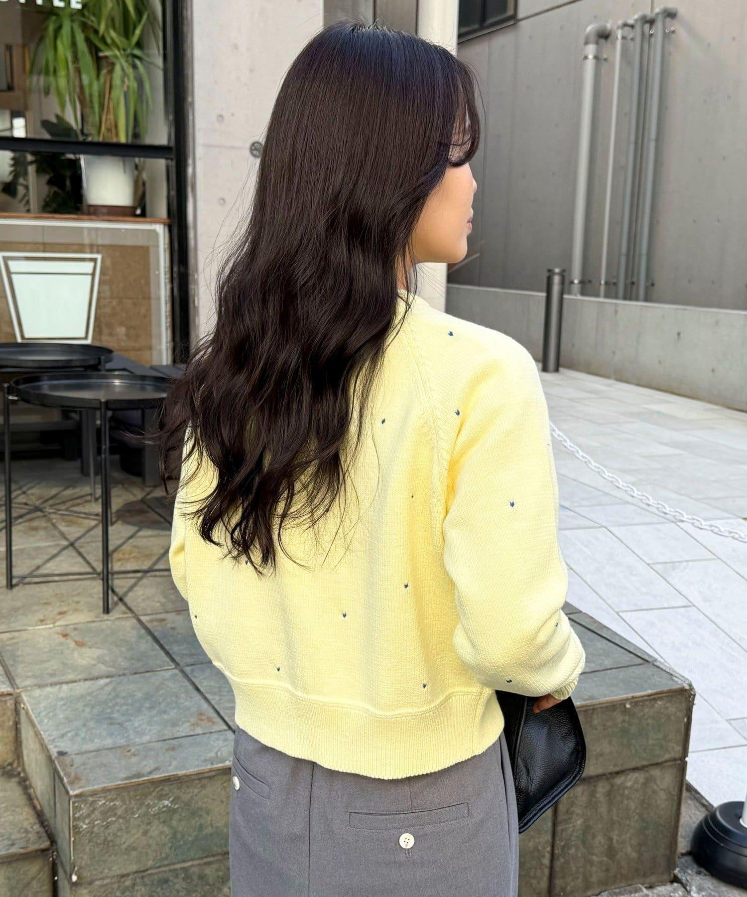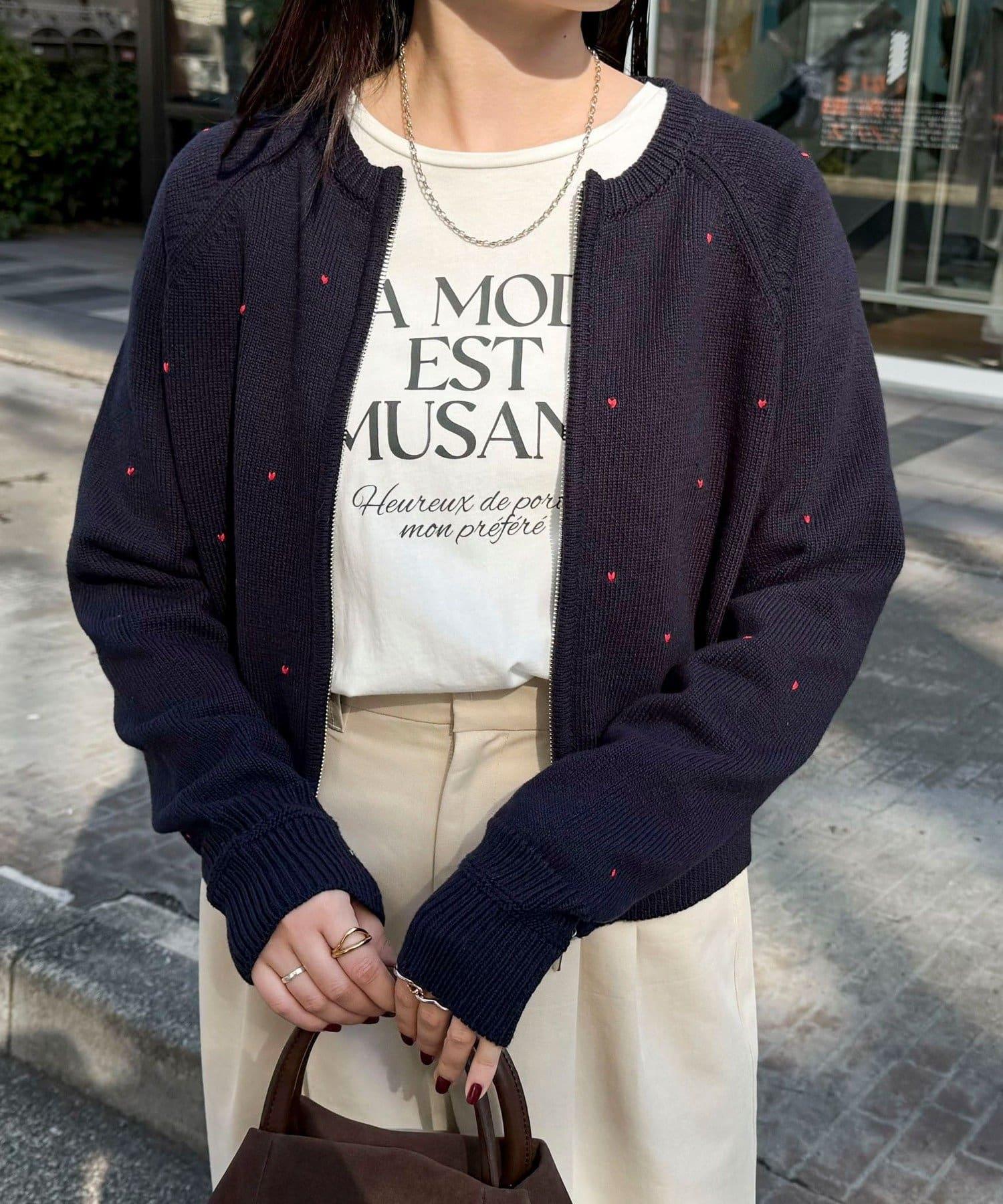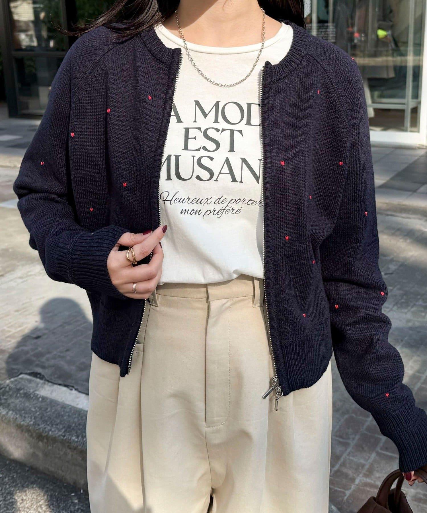 拉鍊開襟衫上的迷你心形刺繡巧妙地吸引了人們的眼球。