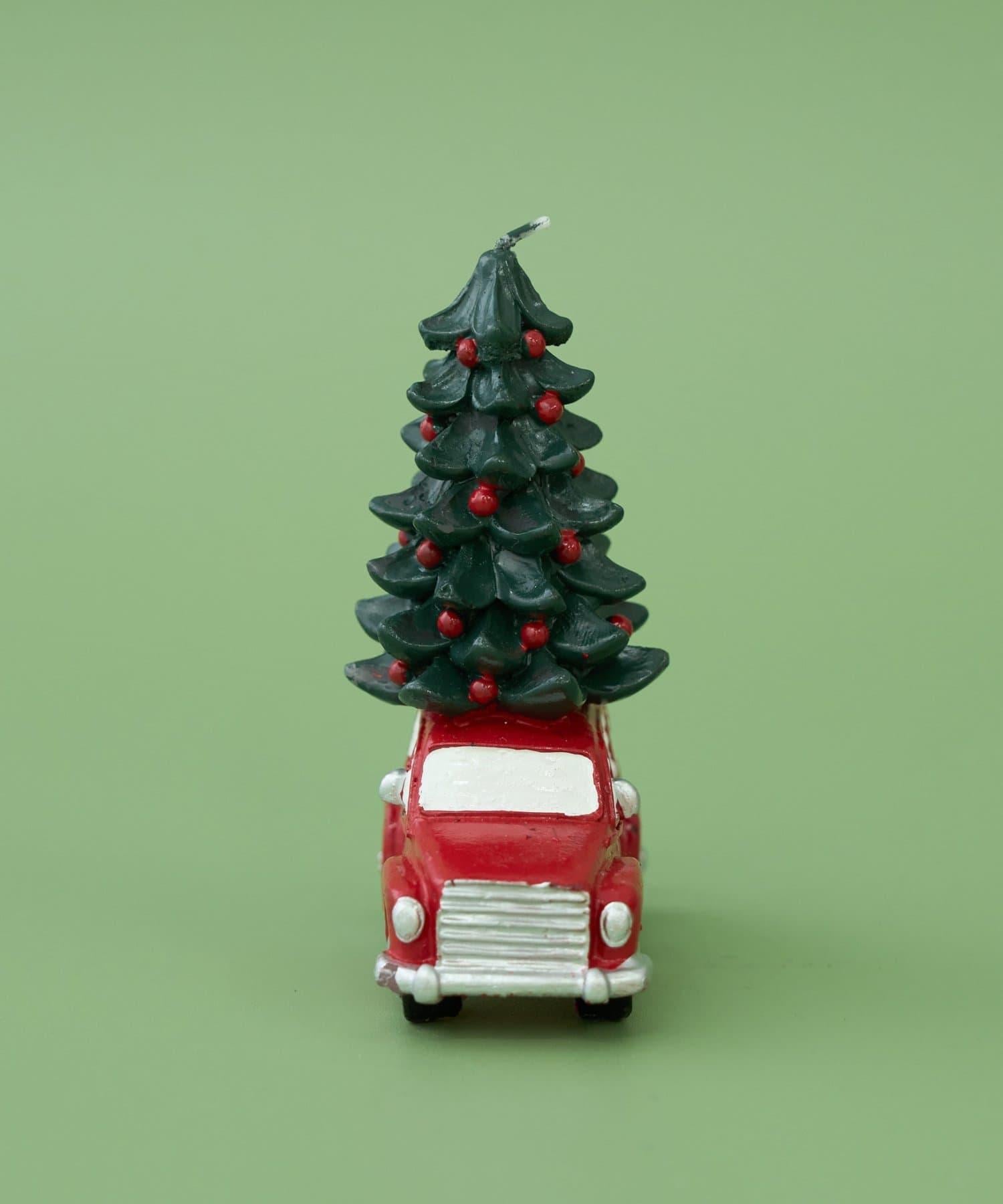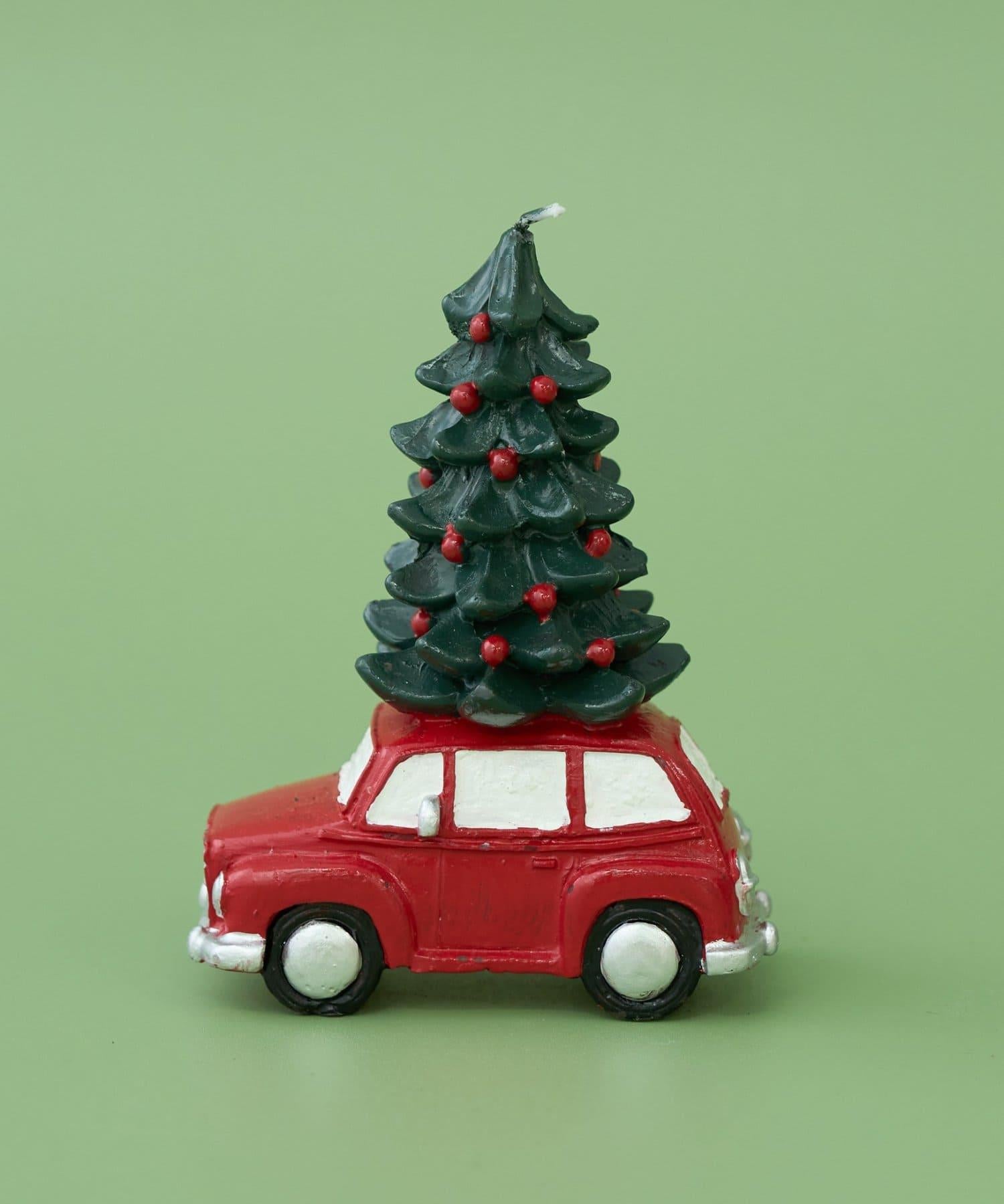 手工蠟燭上印有五顏六色的汽車,上面還有一棵樹。