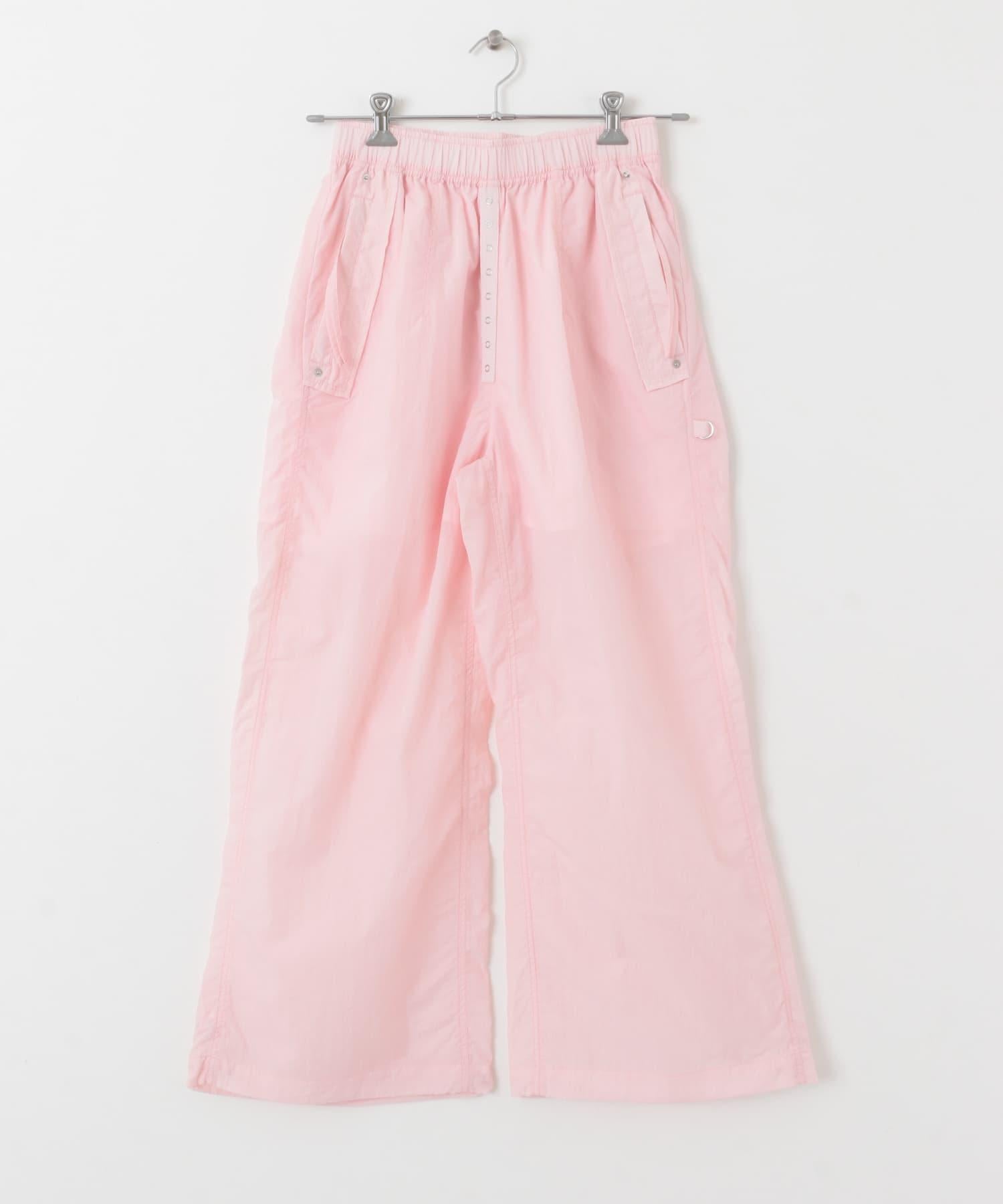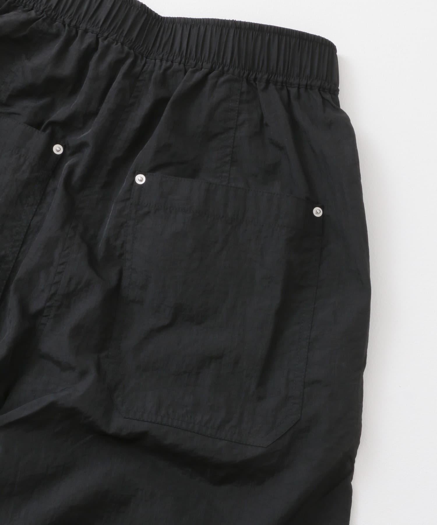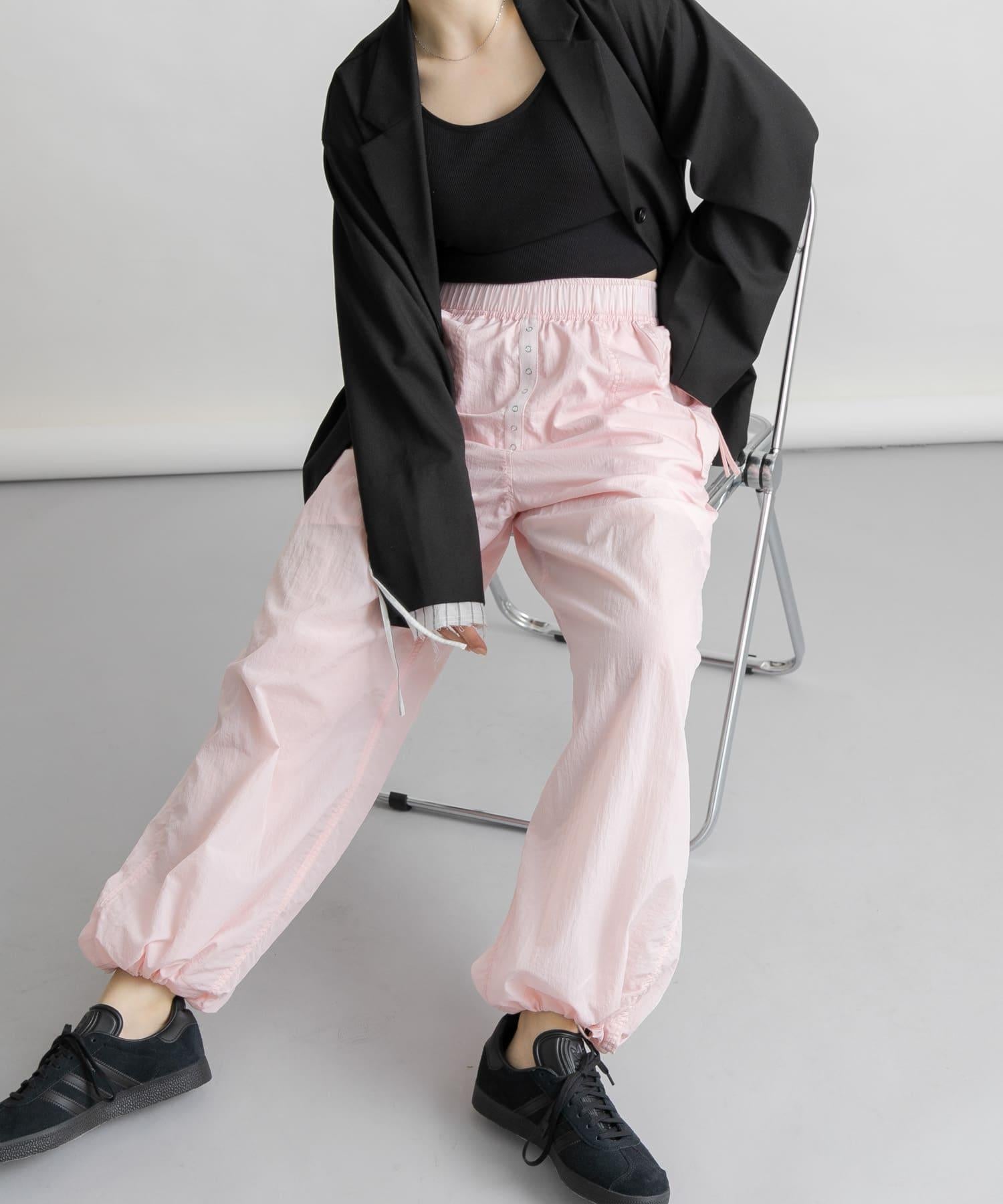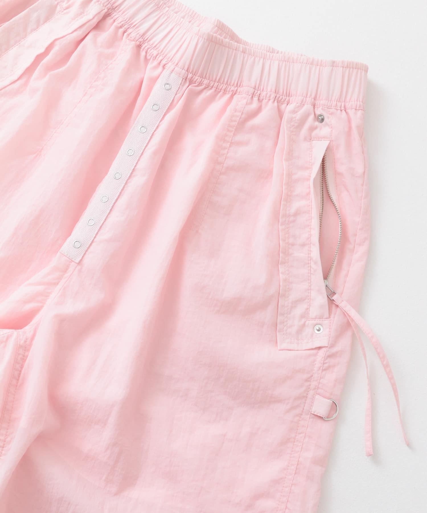 長褲採用輕盈透氣的尼龍材料製成。腰部的鬆緊帶設計使褲子更加寬鬆,下襬的抽繩設計讓您可以盡情變換褲型。正面的環形點帶和口袋上的拉鍊也是為這款單品增色不少的微妙細節。