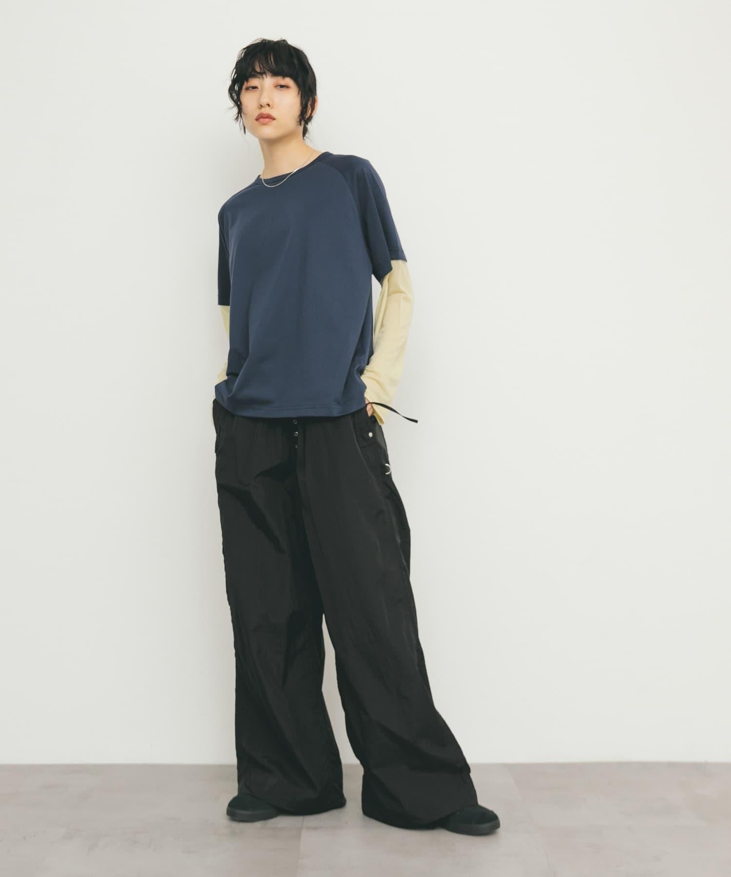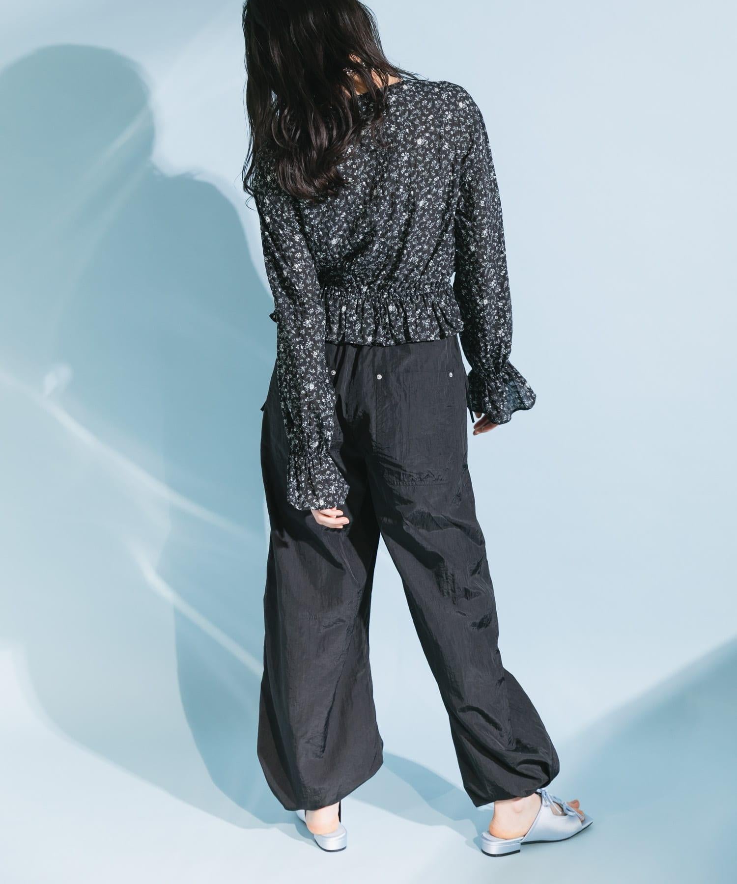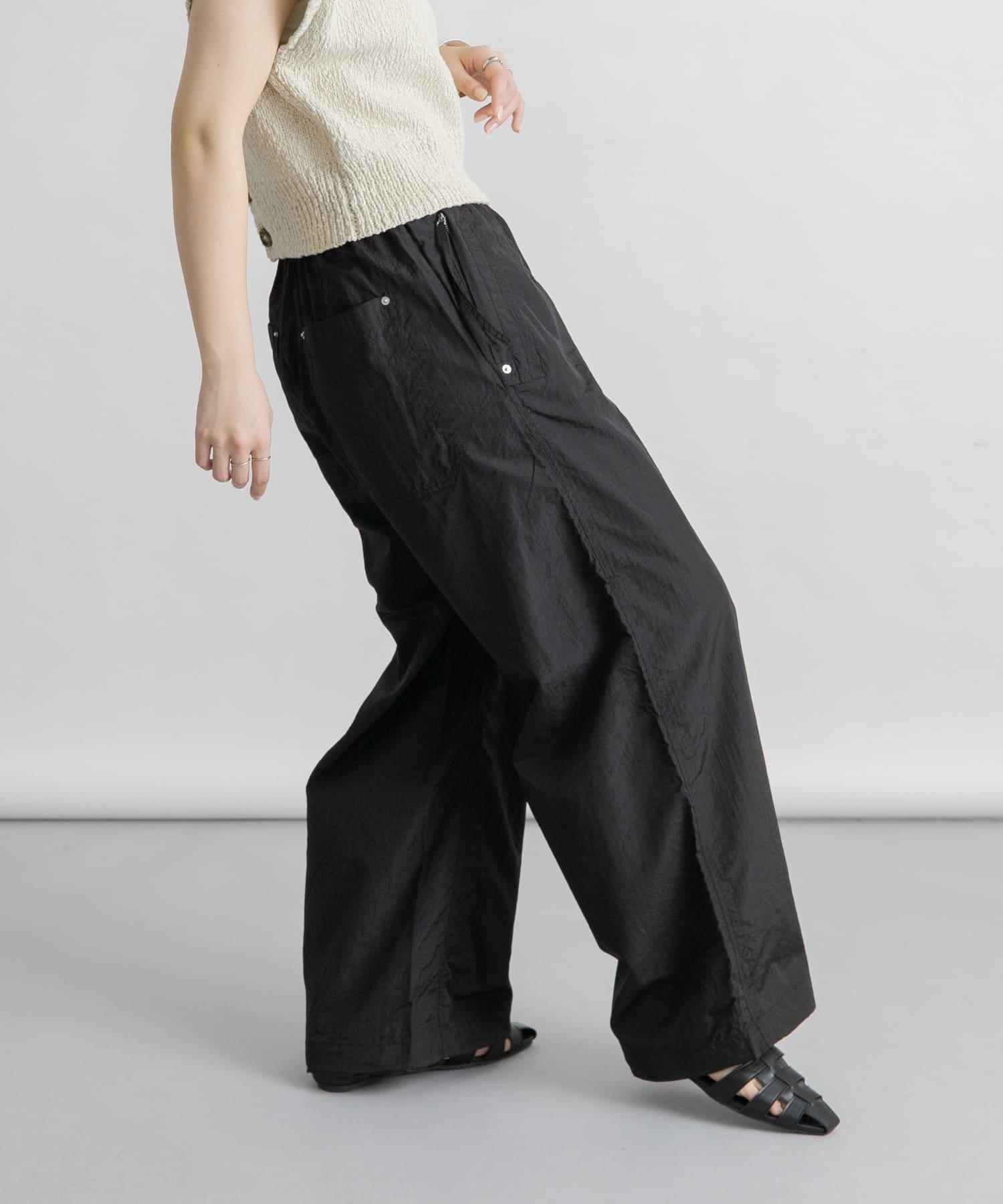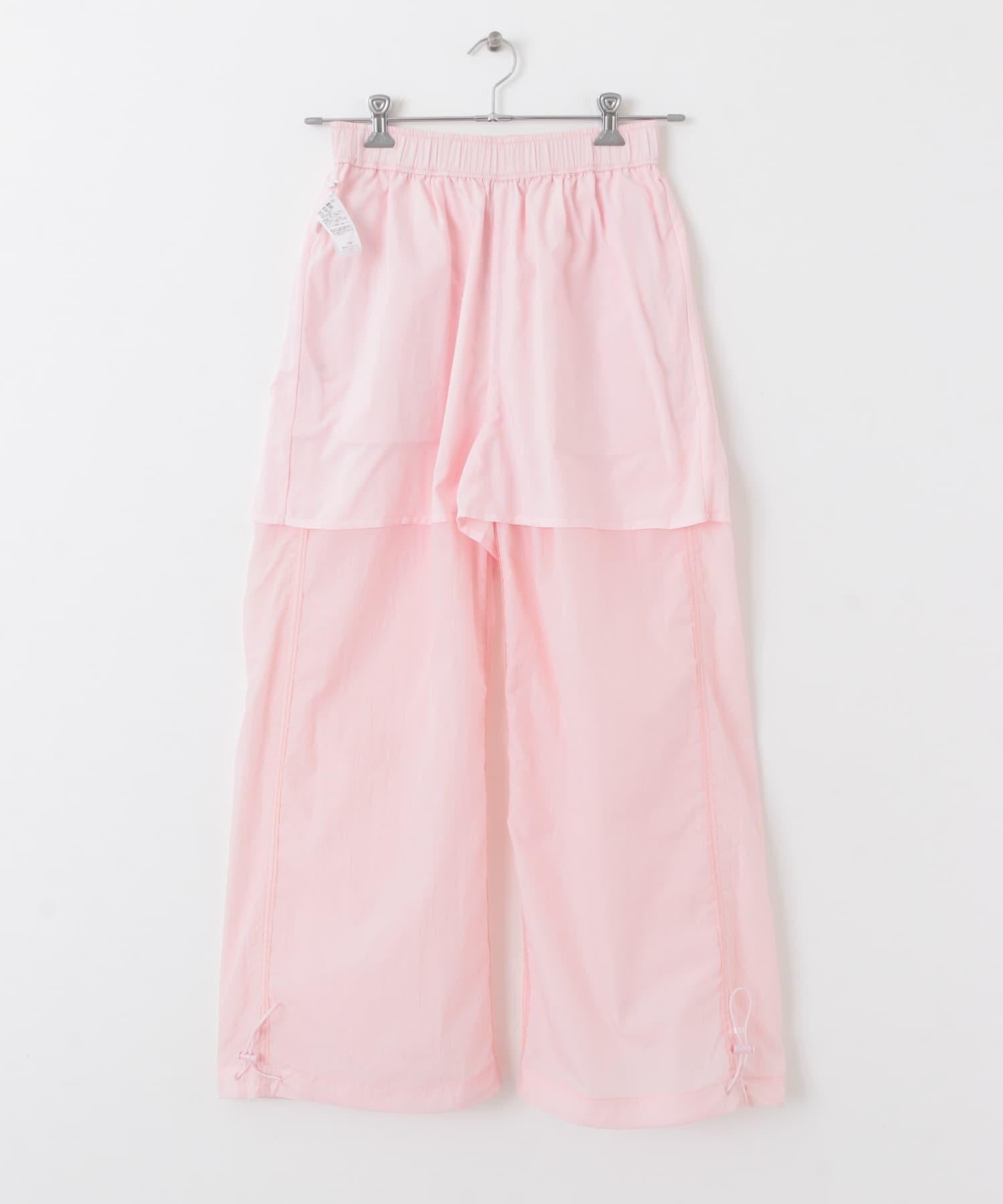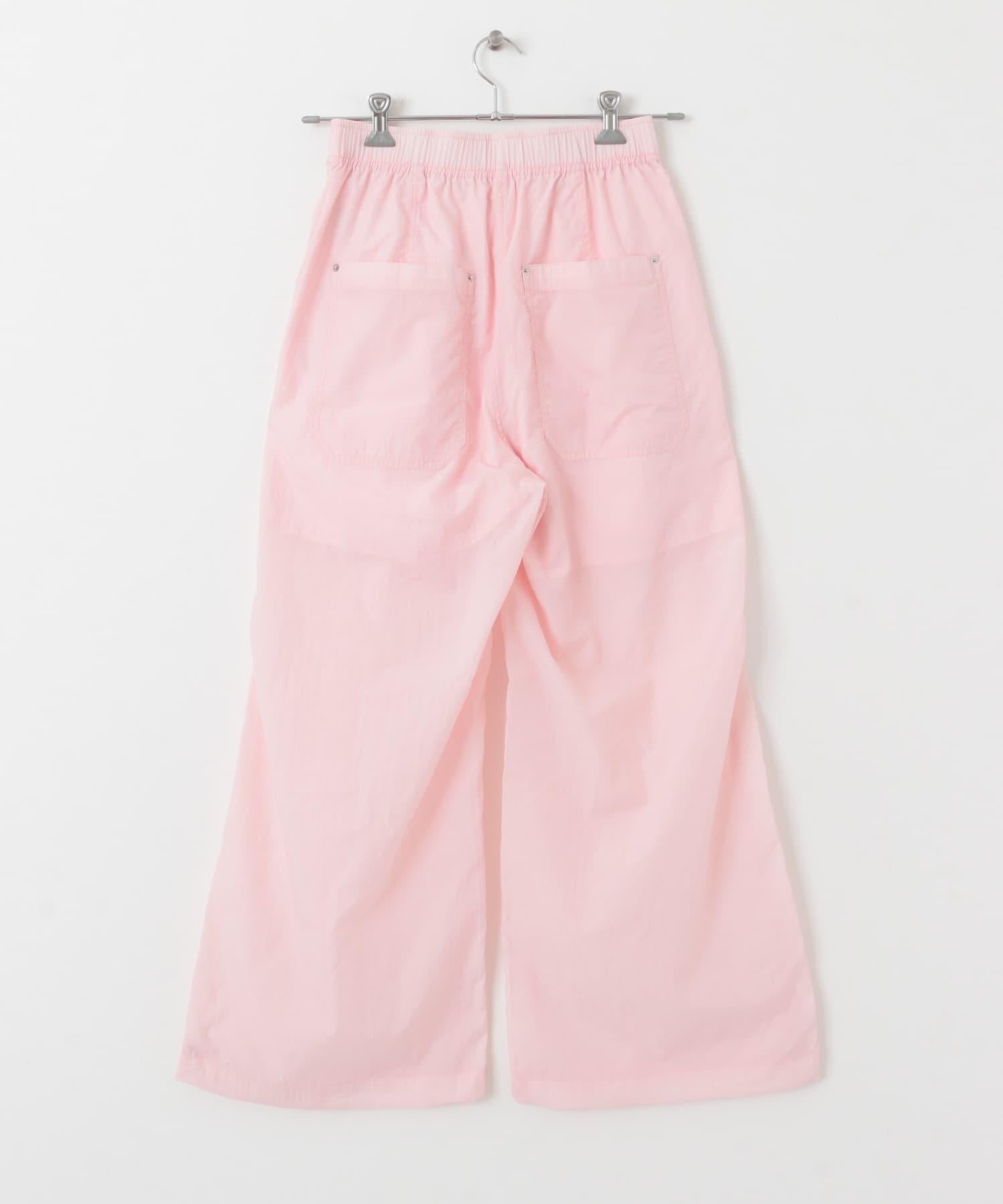 長褲採用輕盈透氣的尼龍材料製成。腰部的鬆緊帶設計使褲子更加寬鬆,下襬的抽繩設計讓您可以盡情變換褲型。正面的環形點帶和口袋上的拉鍊也是為這款單品增色不少的微妙細節。