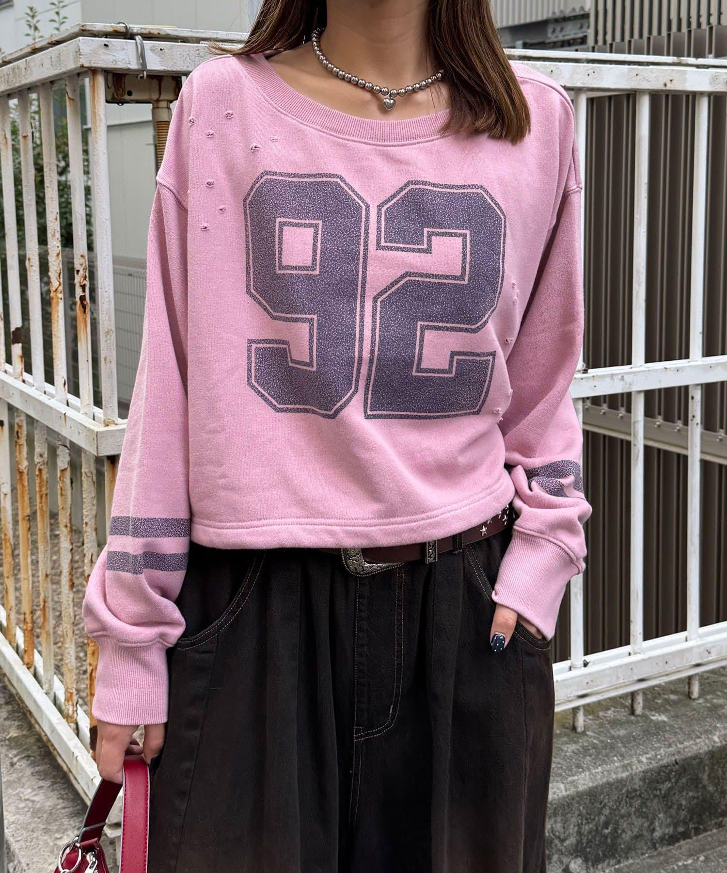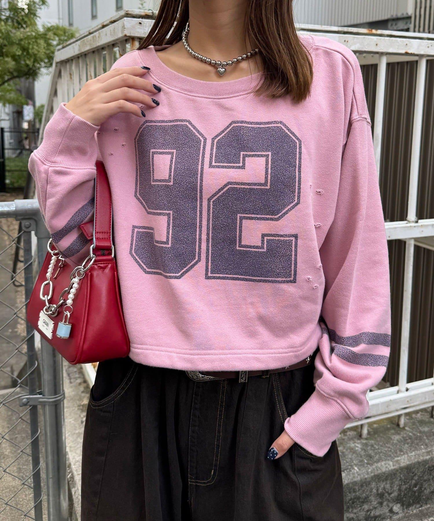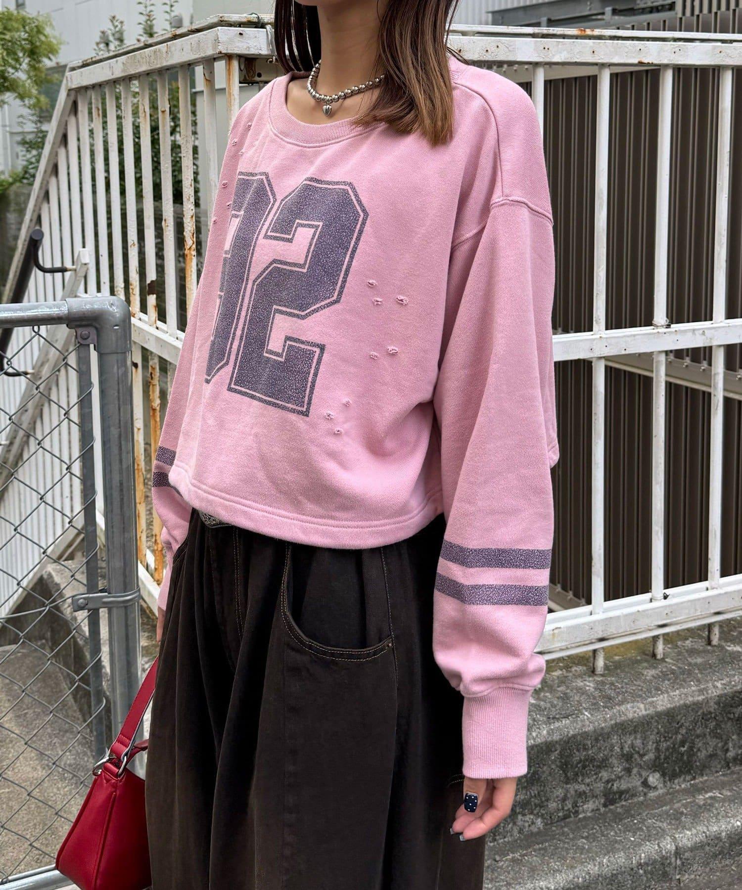 短款衛衣採用復古的破損處理,並標有醒目的編號。