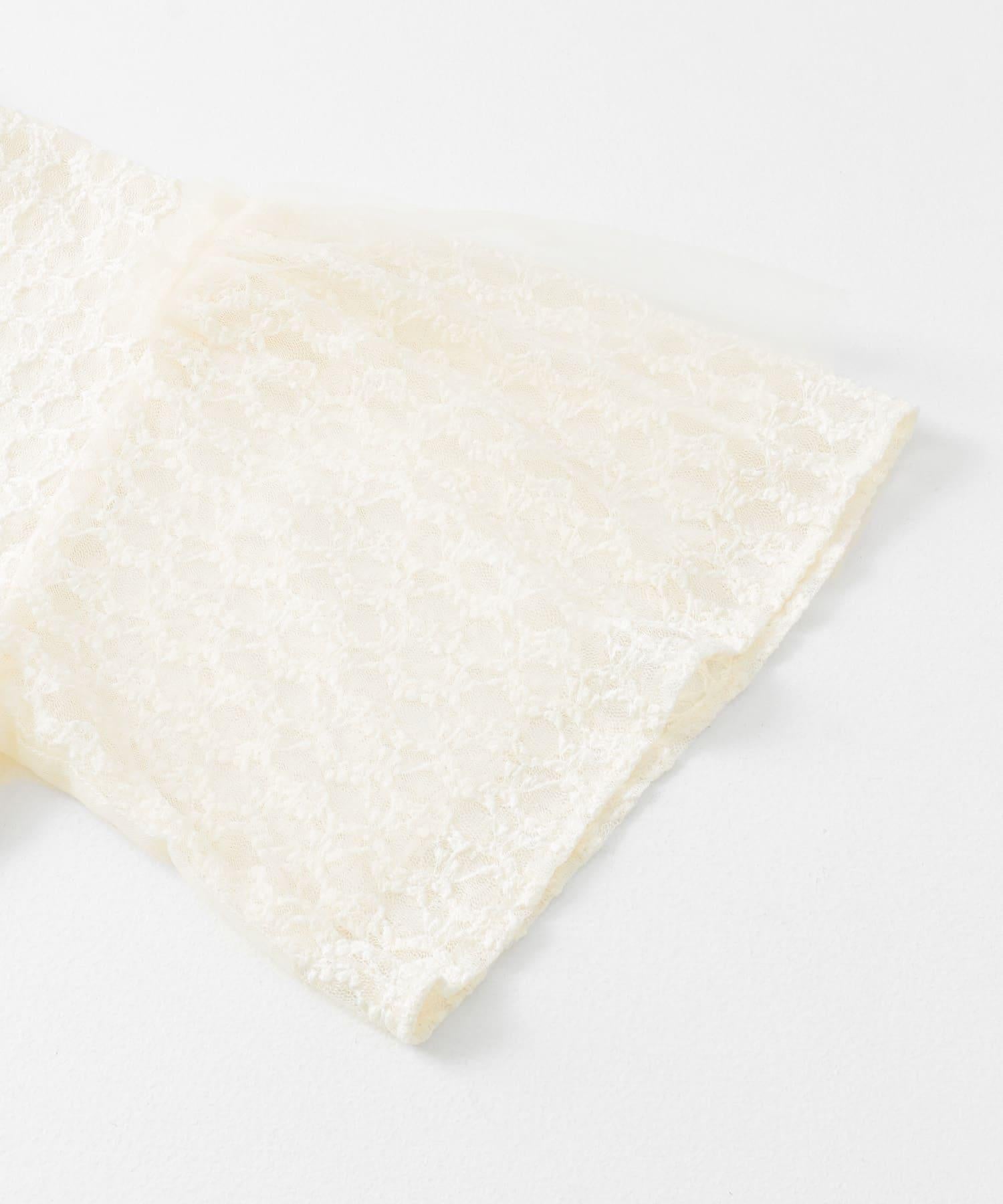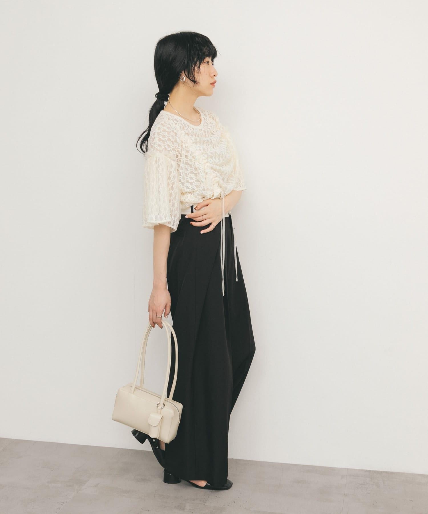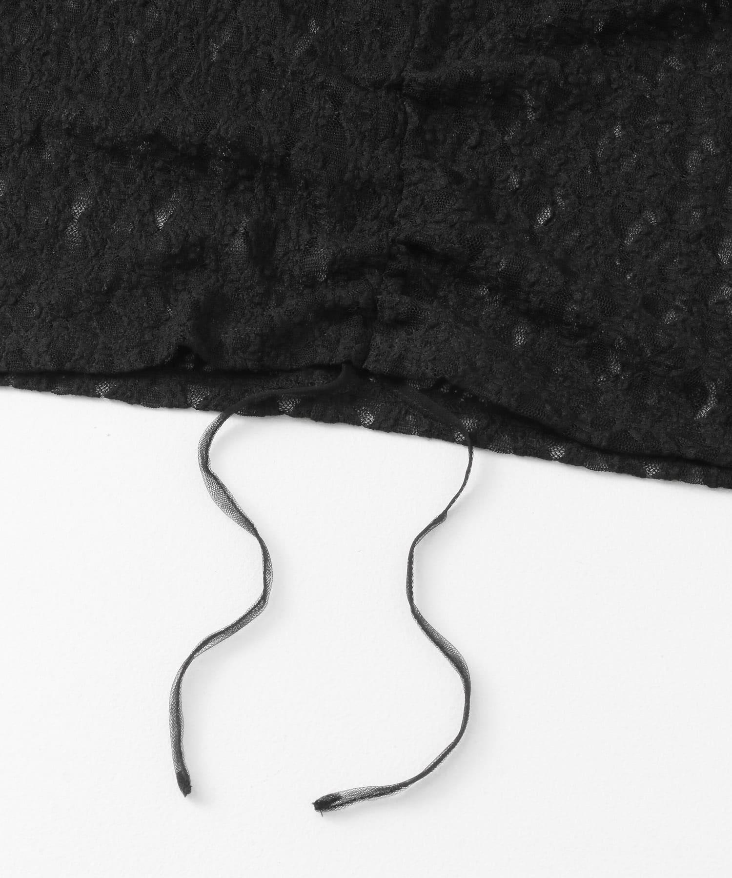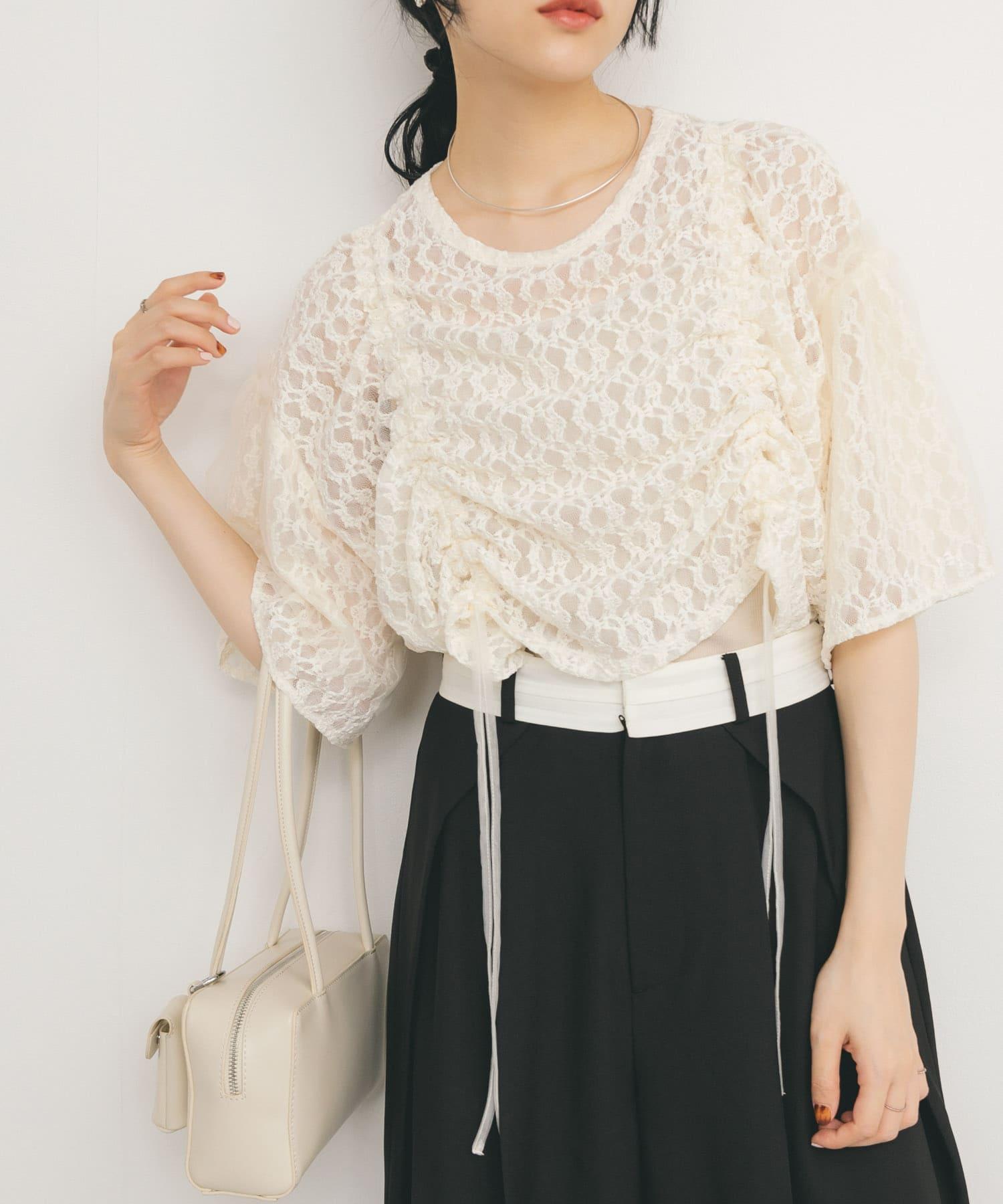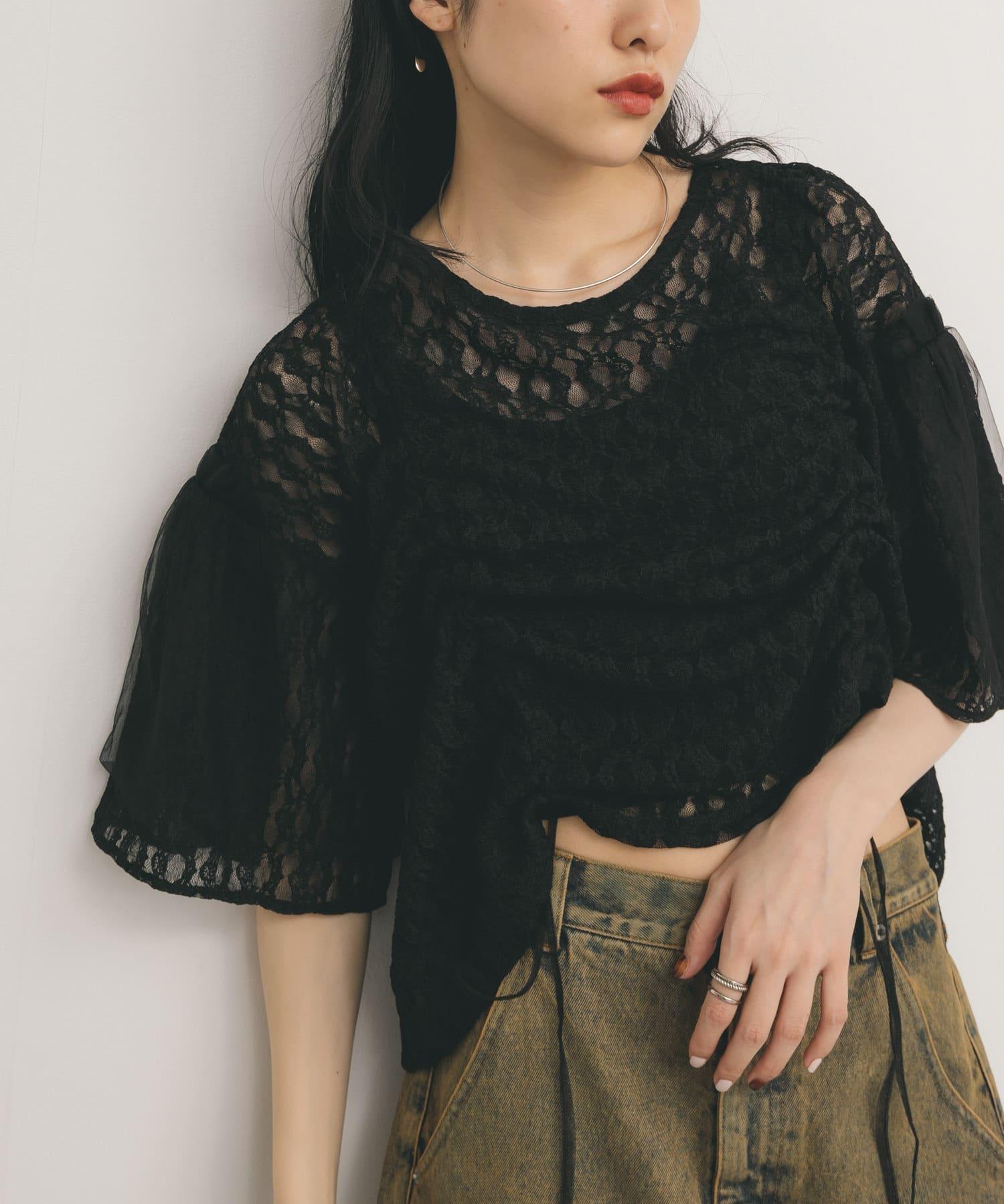 這是一款採用時尚蕾絲和薄紗拼接的設計上衣。重點是在蕾絲面料上柔軟地疊加了稍短的薄紗製成的豐滿袖子。前面的繩索可以系得很緊,營造出垂墜的效果,使款式充滿動感。有易於搭配的紫色和黑色可供選擇。