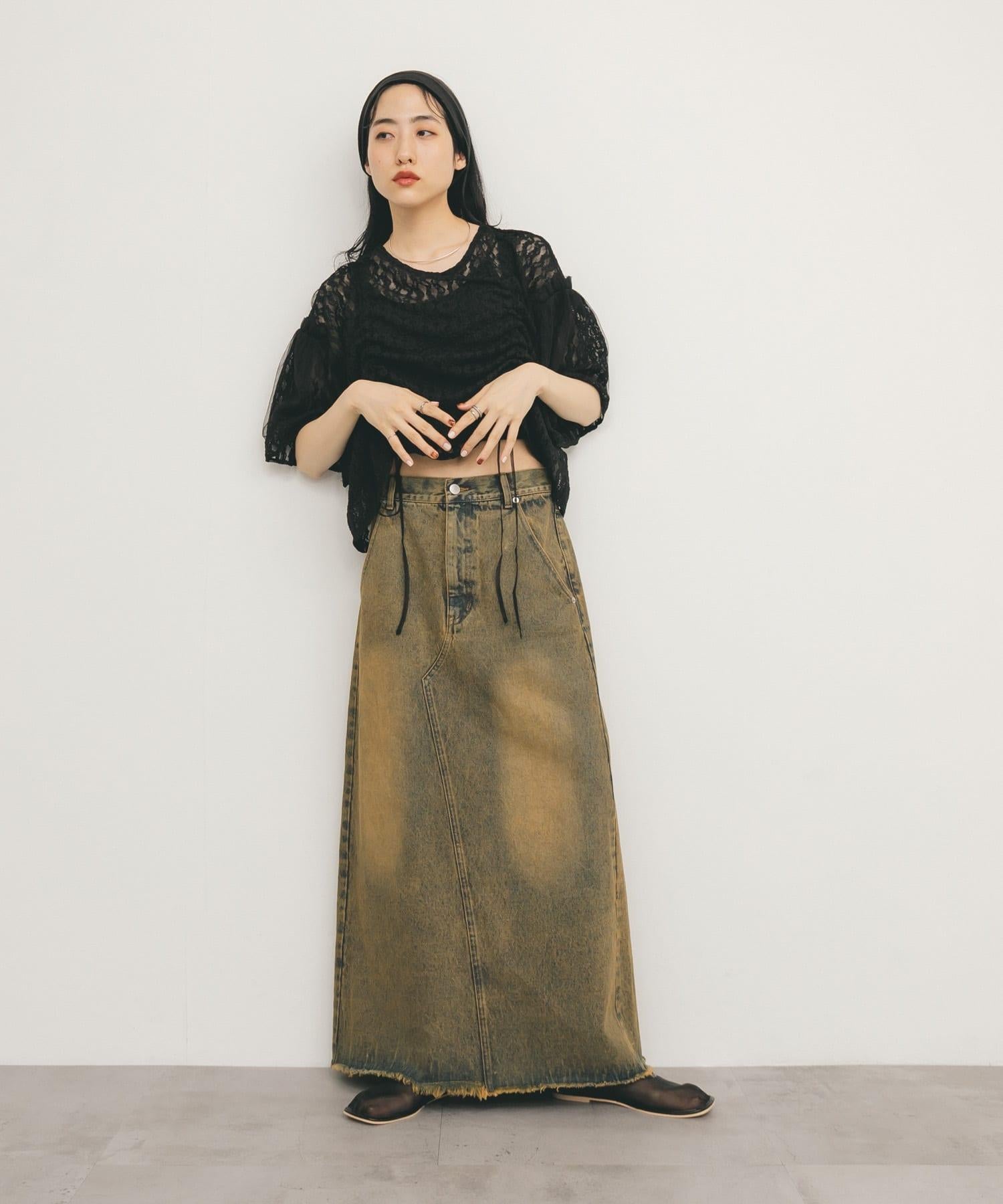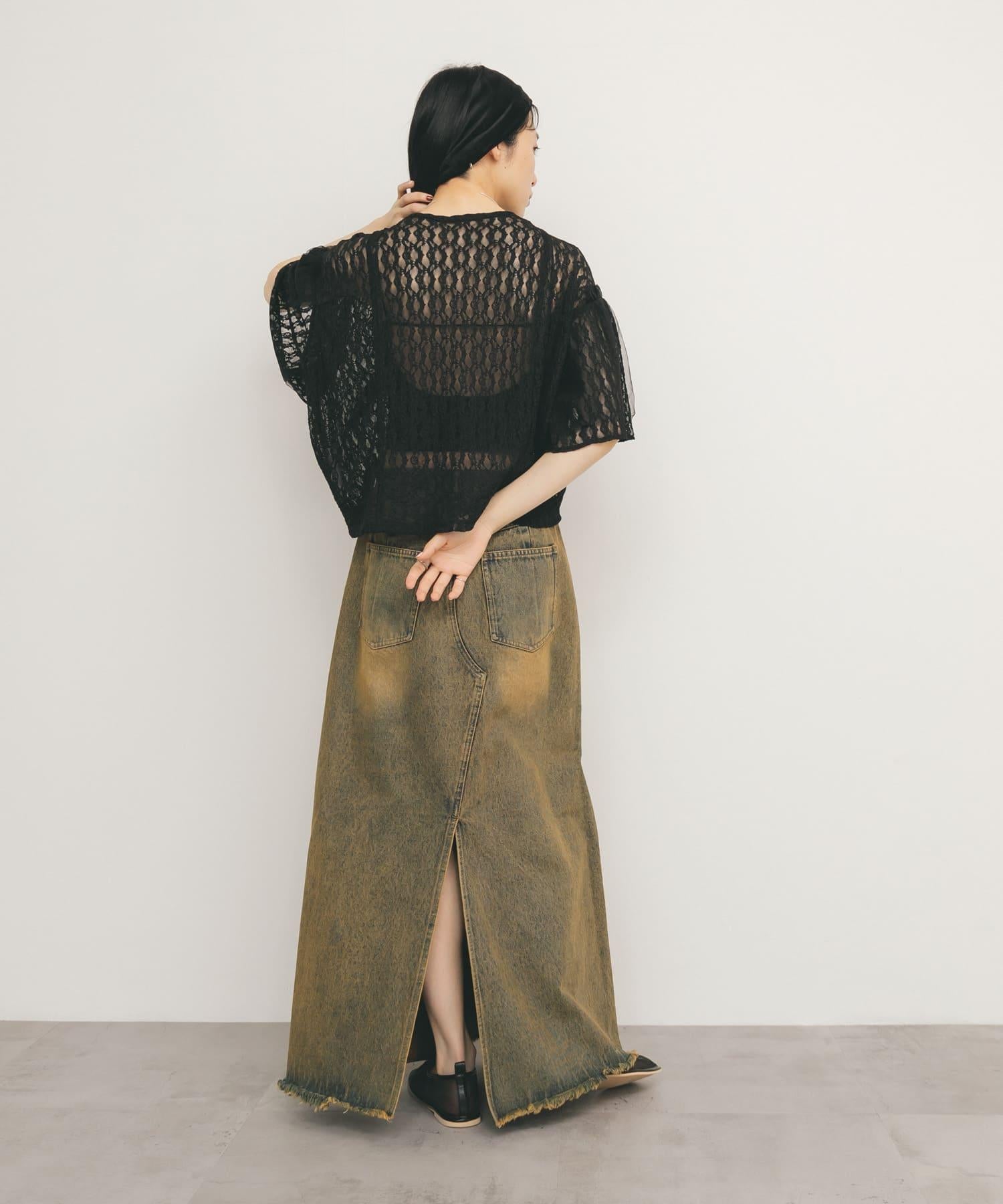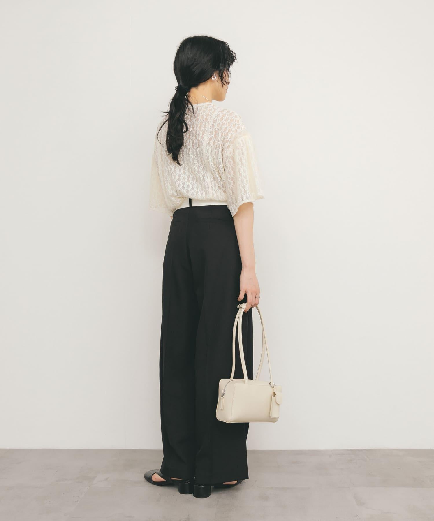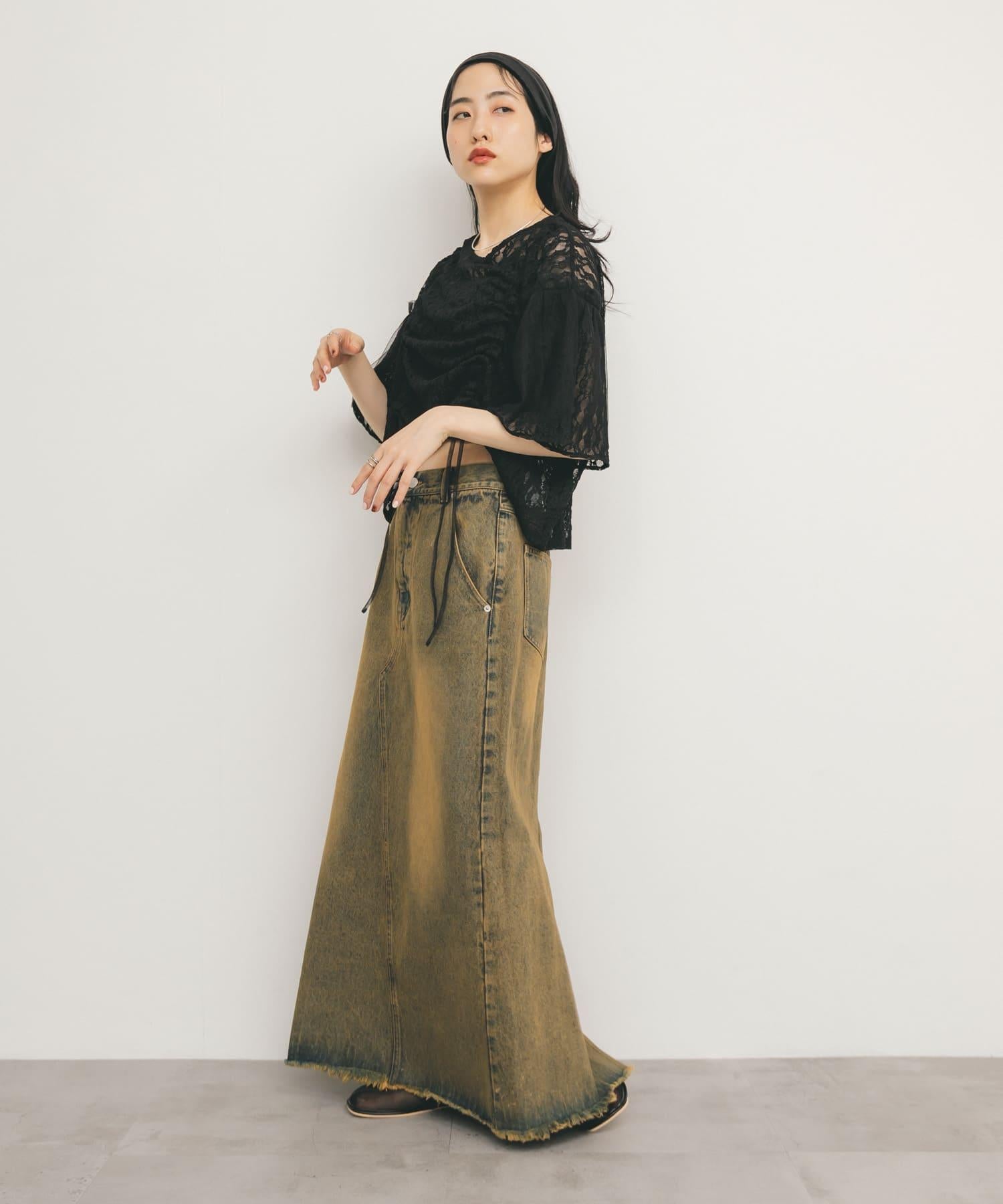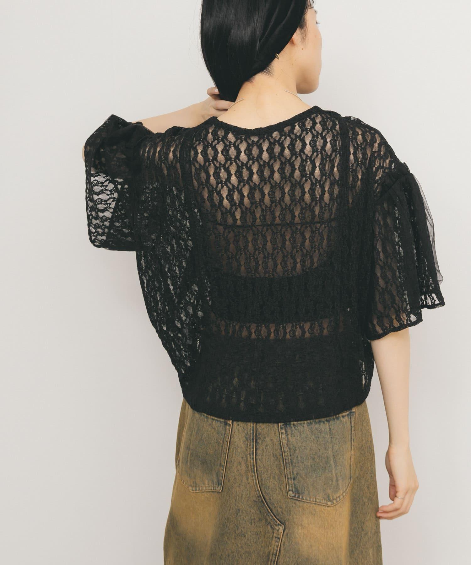 這是一款採用時尚蕾絲和薄紗拼接的設計上衣。重點是在蕾絲面料上柔軟地疊加了稍短的薄紗製成的豐滿袖子。前面的繩索可以系得很緊,營造出垂墜的效果,使款式充滿動感。有易於搭配的紫色和黑色可供選擇。