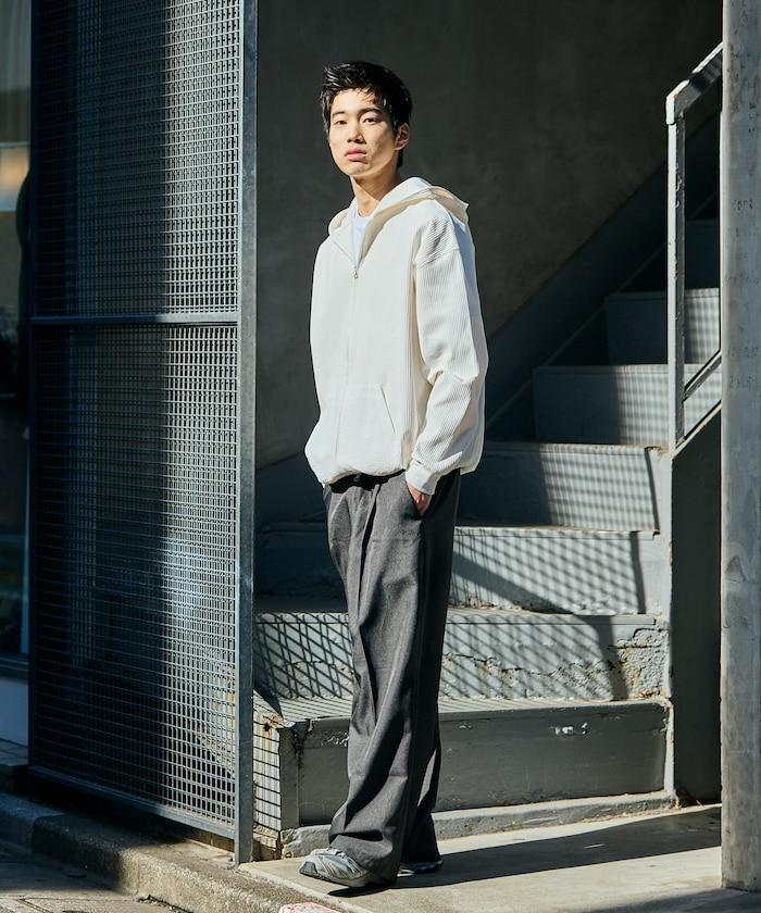 肩部下垂的大廓形給人一種輕鬆的感覺。