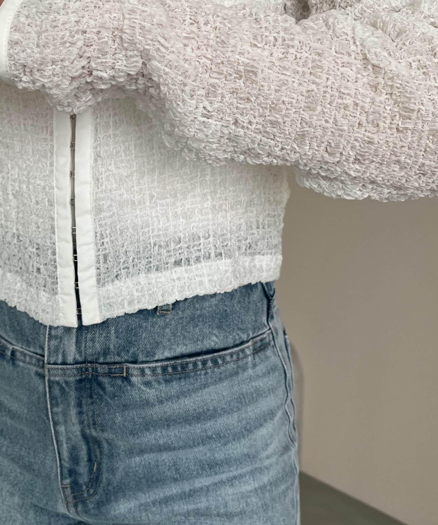 頸部和袖口採用不同材質的滾邊作為點綴。