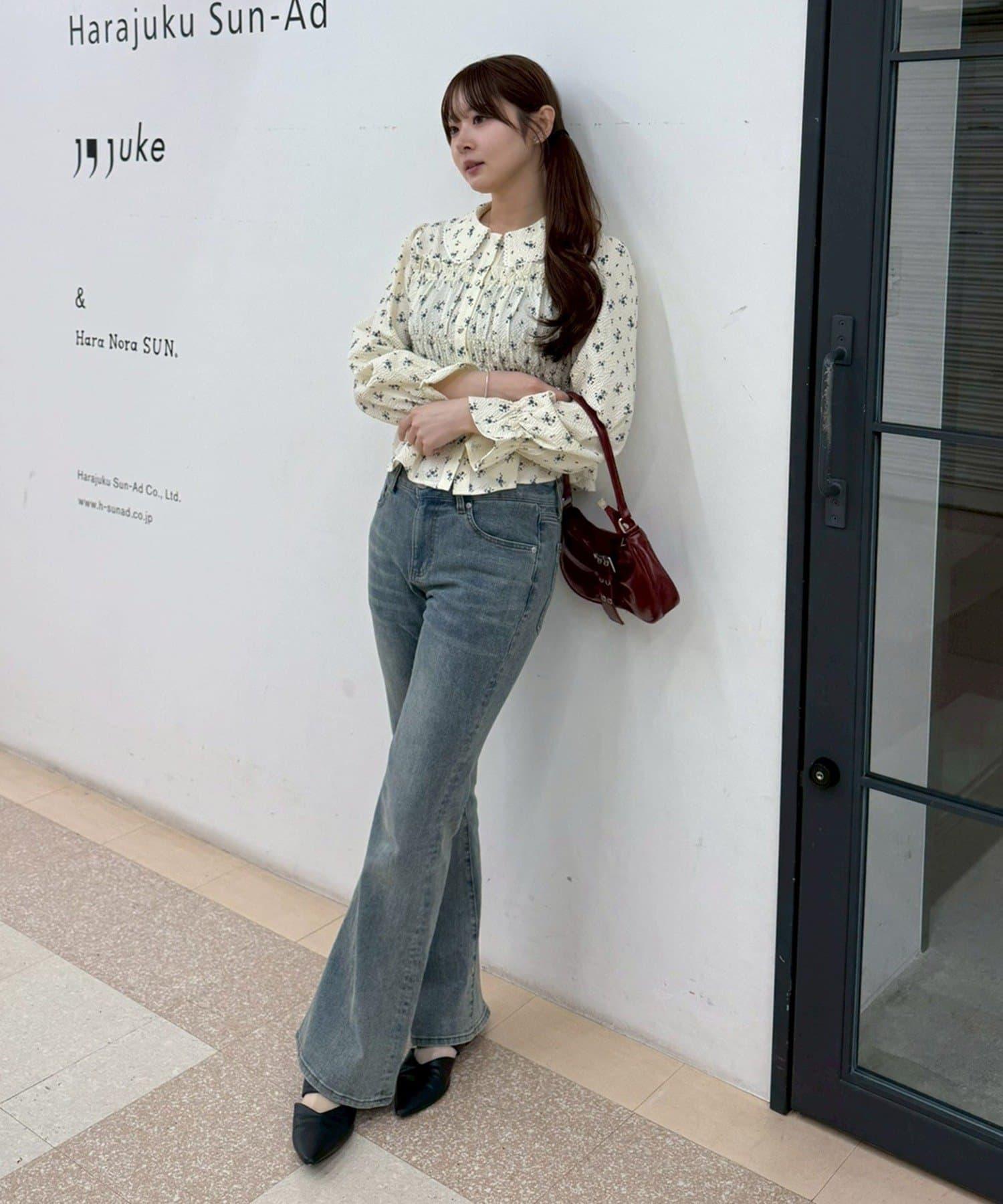 這款上衣給人一種少女的感覺,因此建議搭配牛仔褲,穿出春天的感覺。