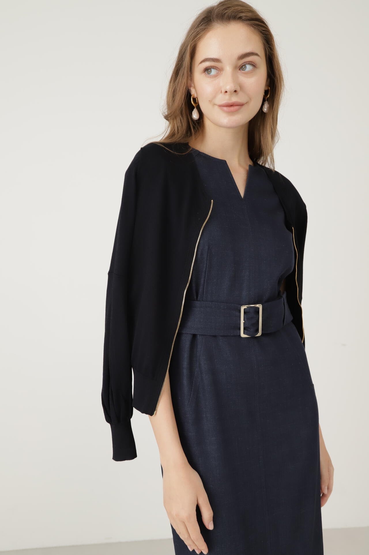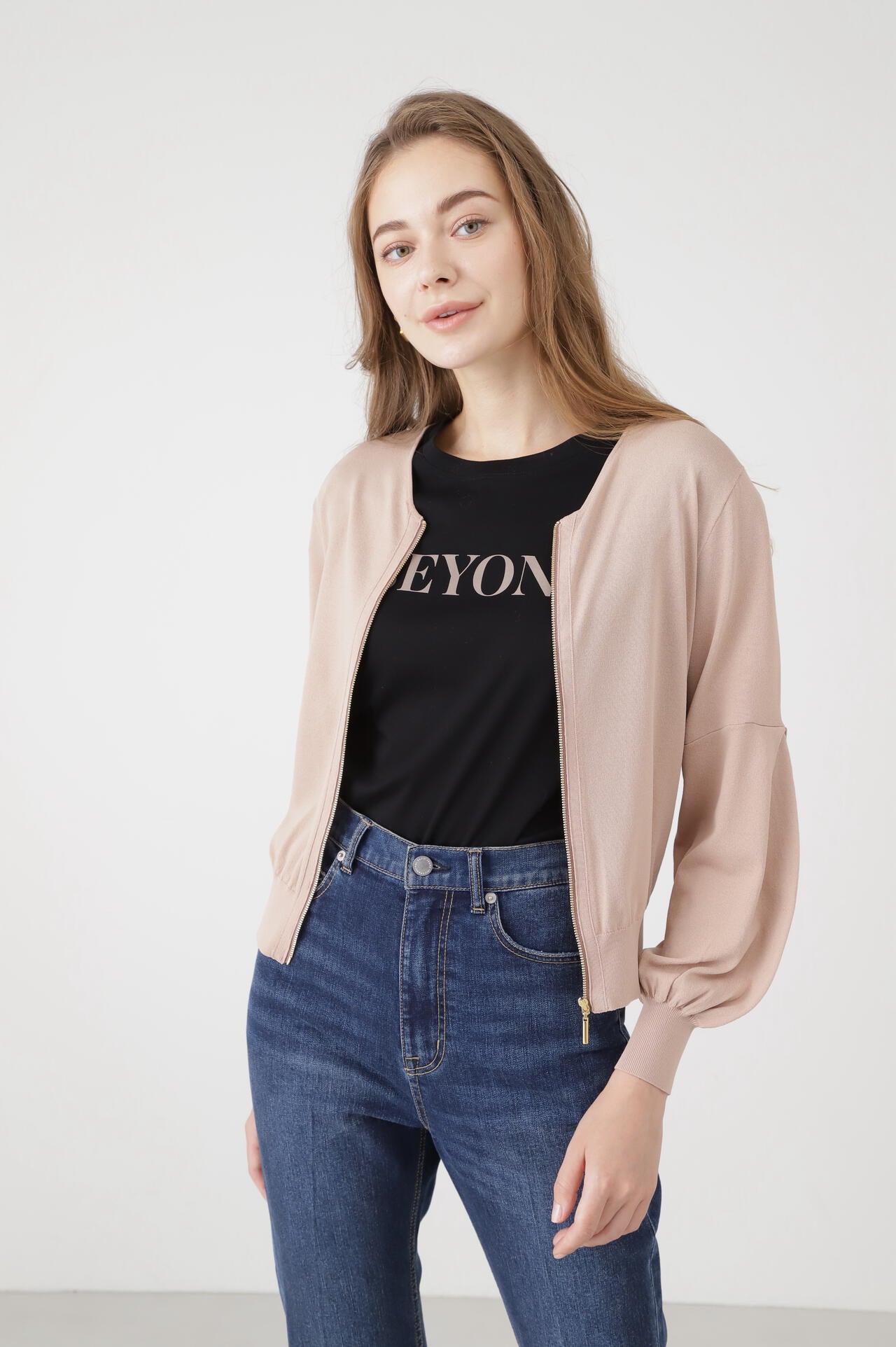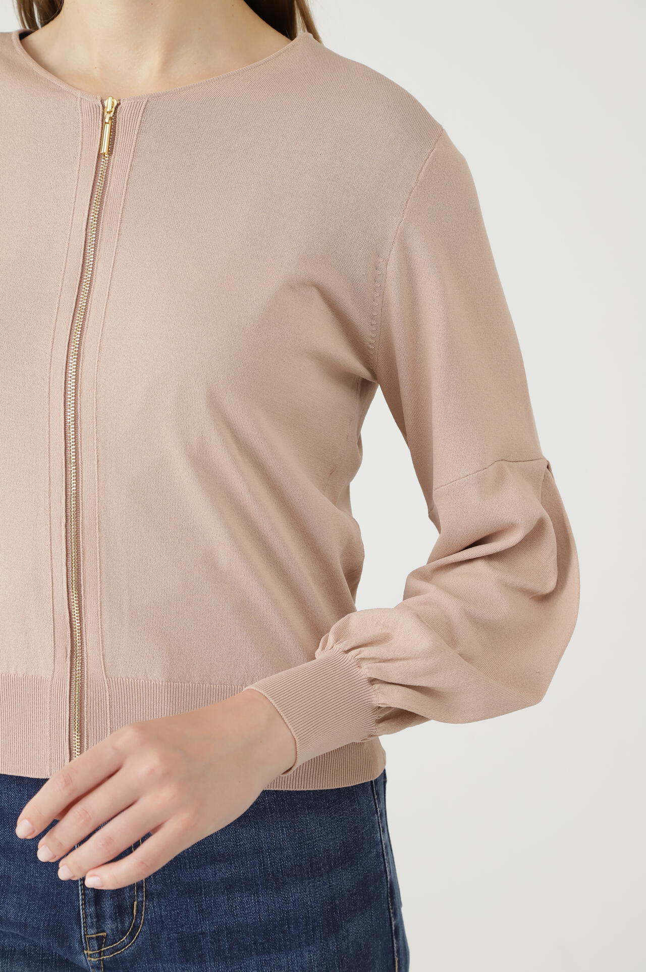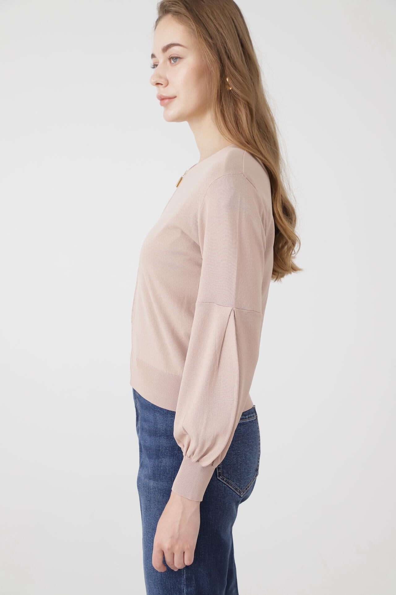 高針距針織輕薄罩衫。材質輕盈,但穿著時不會有透視感,可以穿出美感。它採用 V 領設計,即使收起前襟也能露出鎖骨。肩部的鑲邊保持了整潔,袖子收進肘部以上的過渡處,使袖子下部豐滿。袖子豐滿,羅紋袖口收緊。根據袖口位置的不同,表情也會發生變化,因此既可以將袖子放下來,讓人看起來乾淨利落,也可以將袖子撩起來,讓人看起來更加嫵媚。袖子兩側內收,從側面看非常可愛。長羅紋袖口和袖子位置的切換可以讓手臂看起來更修長。