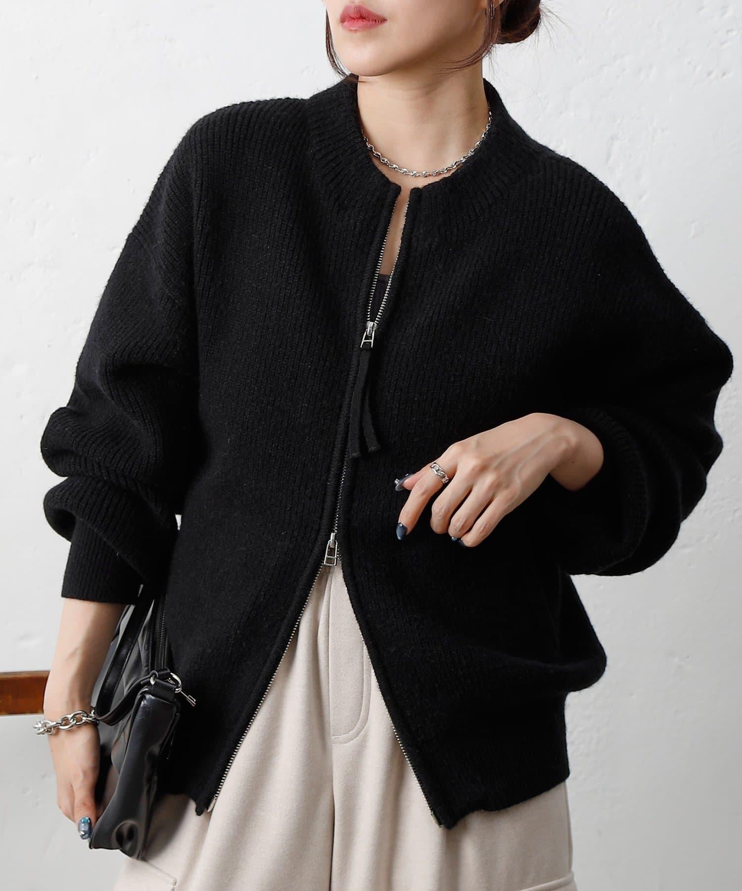 這是一款在單層羅紋針織中完成的具有立體感的拉鍊針織衫。