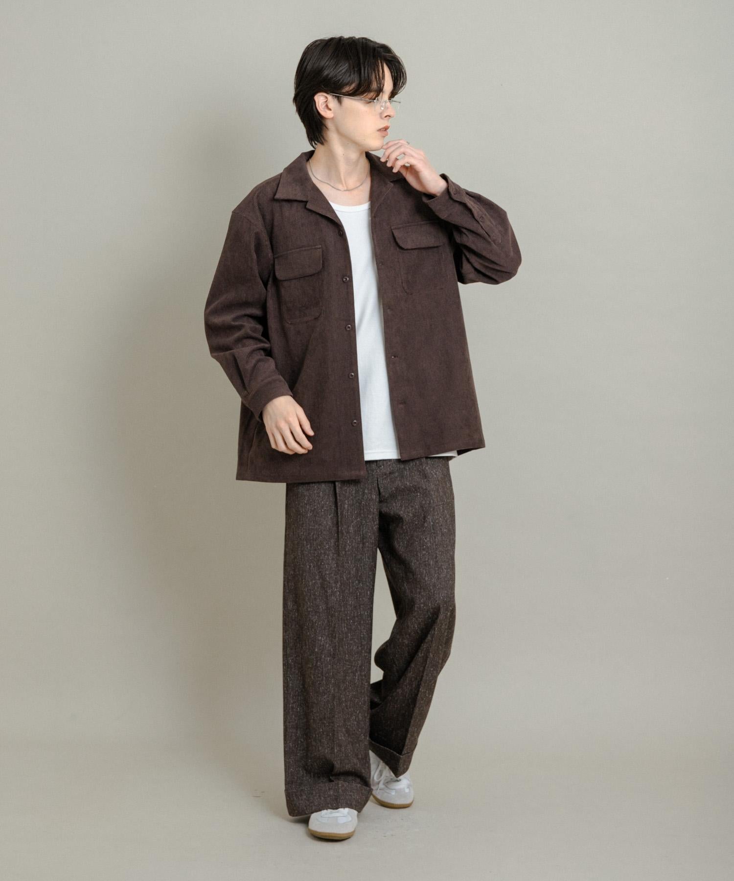 內搭簡單的高領針織衫,外穿襯衫。搭配同系列的寬鬆休閒褲,即可展現出季節感十足的造型。搭配牛仔褲或錐形褲,凸顯材質的優雅,盡享成人休閒風。