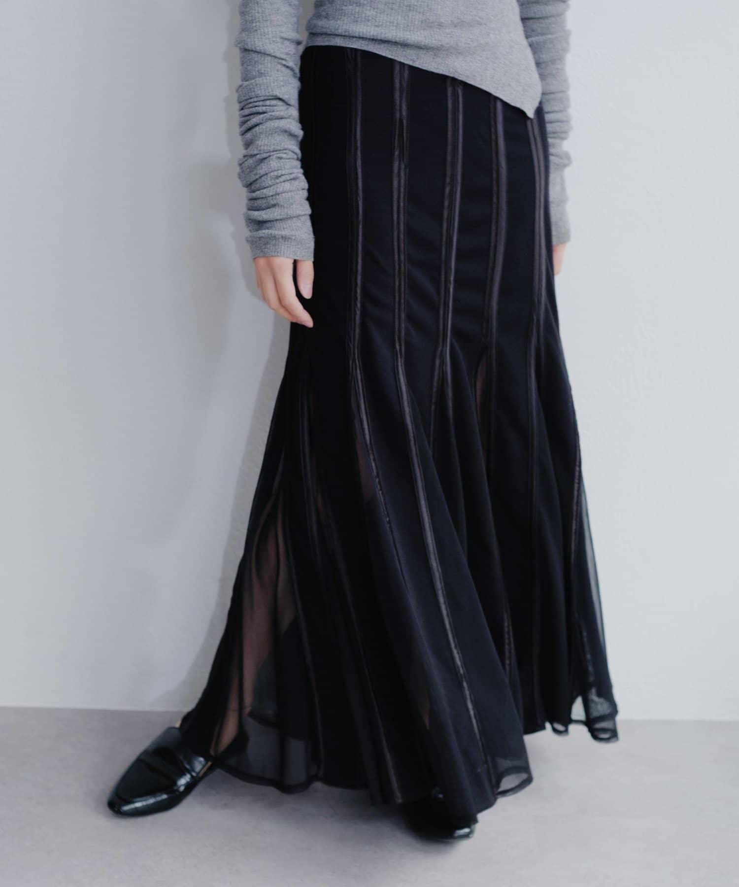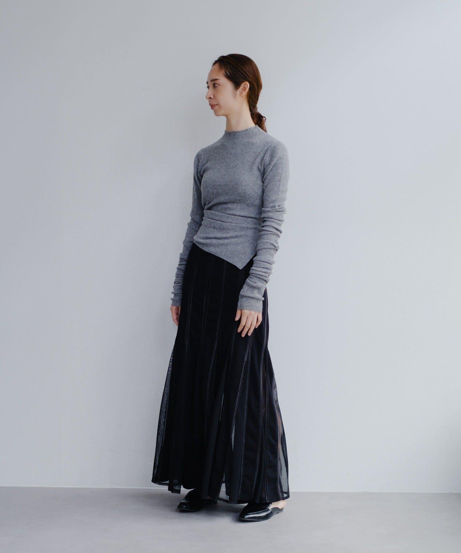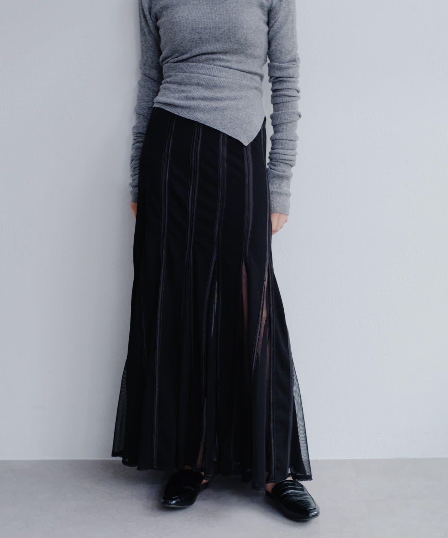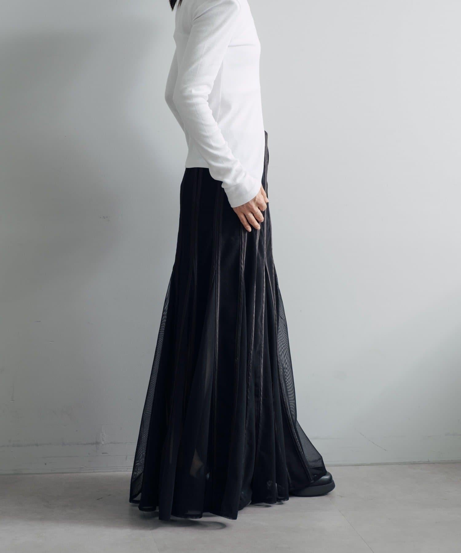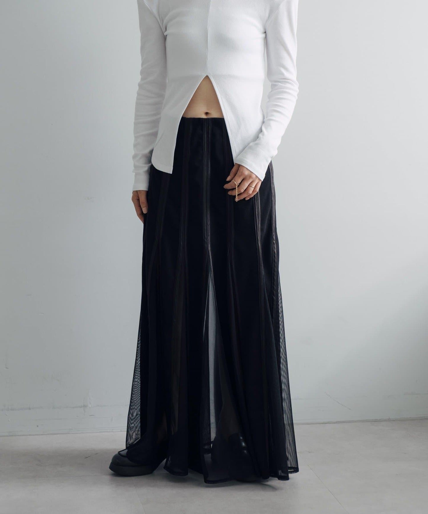 這是一款非常漂亮的薄紗裙,適合搭配針織衫和夾克。利用薄紗的透明性和裁剪縫製面料的彈性,裙子的形狀像百褶裙一樣,由多塊面料組合而成。腰部區域不是透明的,但從膝蓋以上到下襬,該裝置可以讓裙襬飄動,在您移動時變得透明。