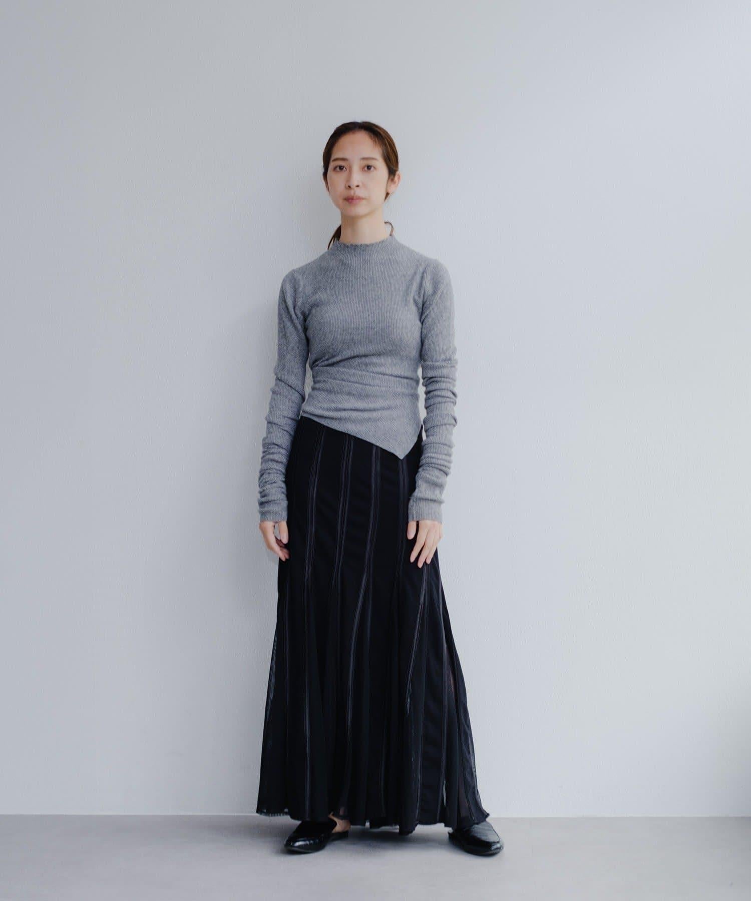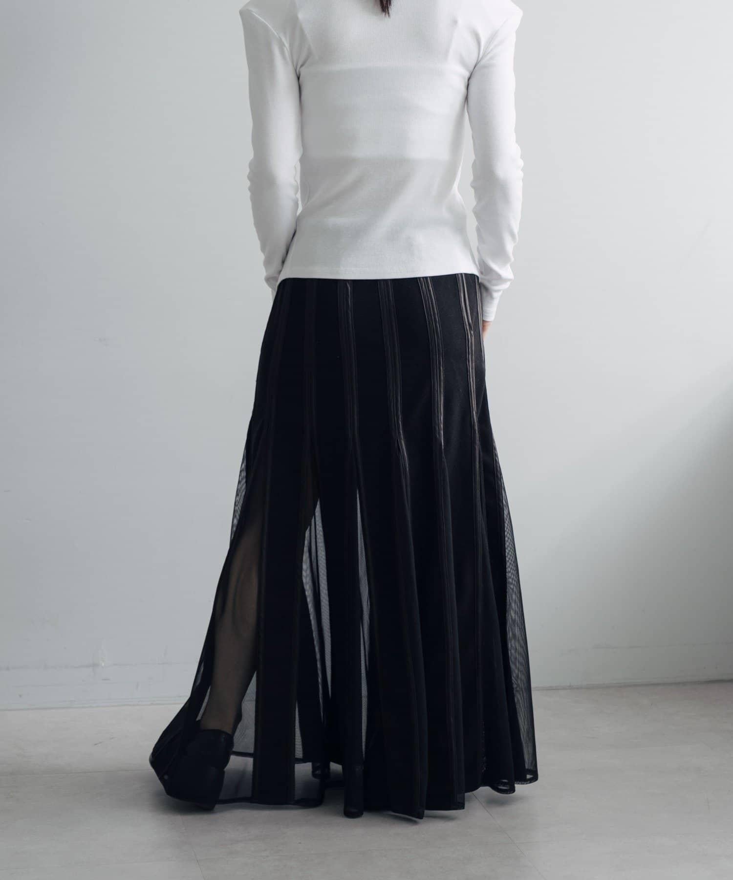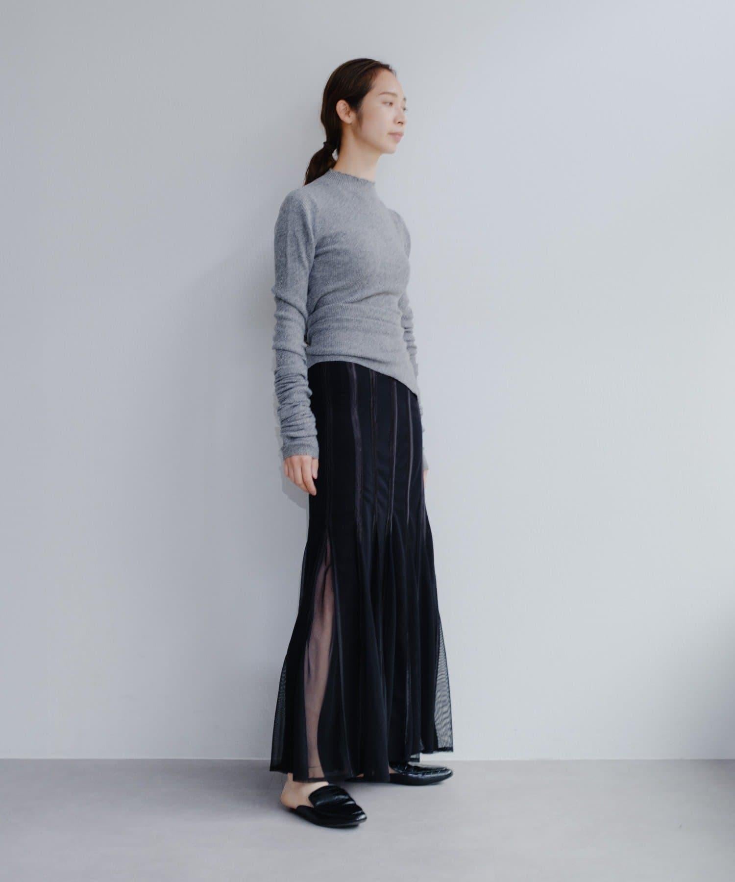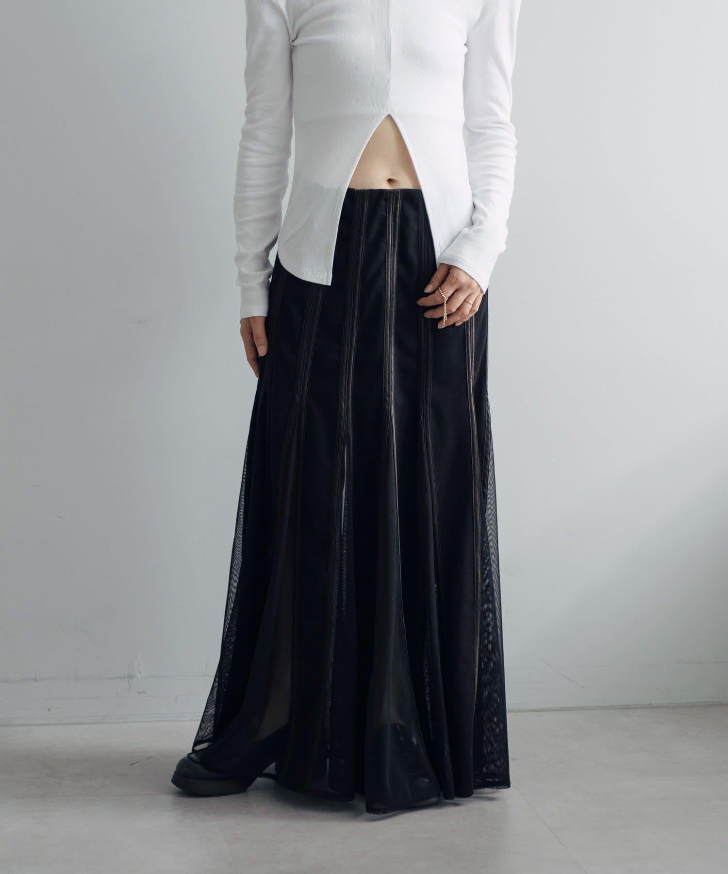 這是一款非常漂亮的薄紗裙,適合搭配針織衫和夾克。利用薄紗的透明性和裁剪縫製面料的彈性,裙子的形狀像百褶裙一樣,由多塊面料組合而成。腰部區域不是透明的,但從膝蓋以上到下襬,該裝置可以讓裙襬飄動,在您移動時變得透明。