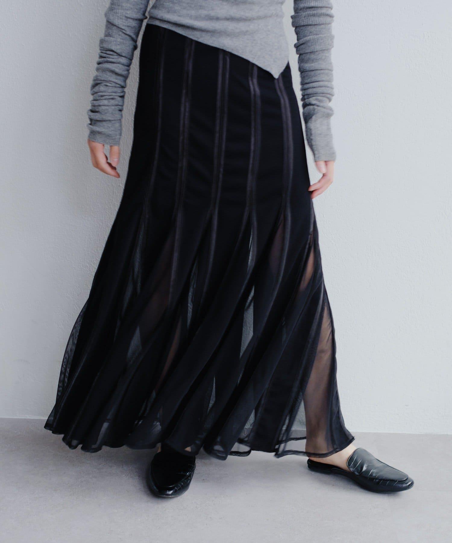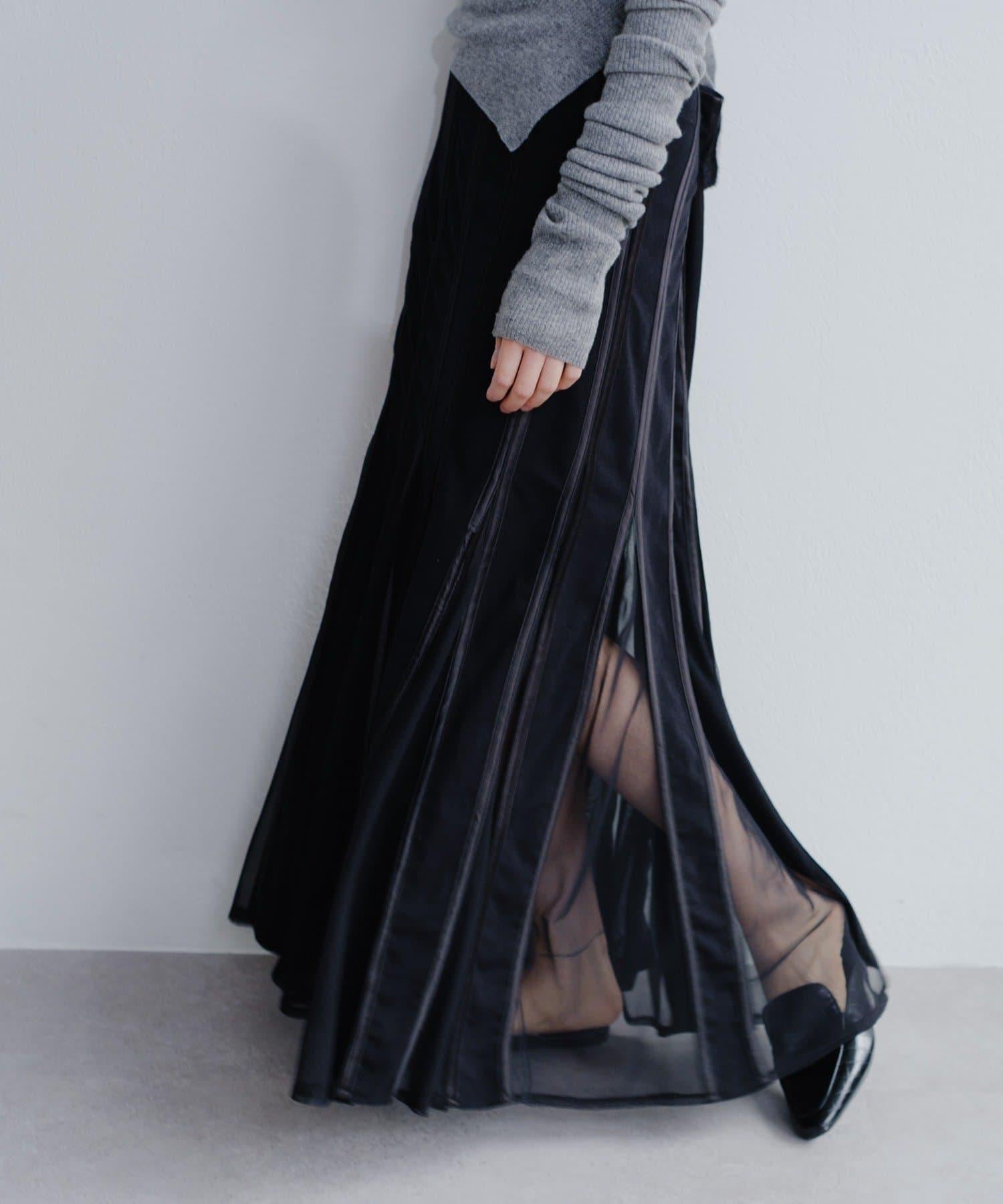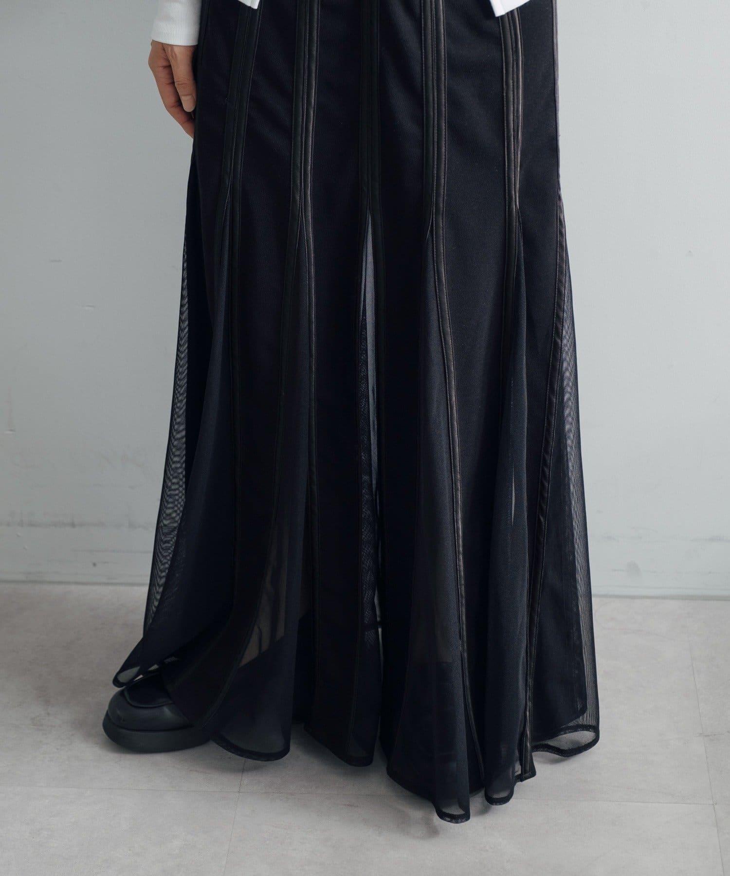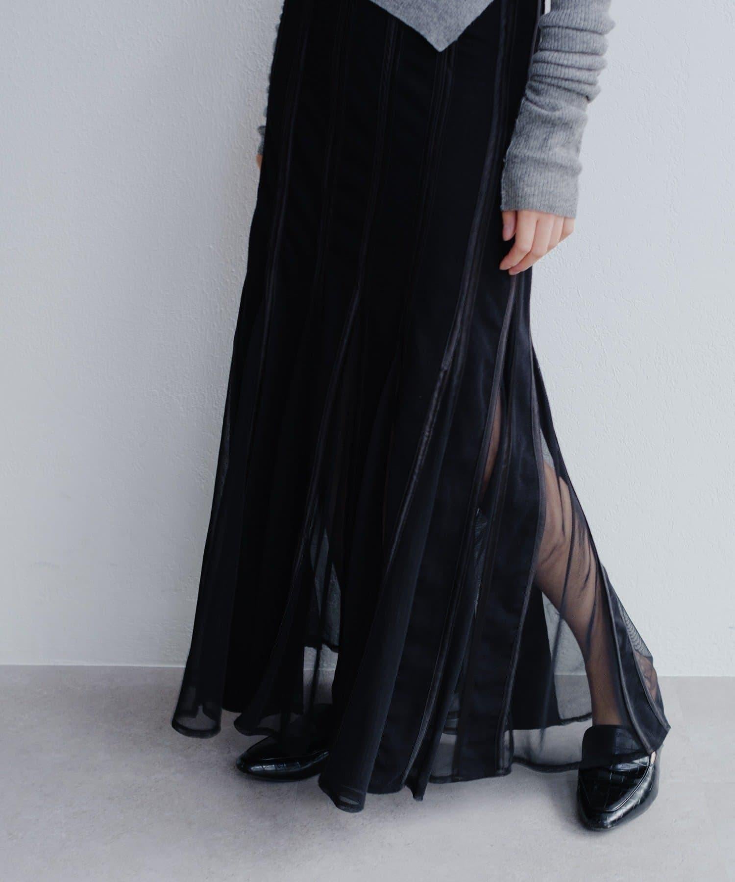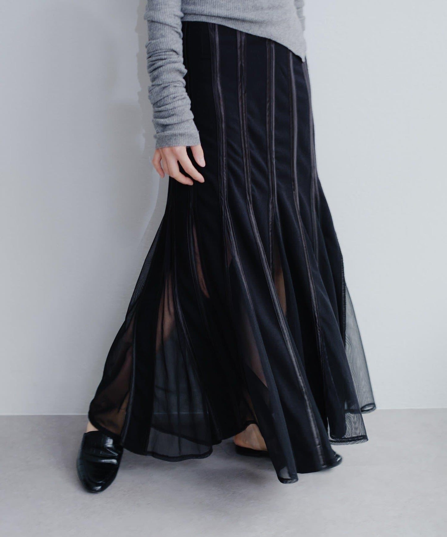 這是一款非常漂亮的薄紗裙,適合搭配針織衫和夾克。利用薄紗的透明性和裁剪縫製面料的彈性,裙子的形狀像百褶裙一樣,由多塊面料組合而成。腰部區域不是透明的,但從膝蓋以上到下襬,該裝置可以讓裙襬飄動,在您移動時變得透明。