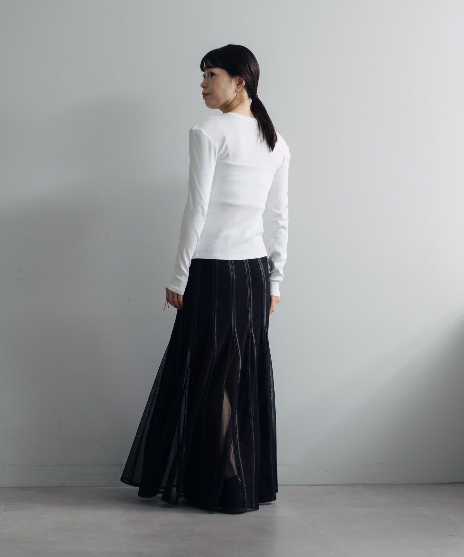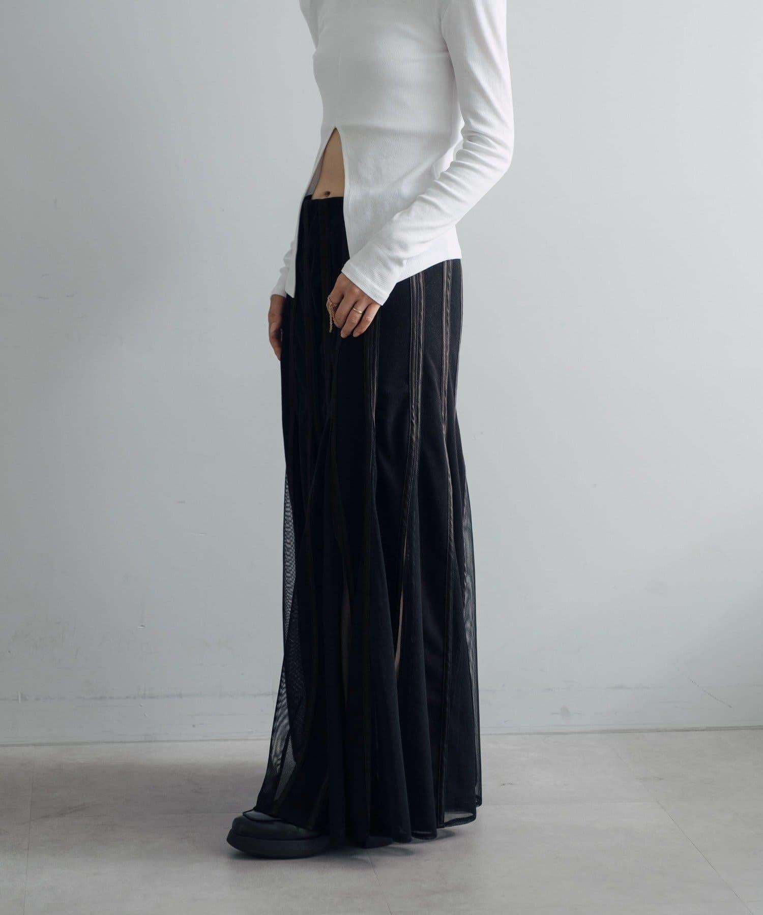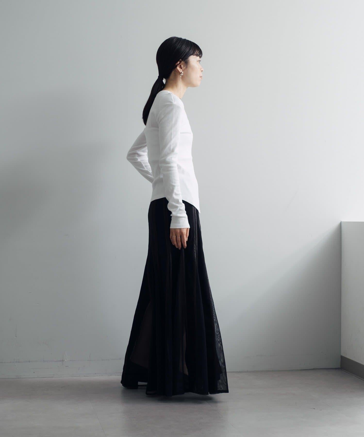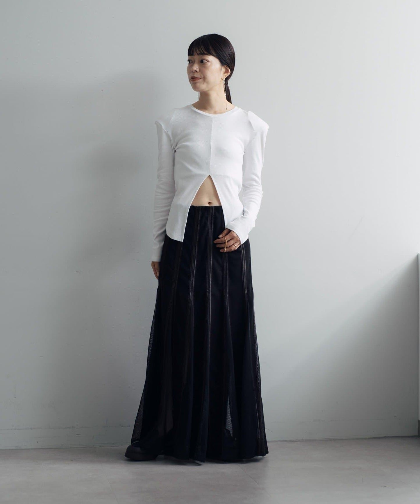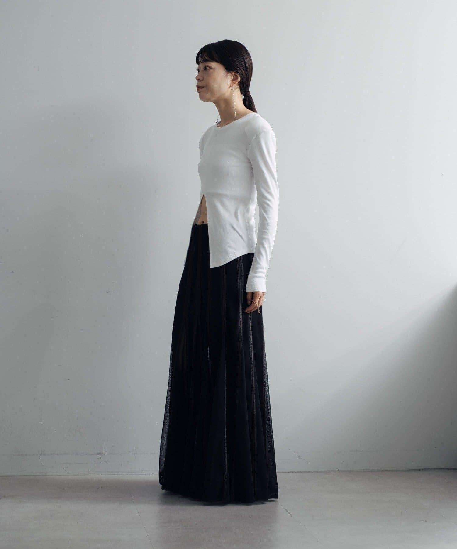 腰部前後都有鬆緊帶。它具有彈性,可以承受劇烈運動。可與長褲或緊身褲疊穿。此外,還建議在裡面穿上靴子,使其變得透明。這是一款無需選擇 TOPS 即可通用的單品,因此可以在各種季節使用。