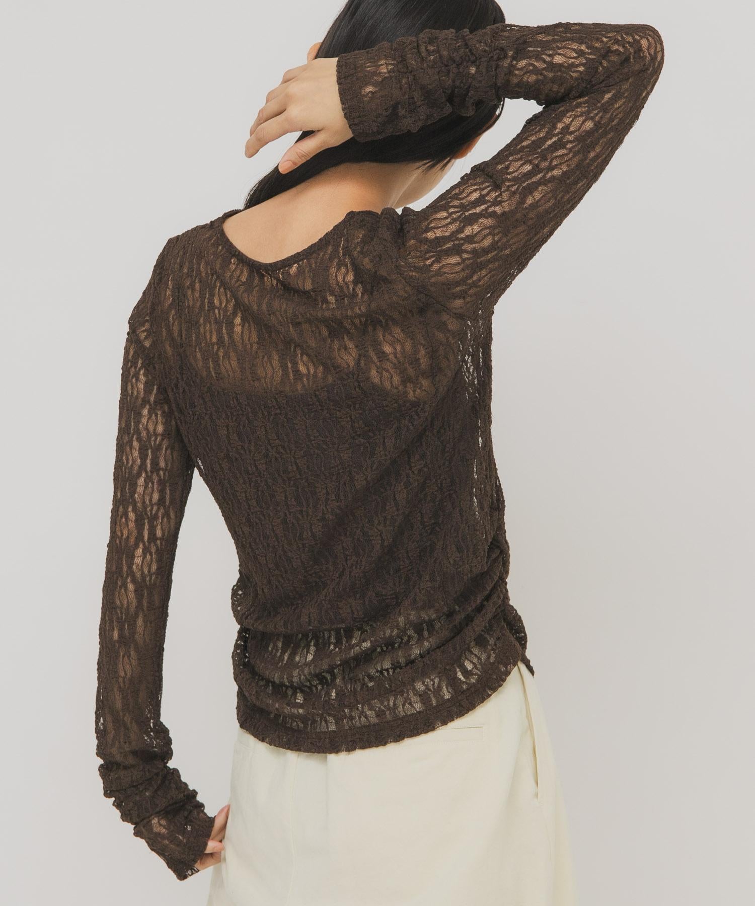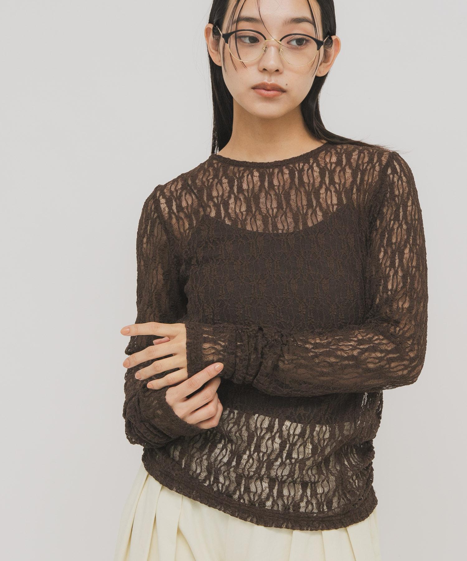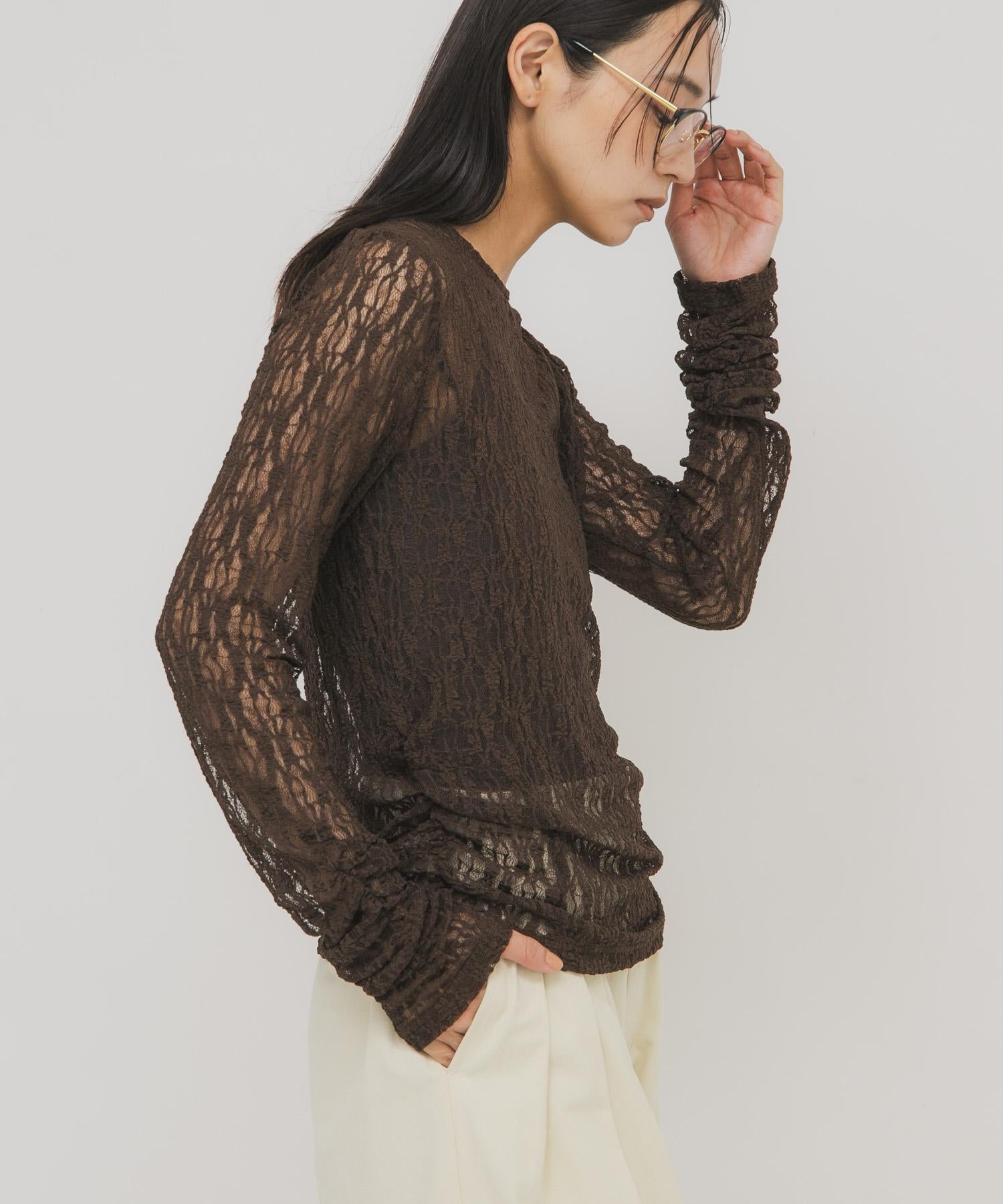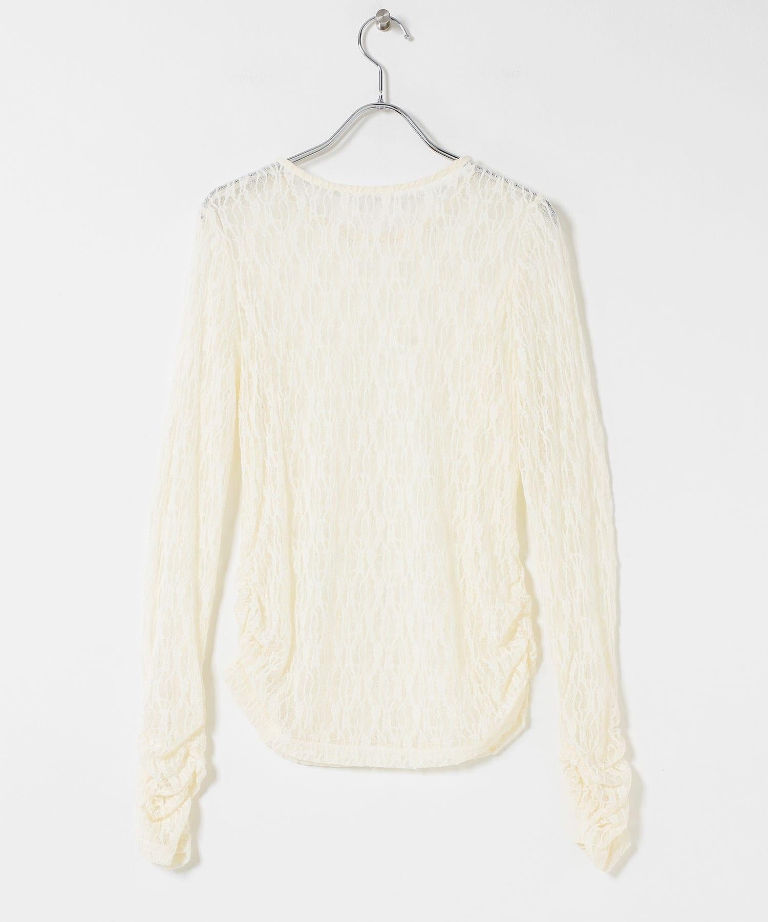 這款蕾絲上衣觸感柔軟,貼膚舒適。通過在身體周圍進行切換,打造出簡潔利落的造型。不僅可作為單品,還可作為疊穿單品使用。