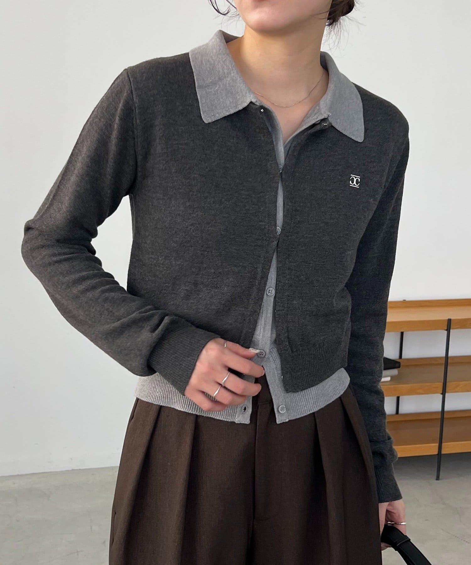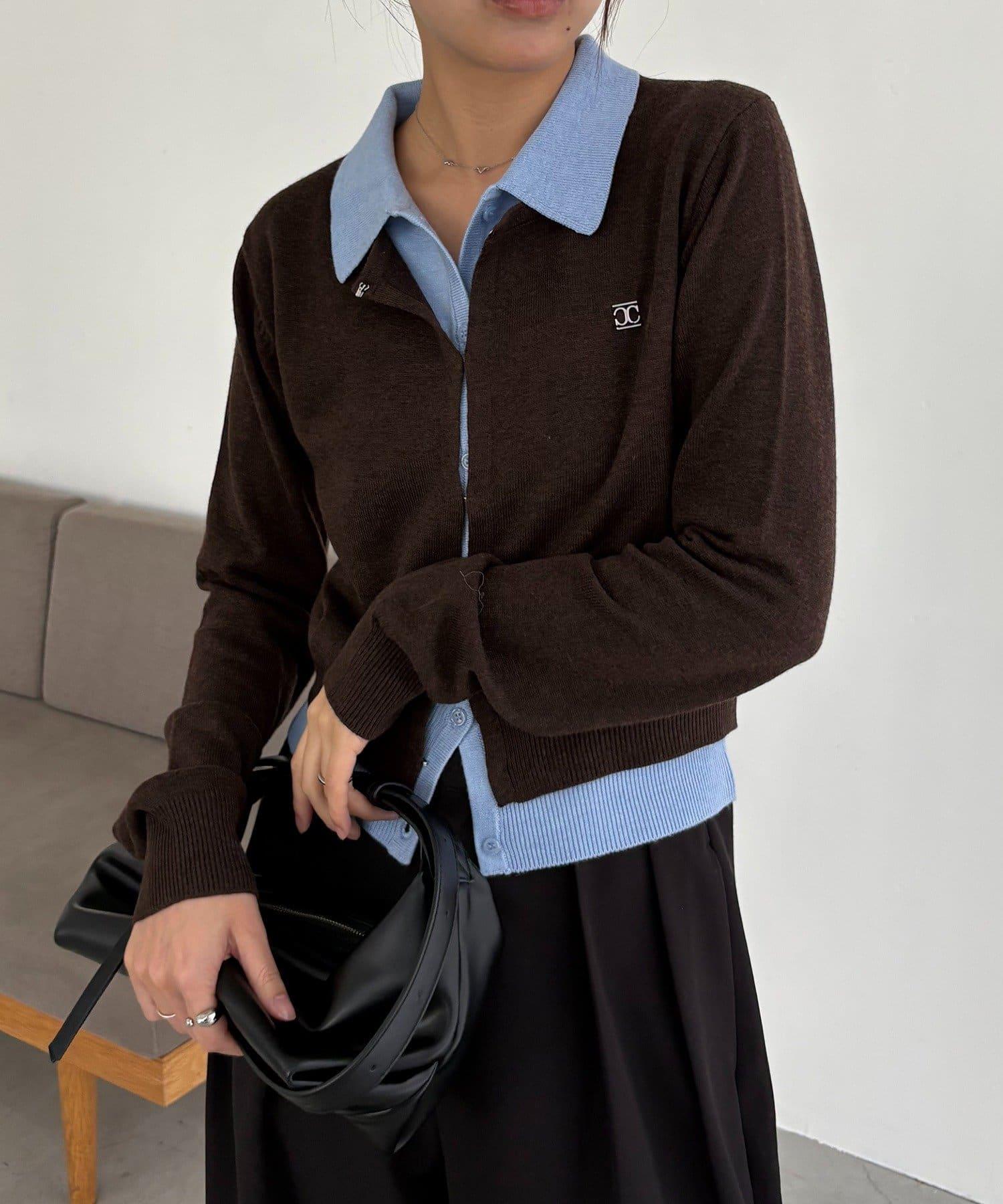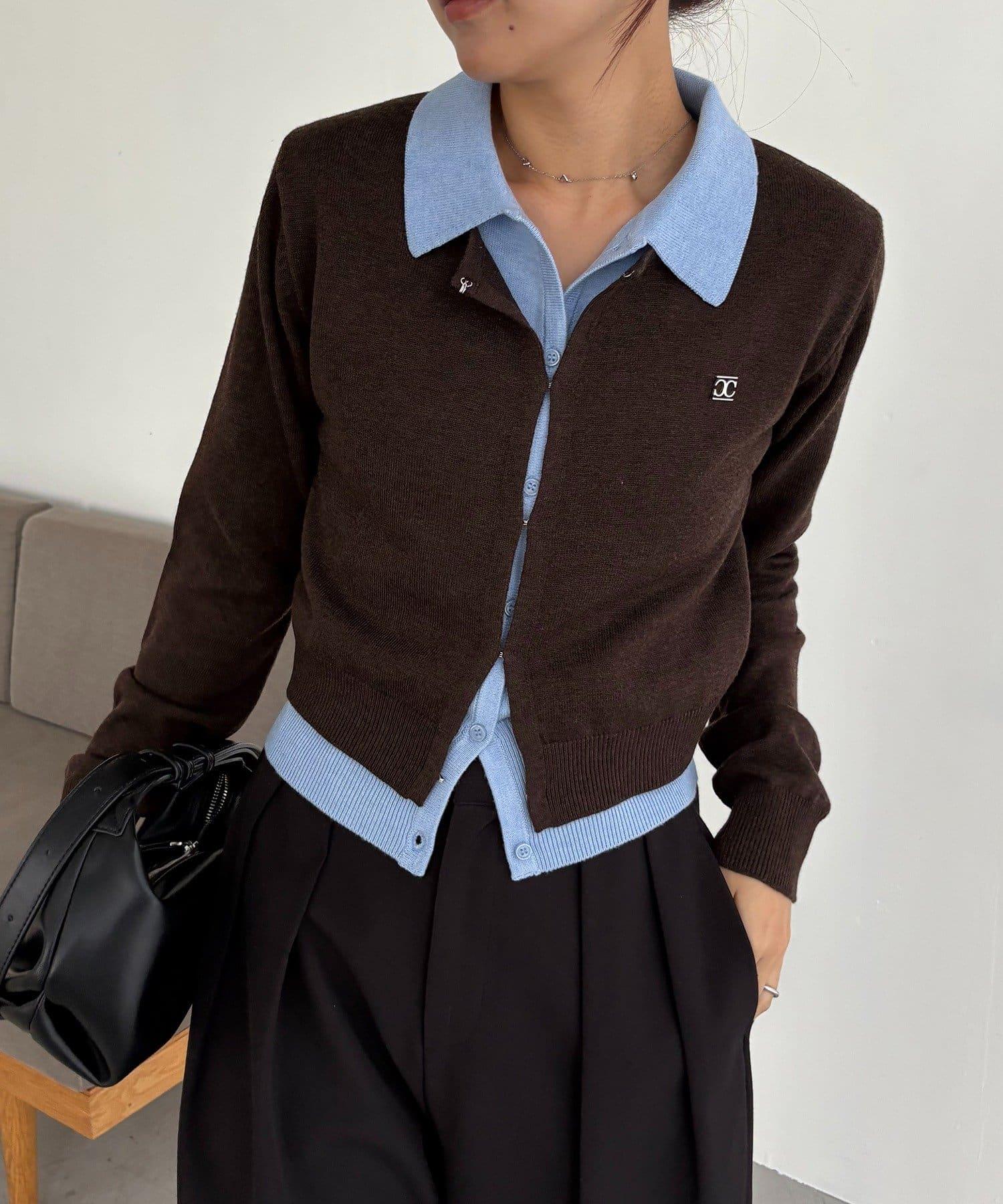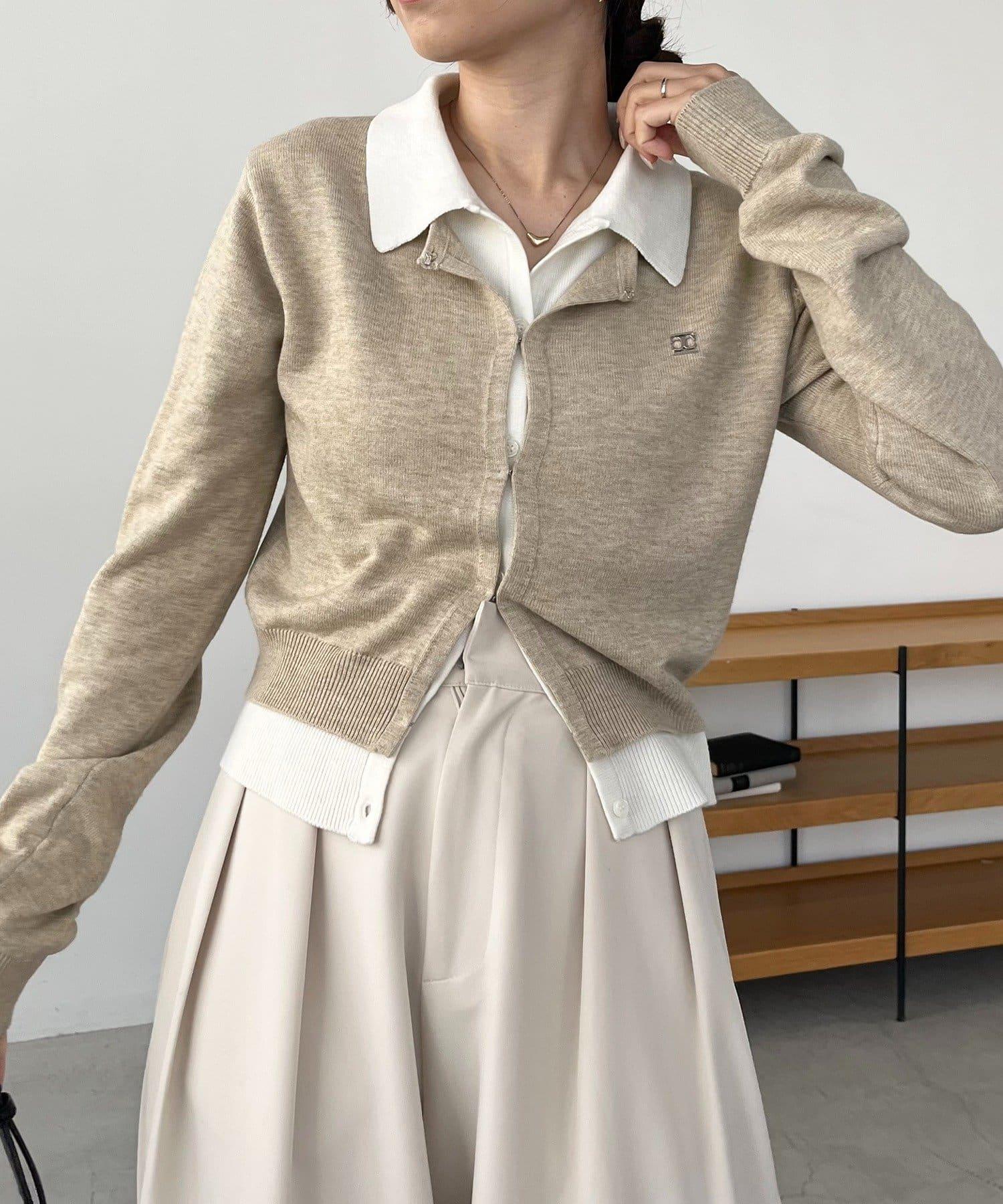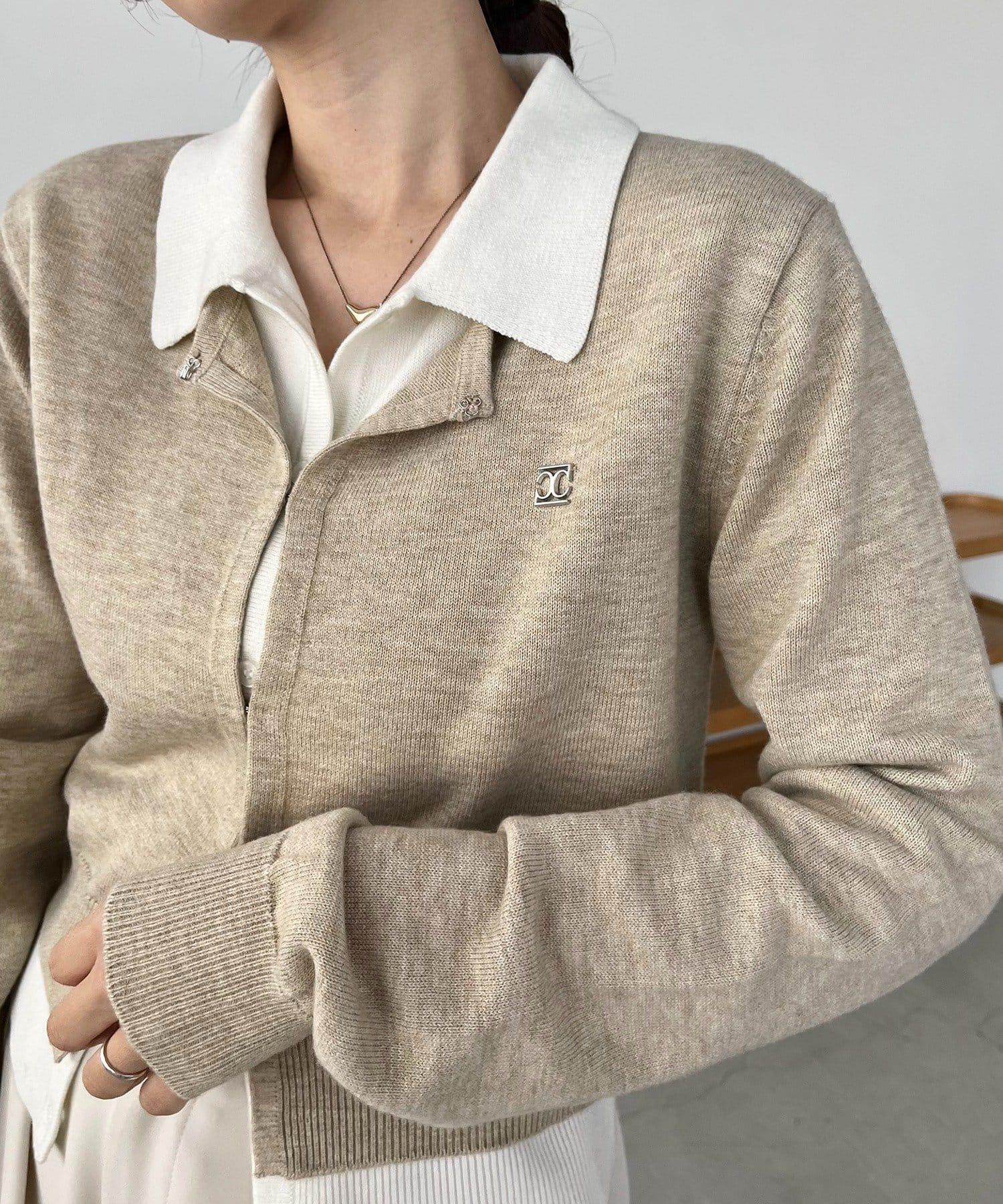 在有領針織衫上疊加鉤扣開衫的正裝單品。