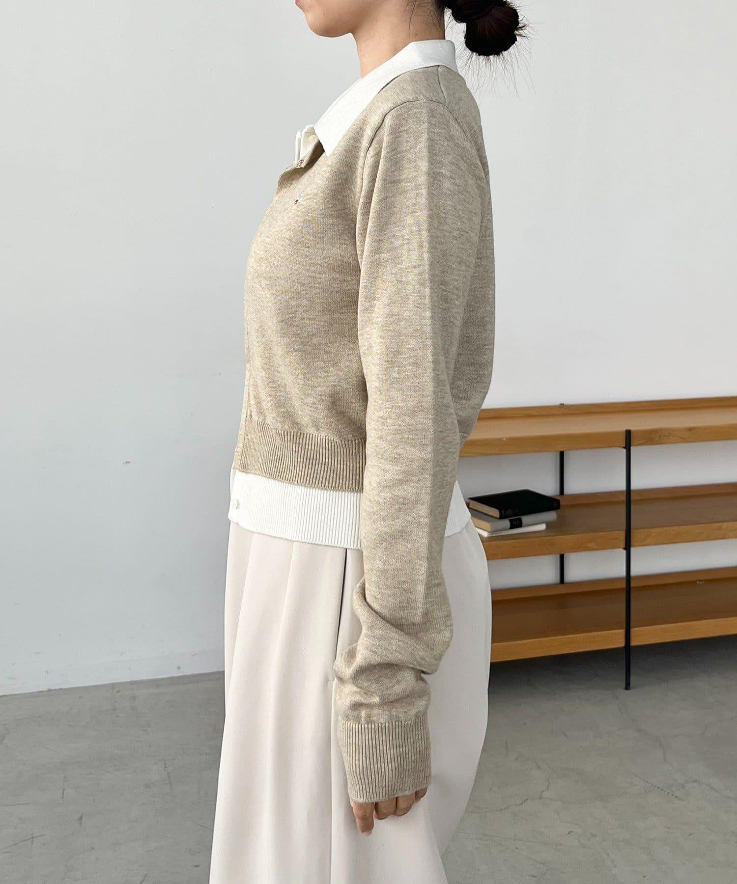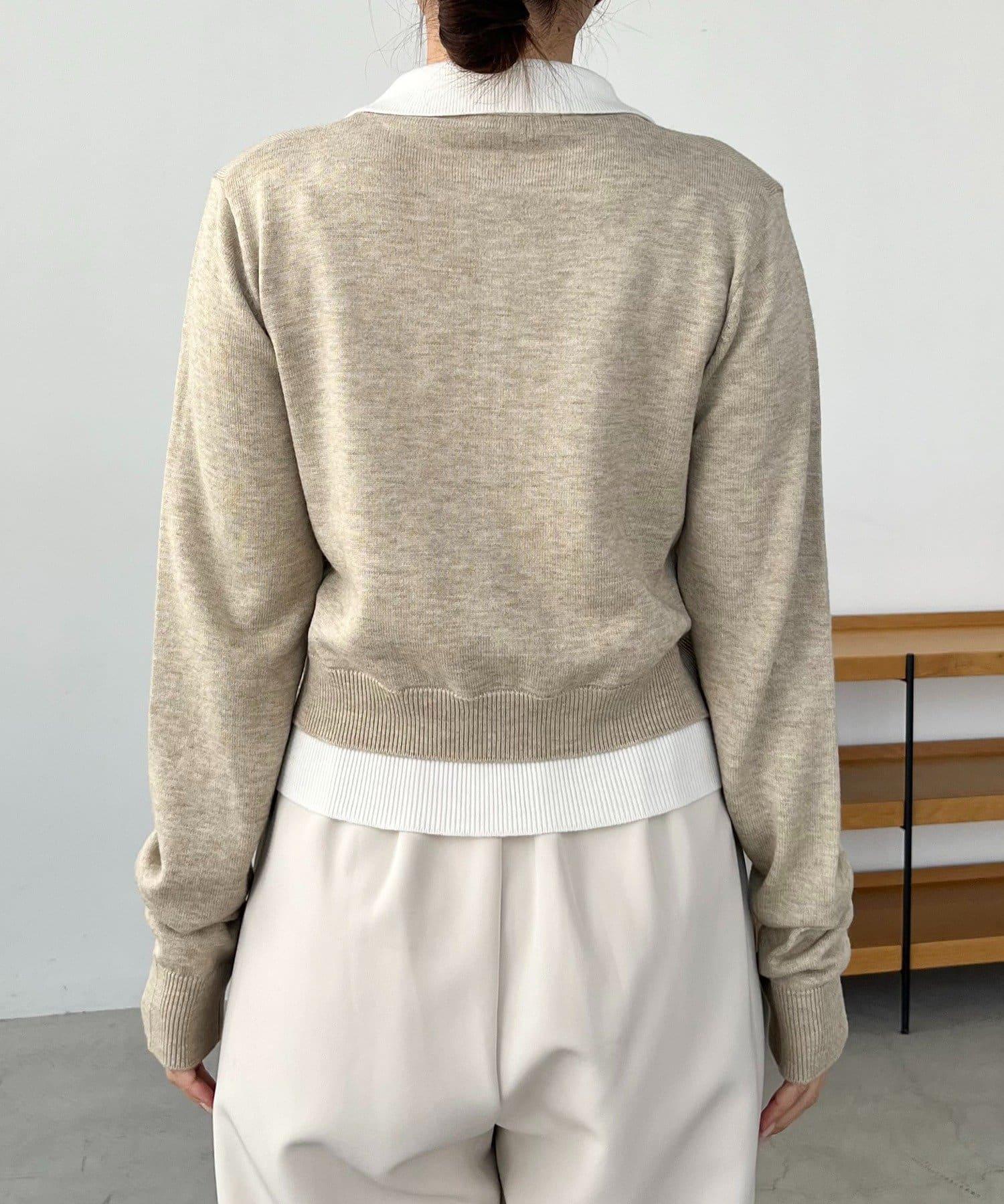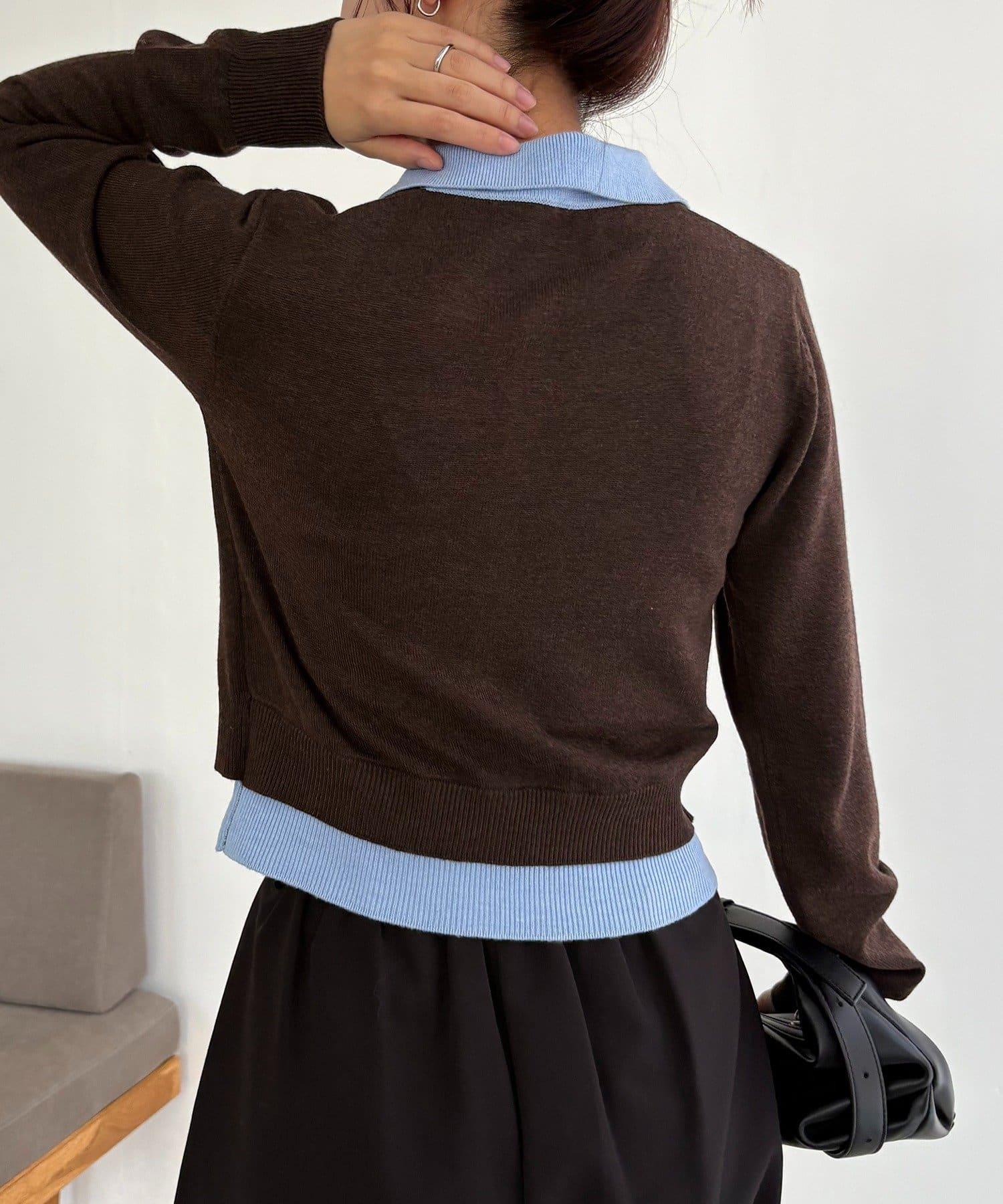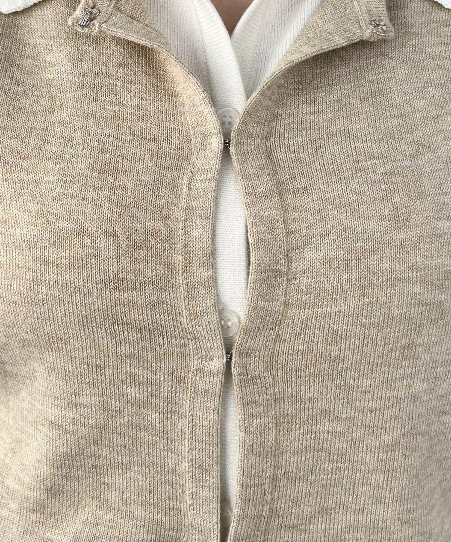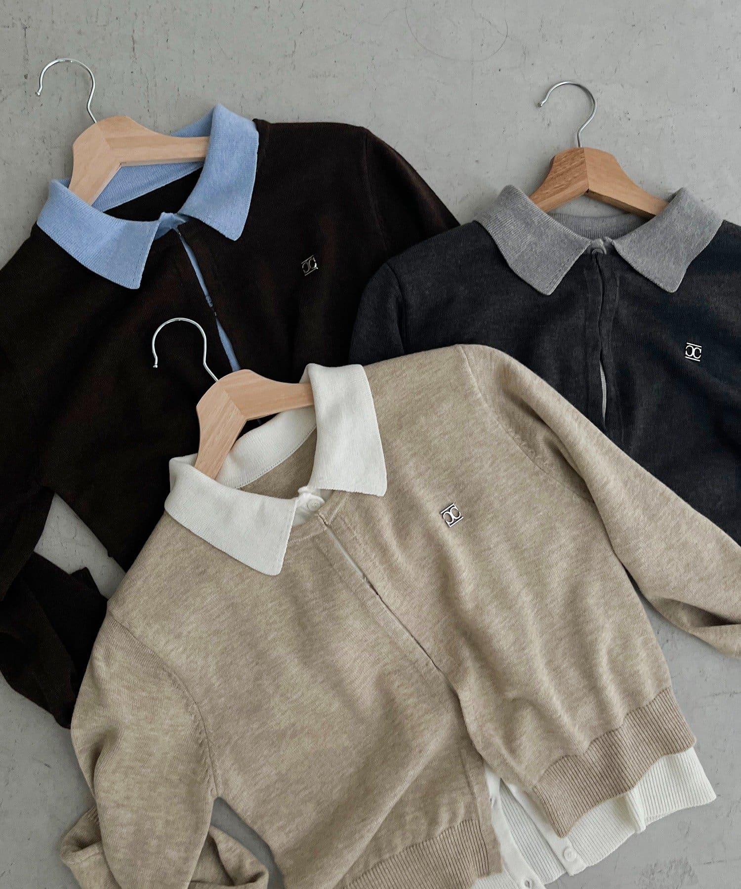 在有領針織衫上疊加鉤扣開衫的正裝單品。