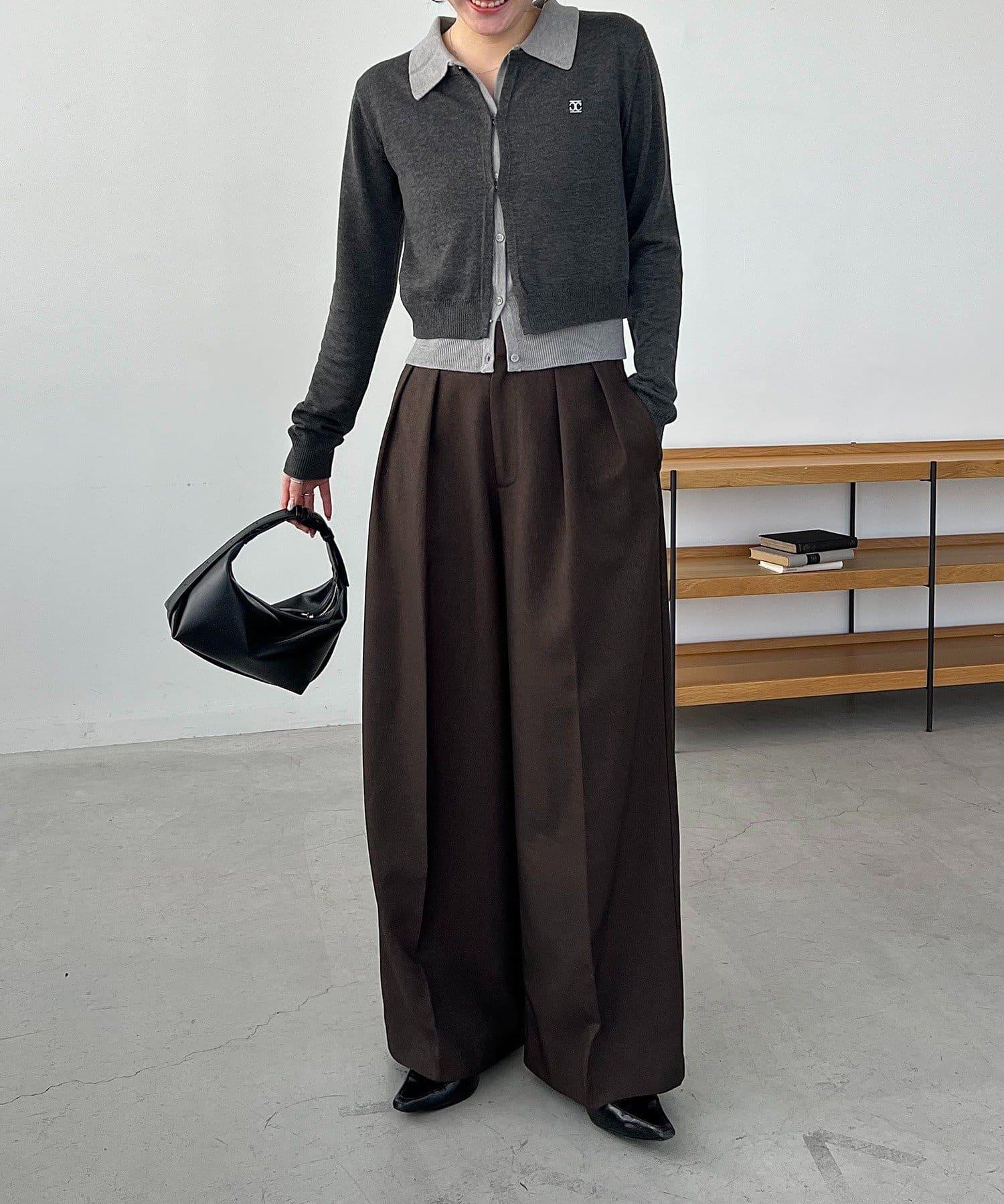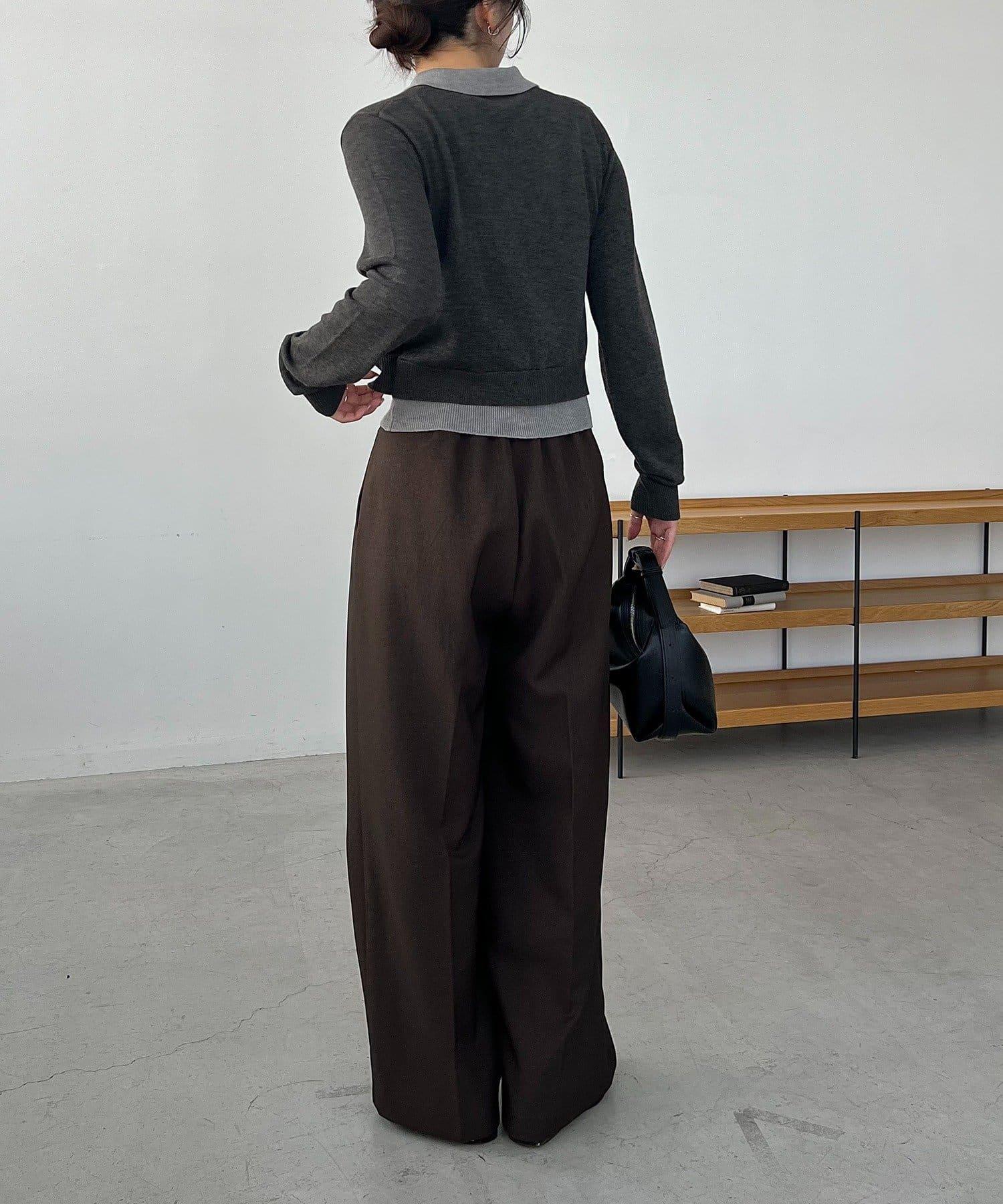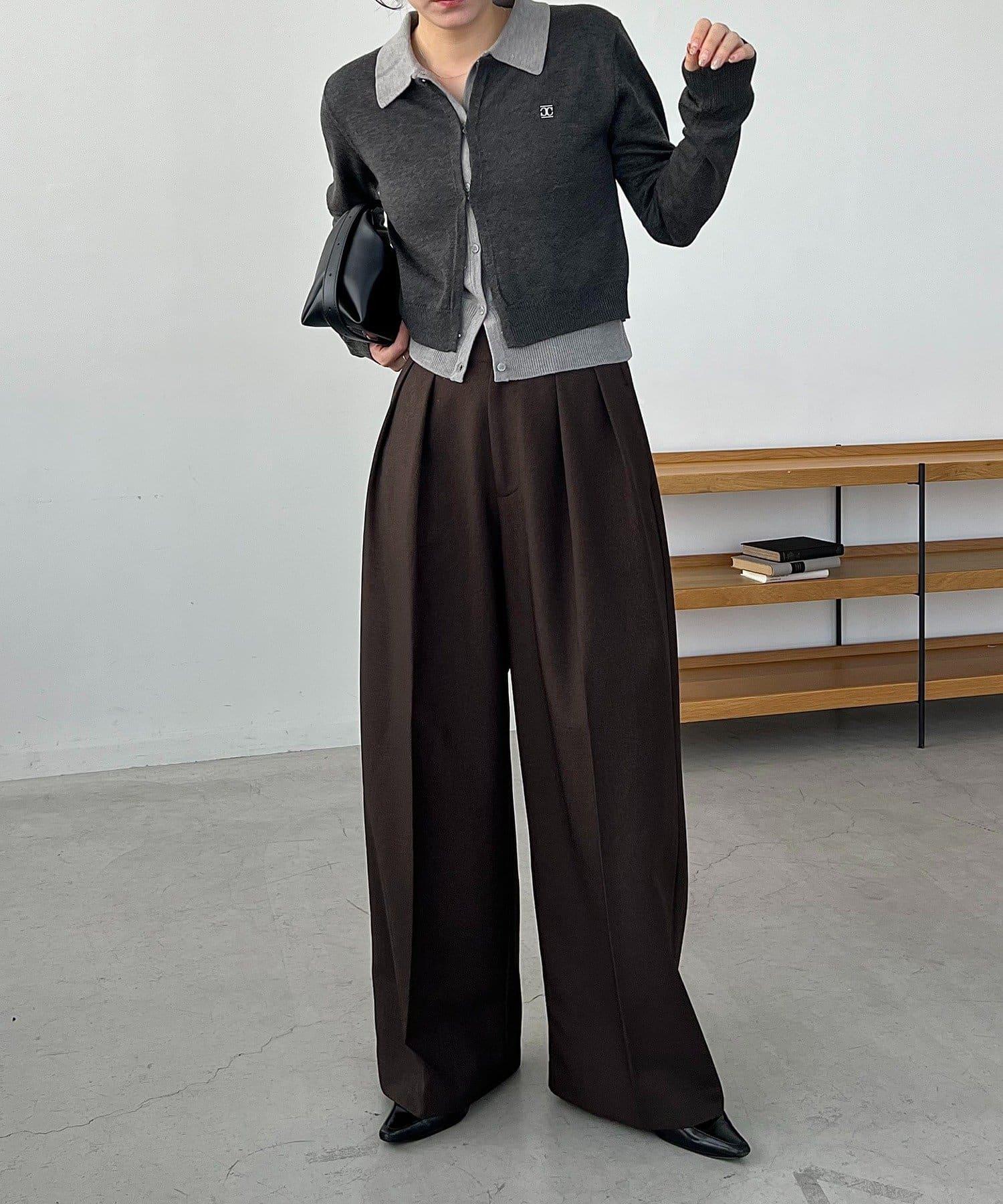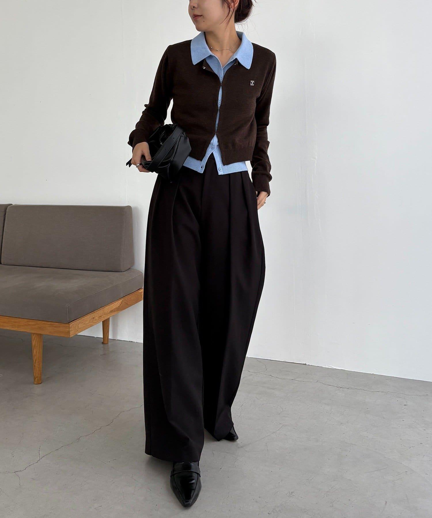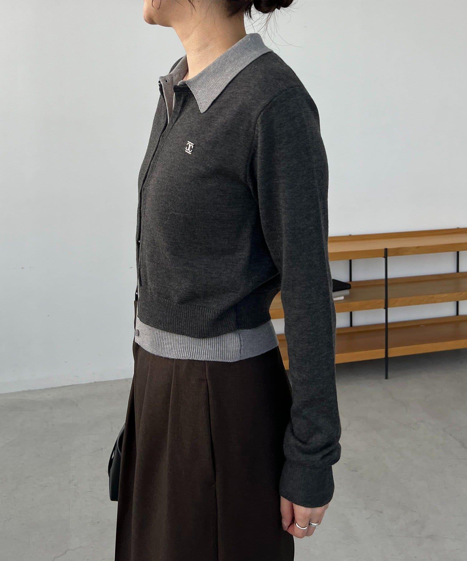 在有領針織衫上疊加鉤扣開衫的正裝單品。