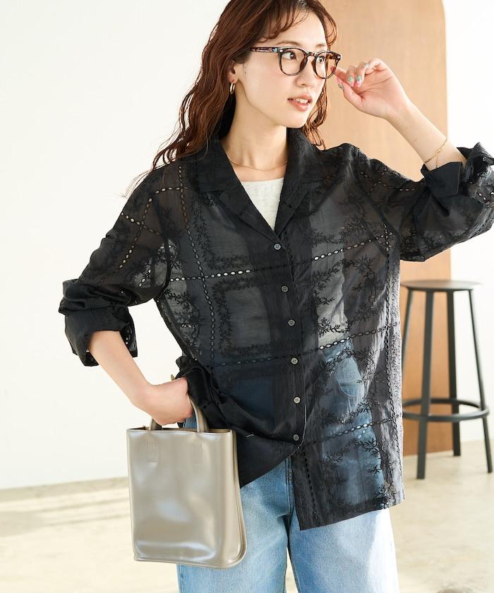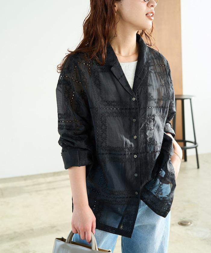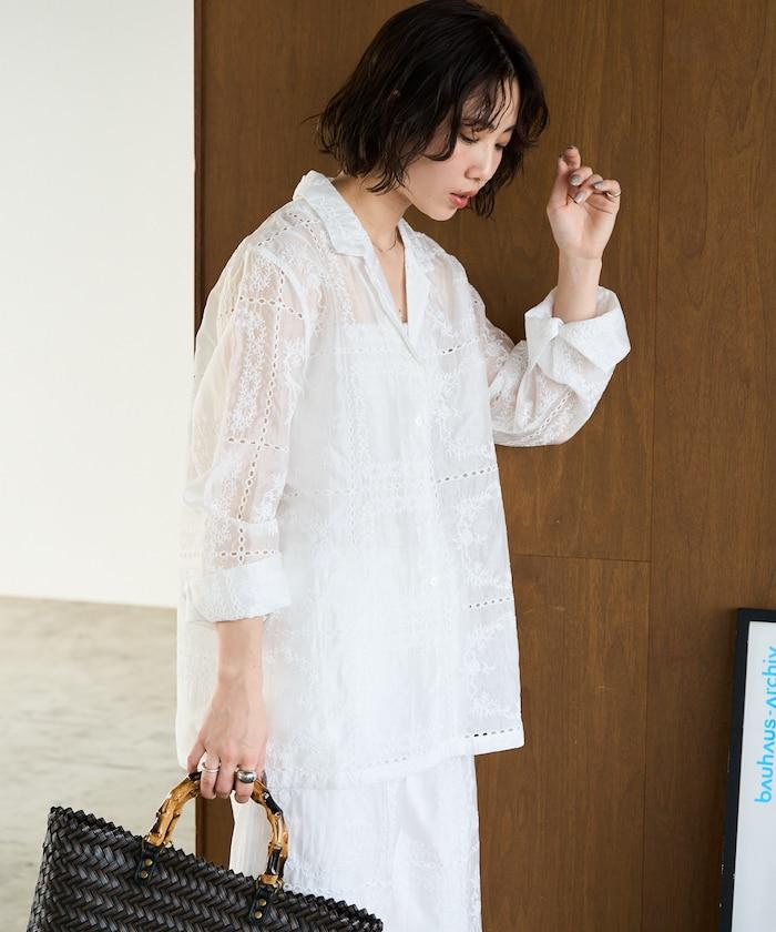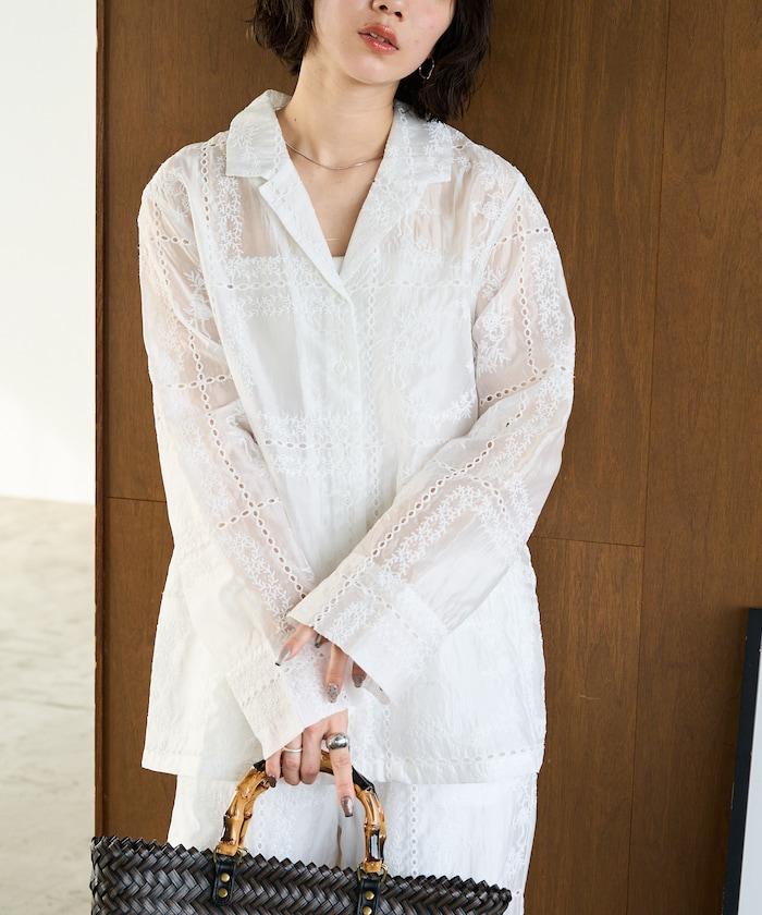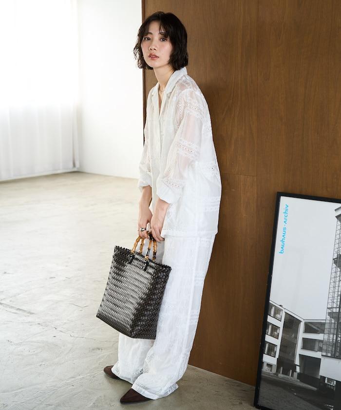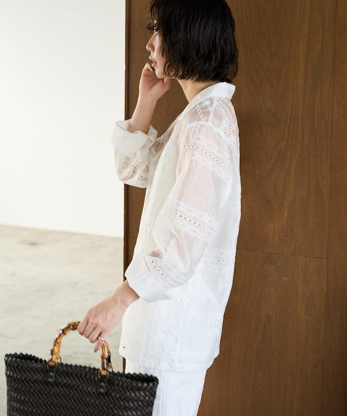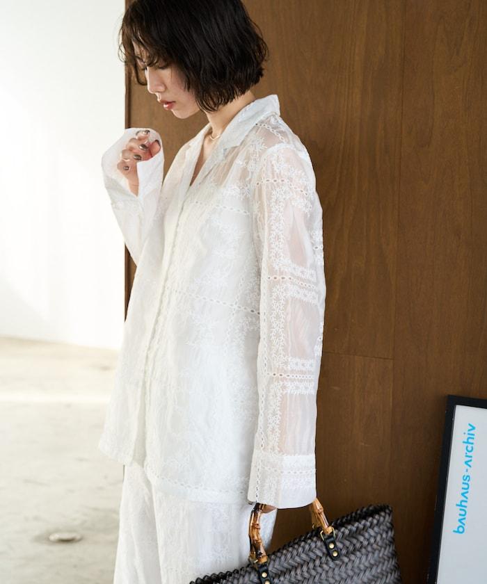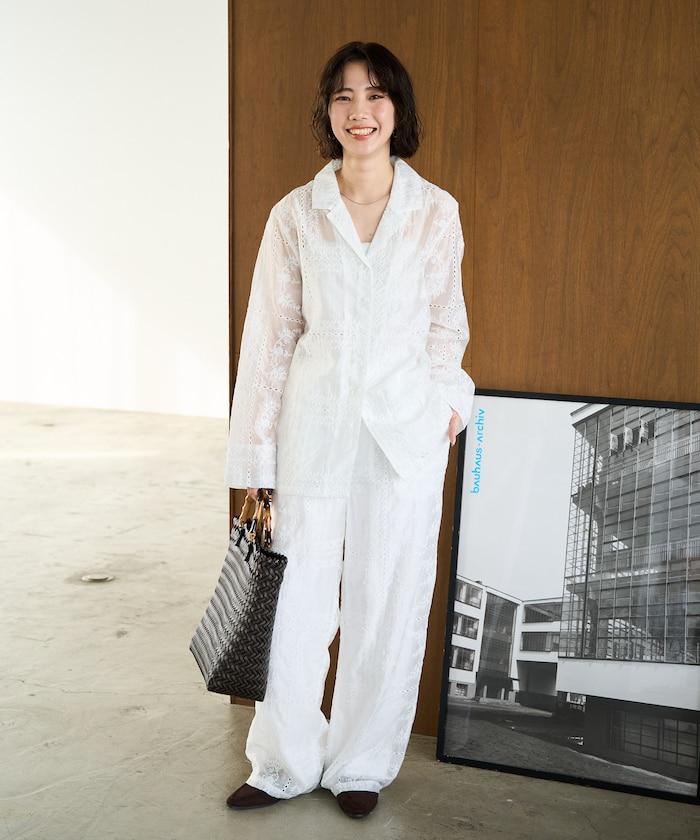 搭配同款長褲(貨號),風格統一,充分展現刺繡的魅力。手腕上的精緻配飾為造型增添了一抹優雅。