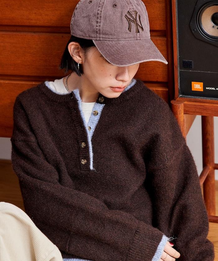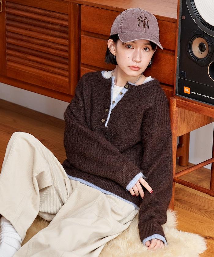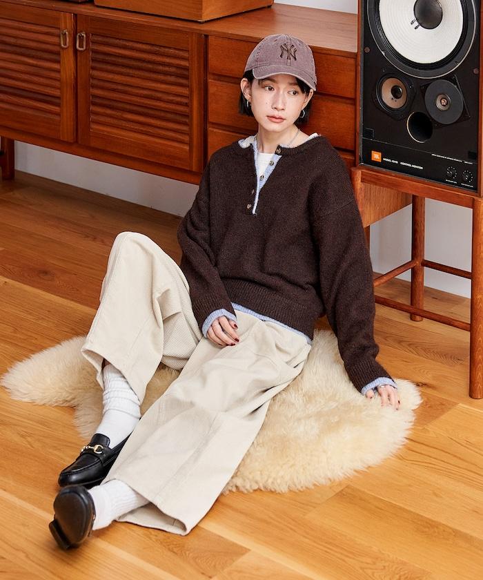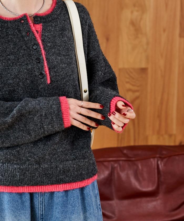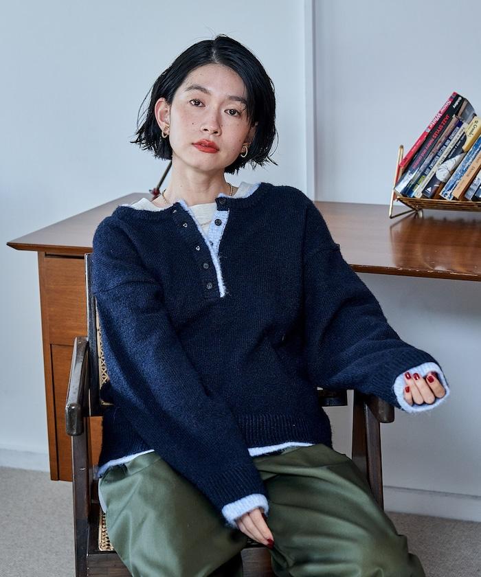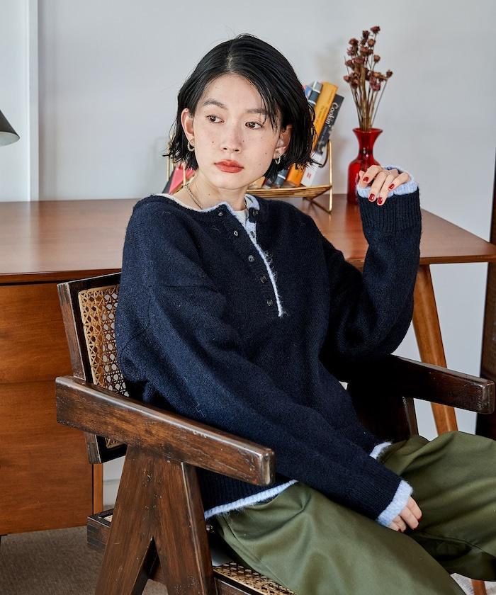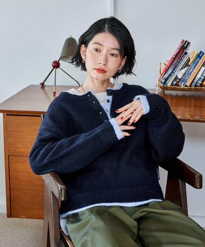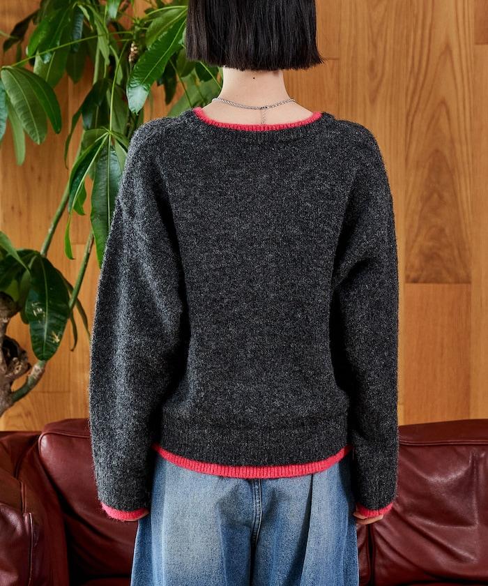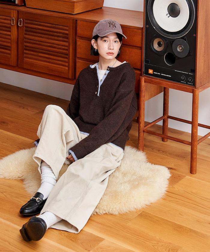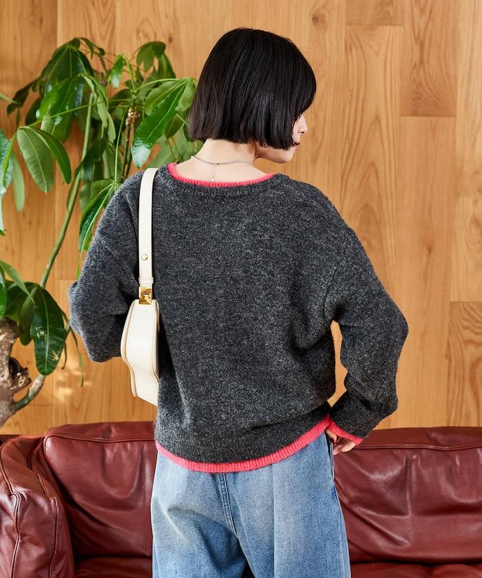 這款針織套頭衫巧妙地融入了今年流行的配色設計和雞心領設計,給人一種微妙的現代感。