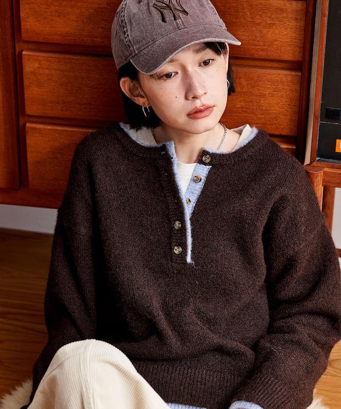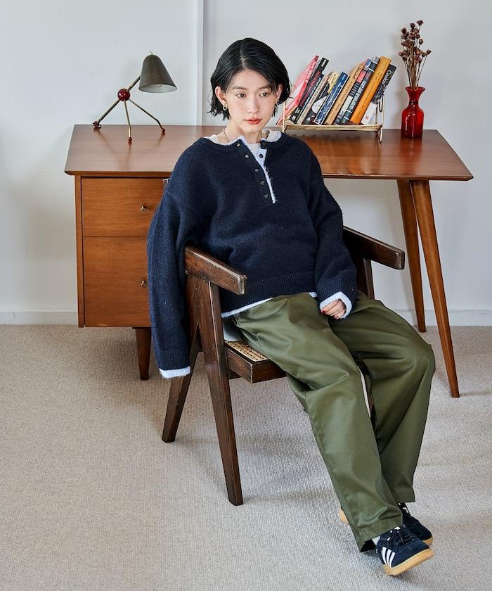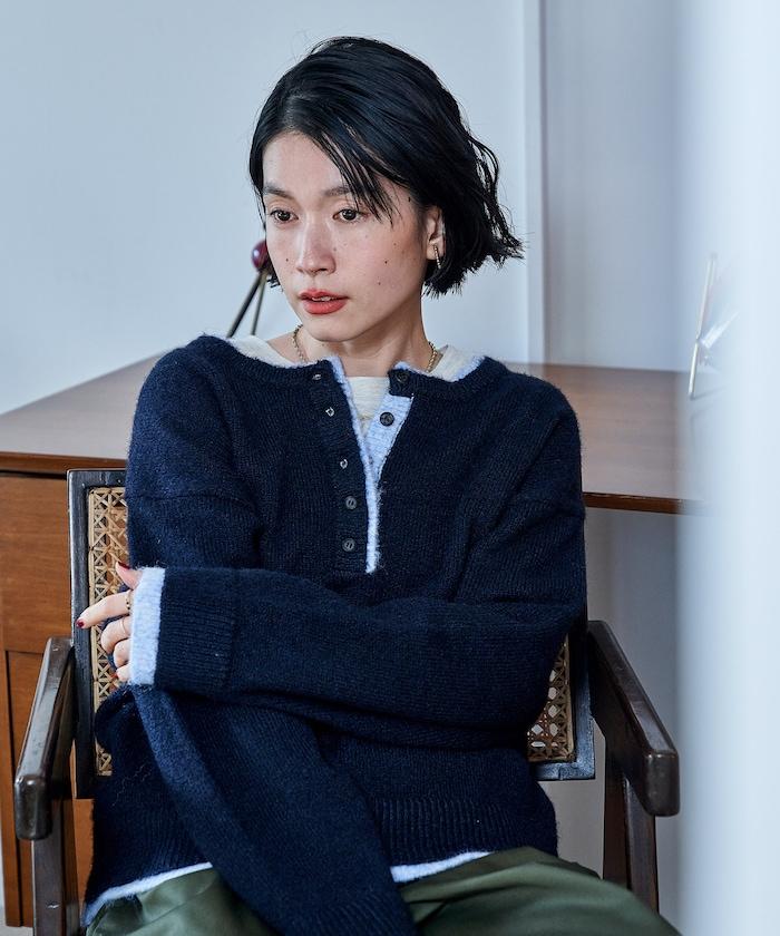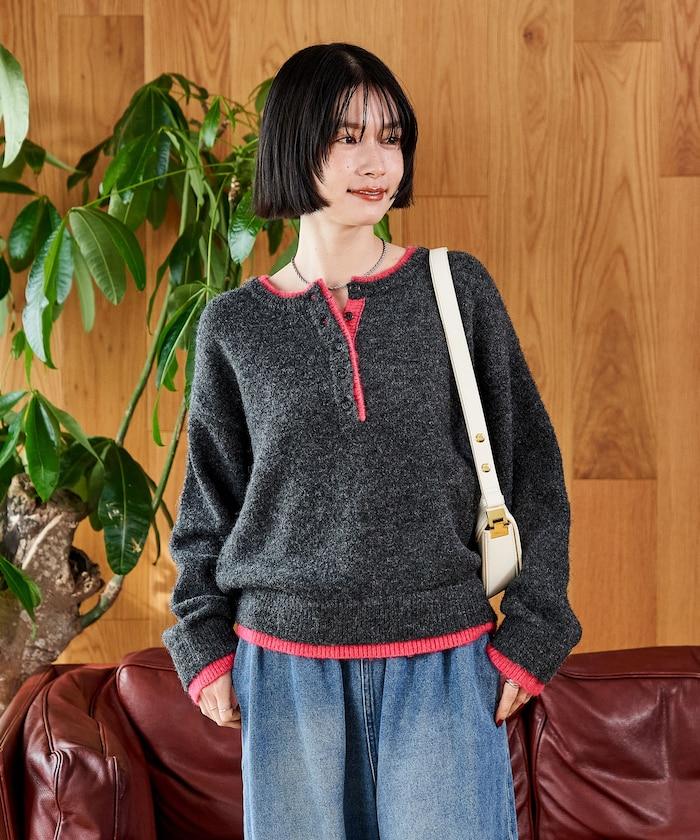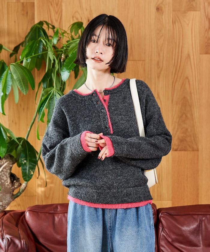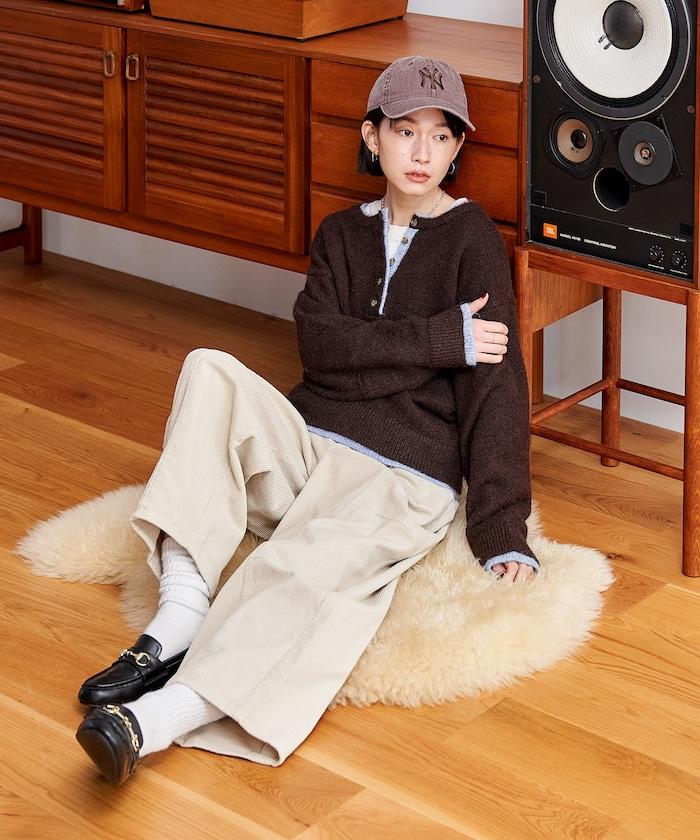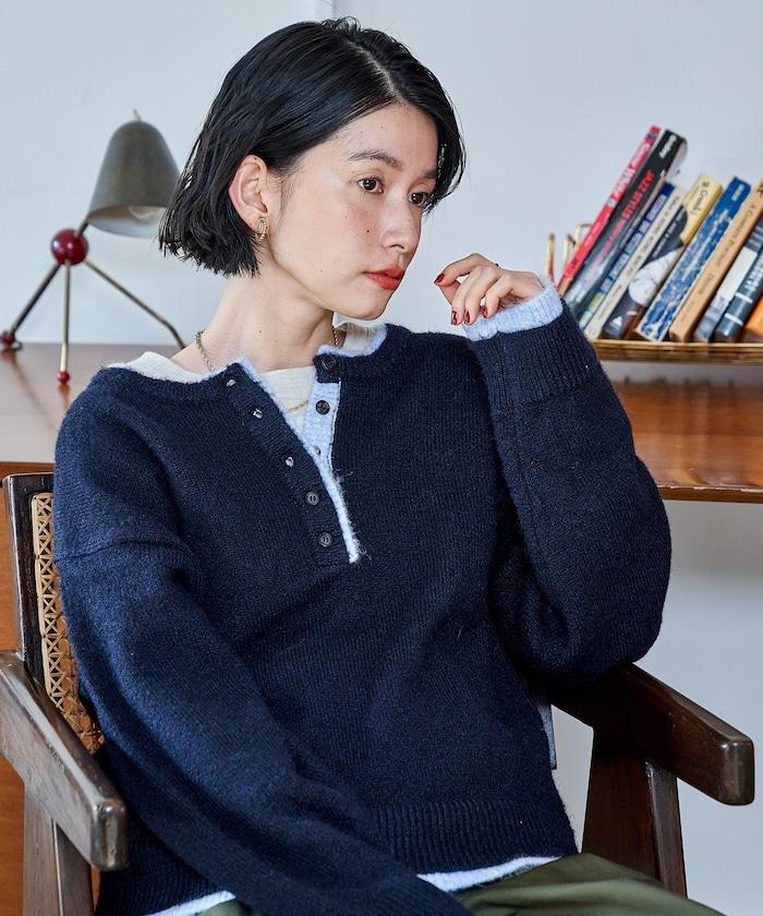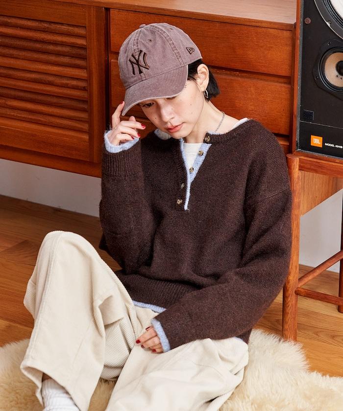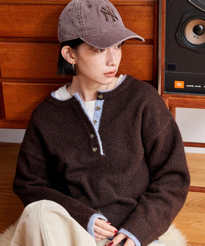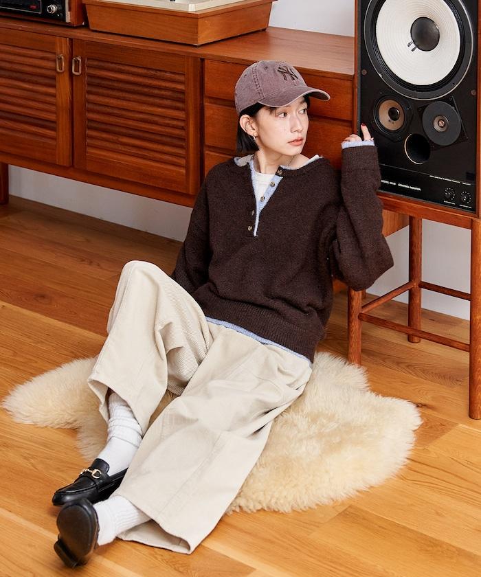 這款針織套頭衫巧妙地融入了今年流行的配色設計和雞心領設計,給人一種微妙的現代感。