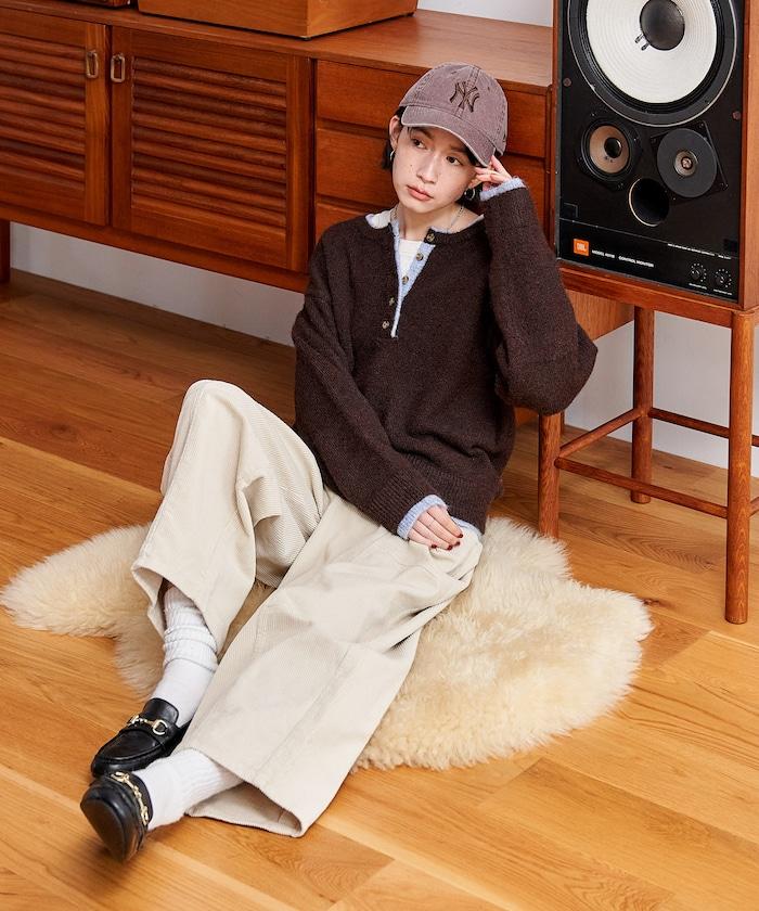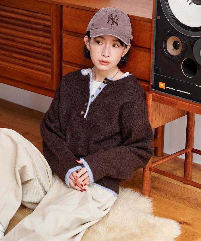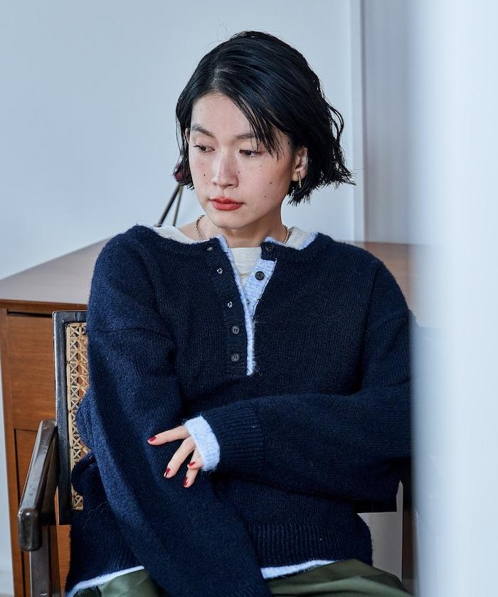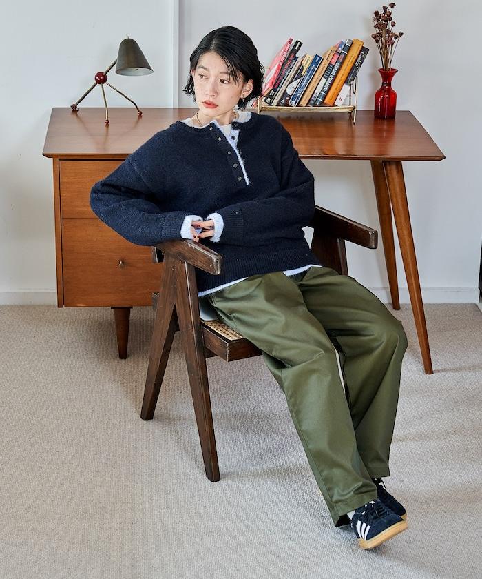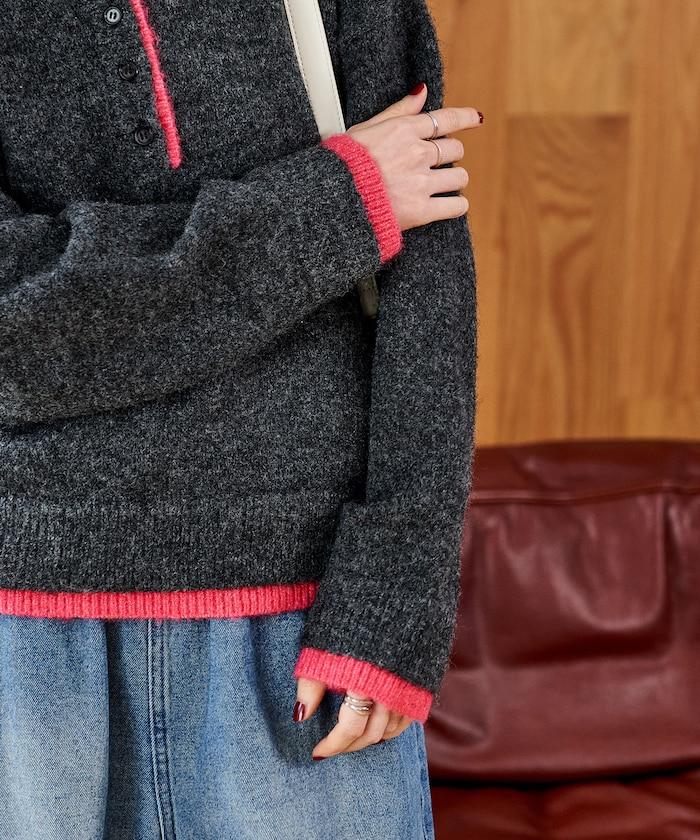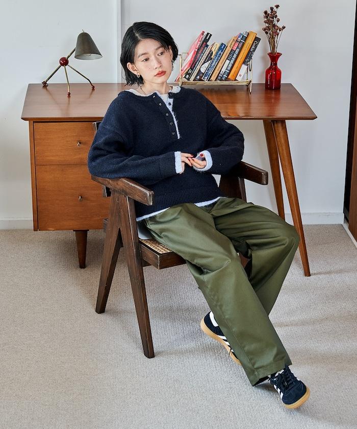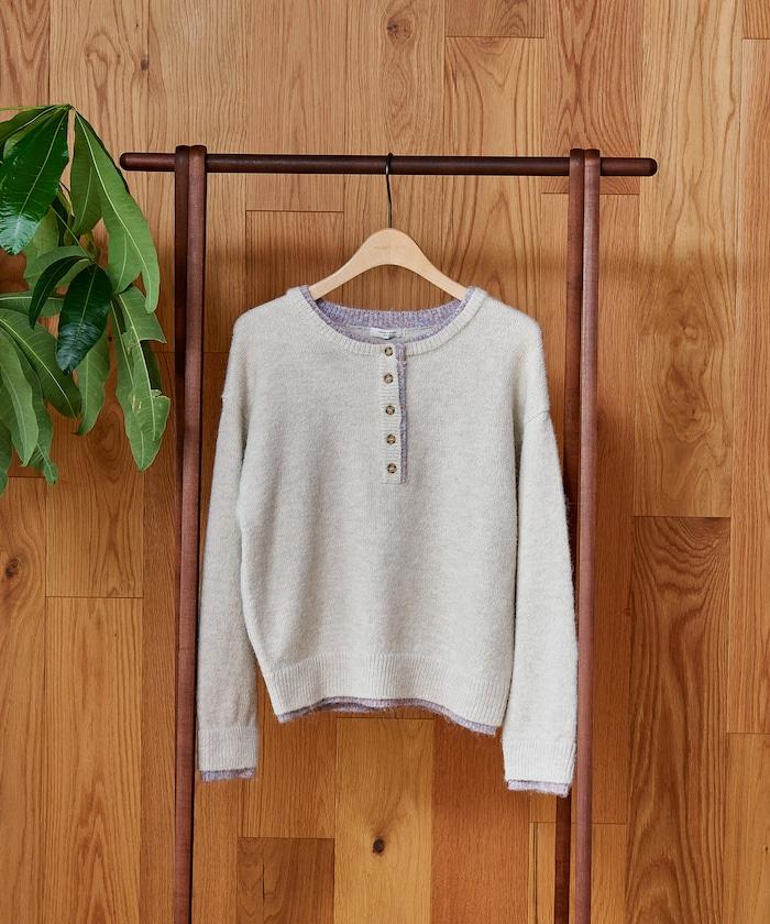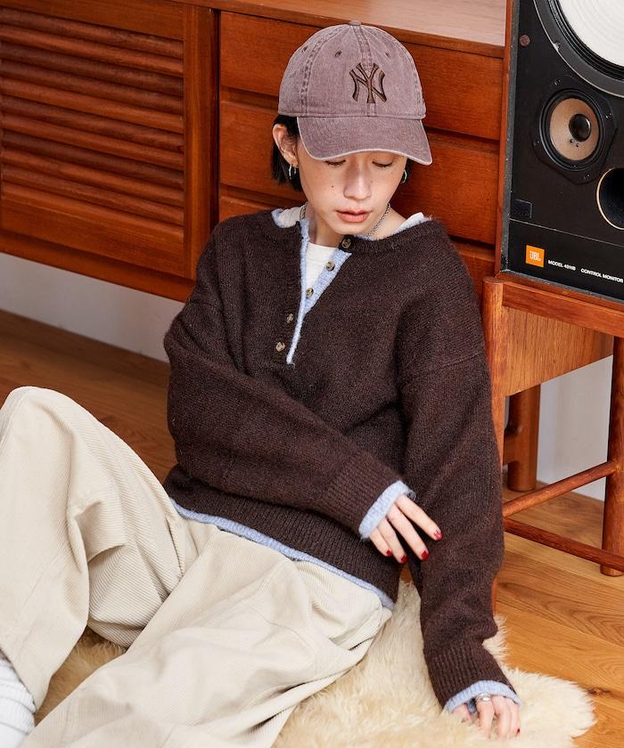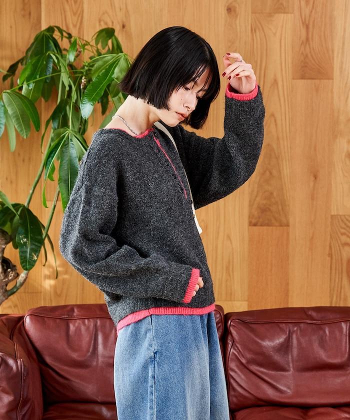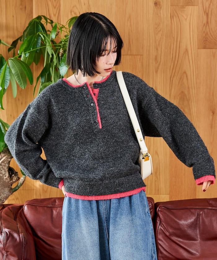 這款針織套頭衫巧妙地融入了今年流行的配色設計和雞心領設計,給人一種微妙的現代感。