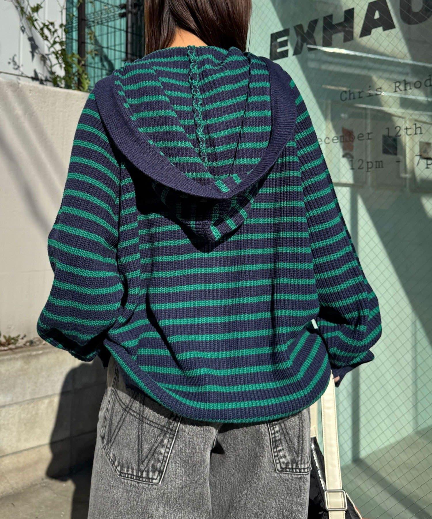 拼色條紋雙拉鍊針織連帽衫