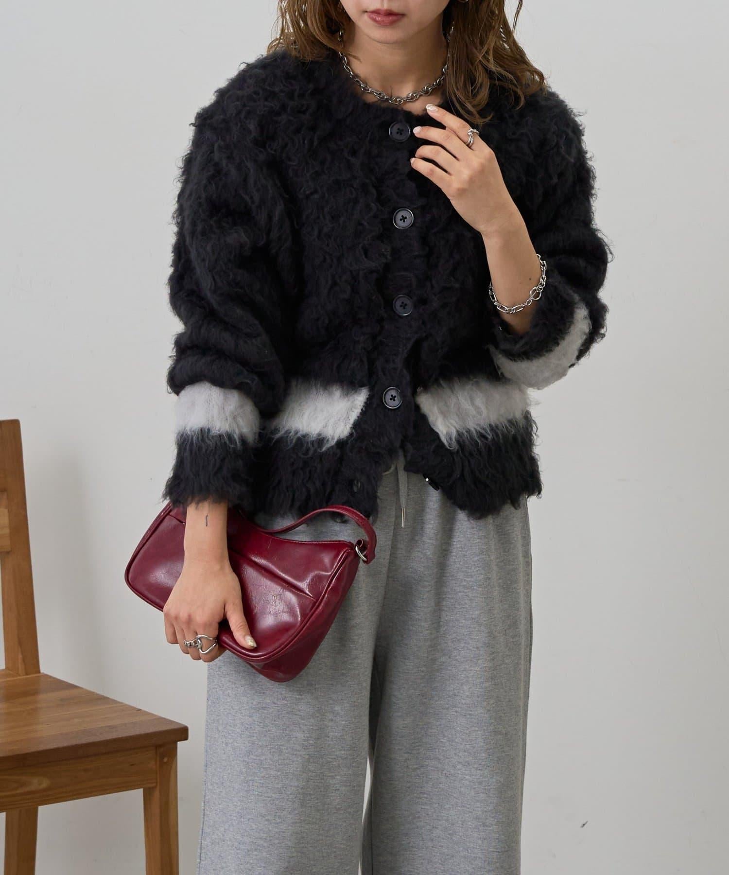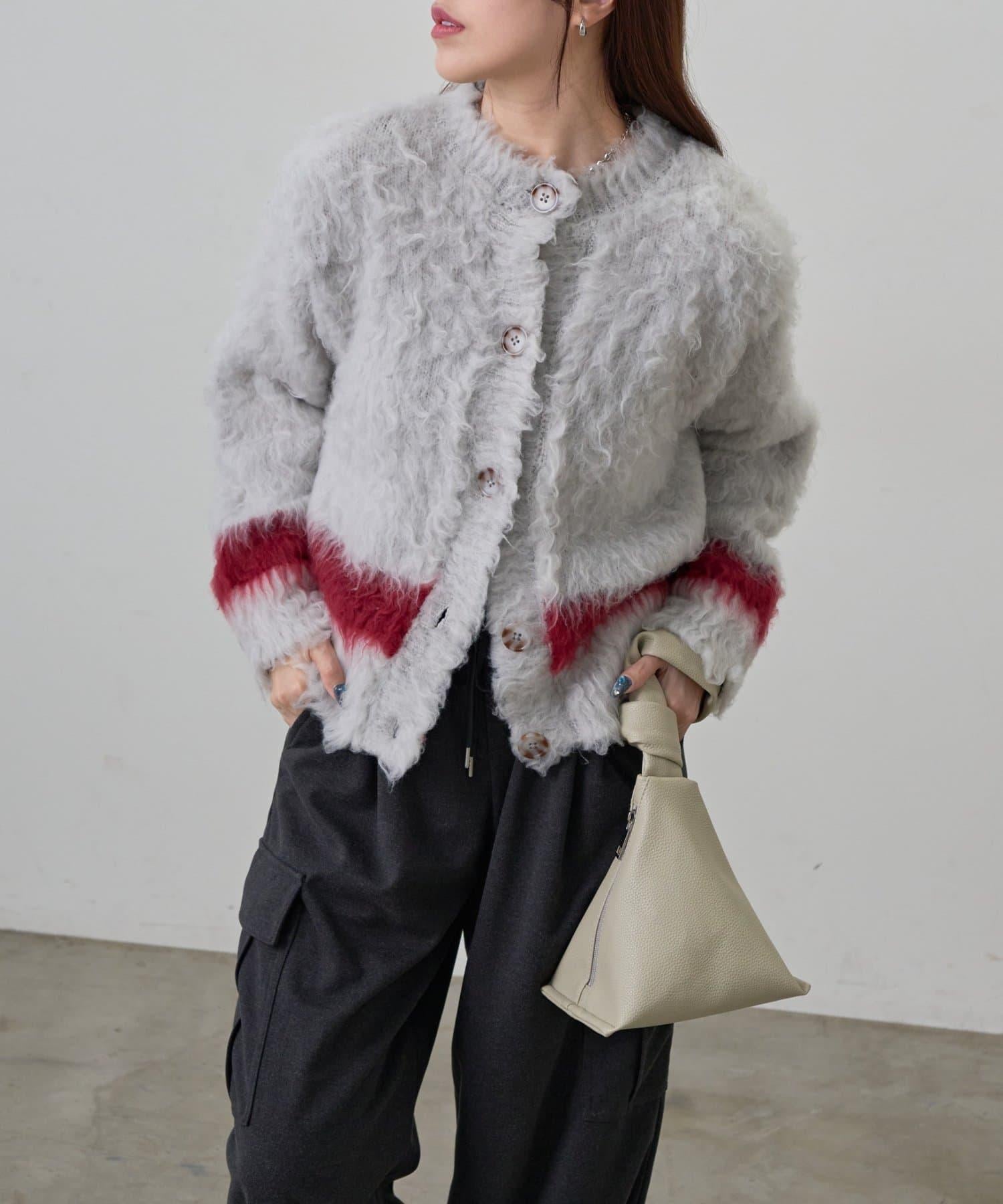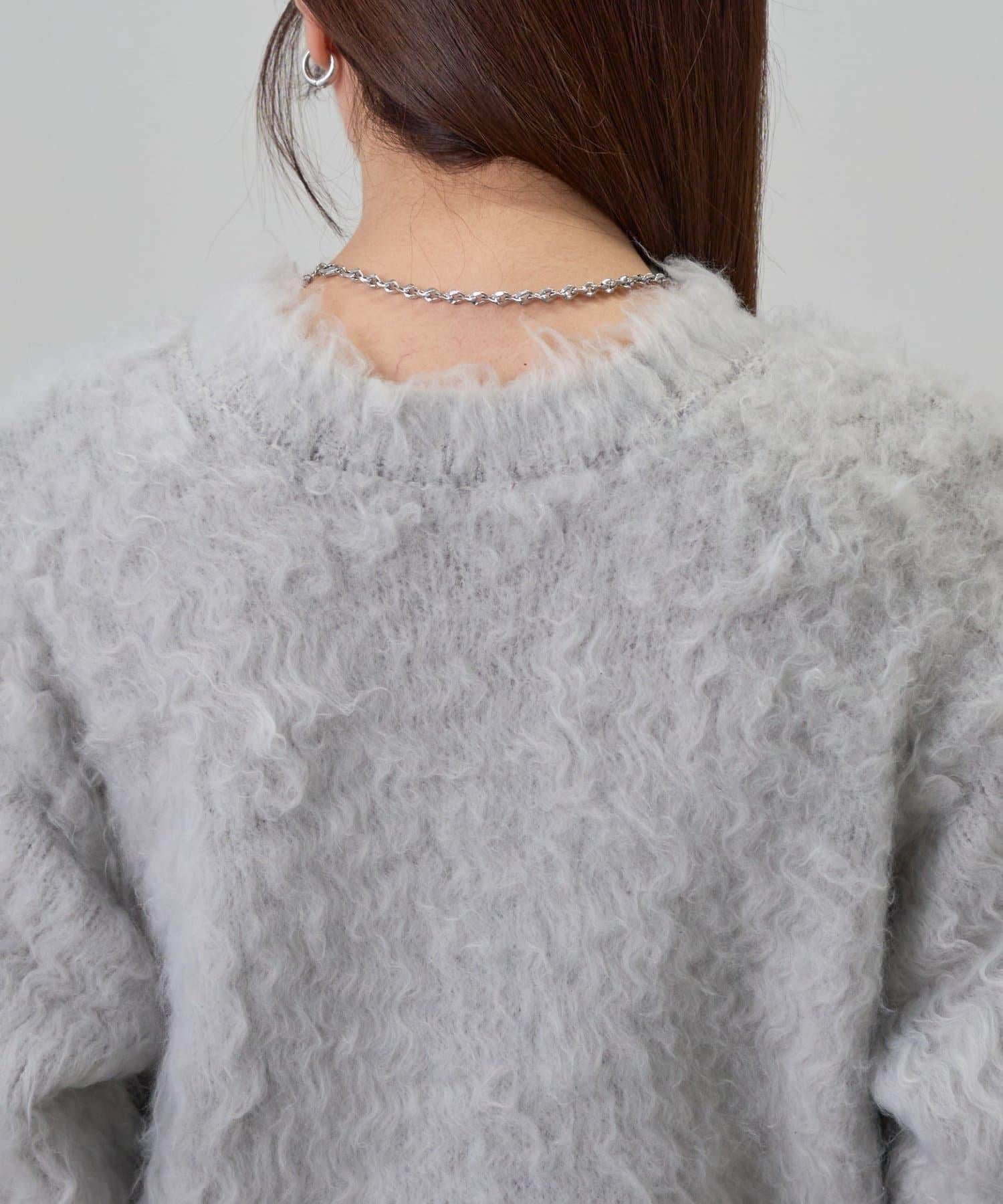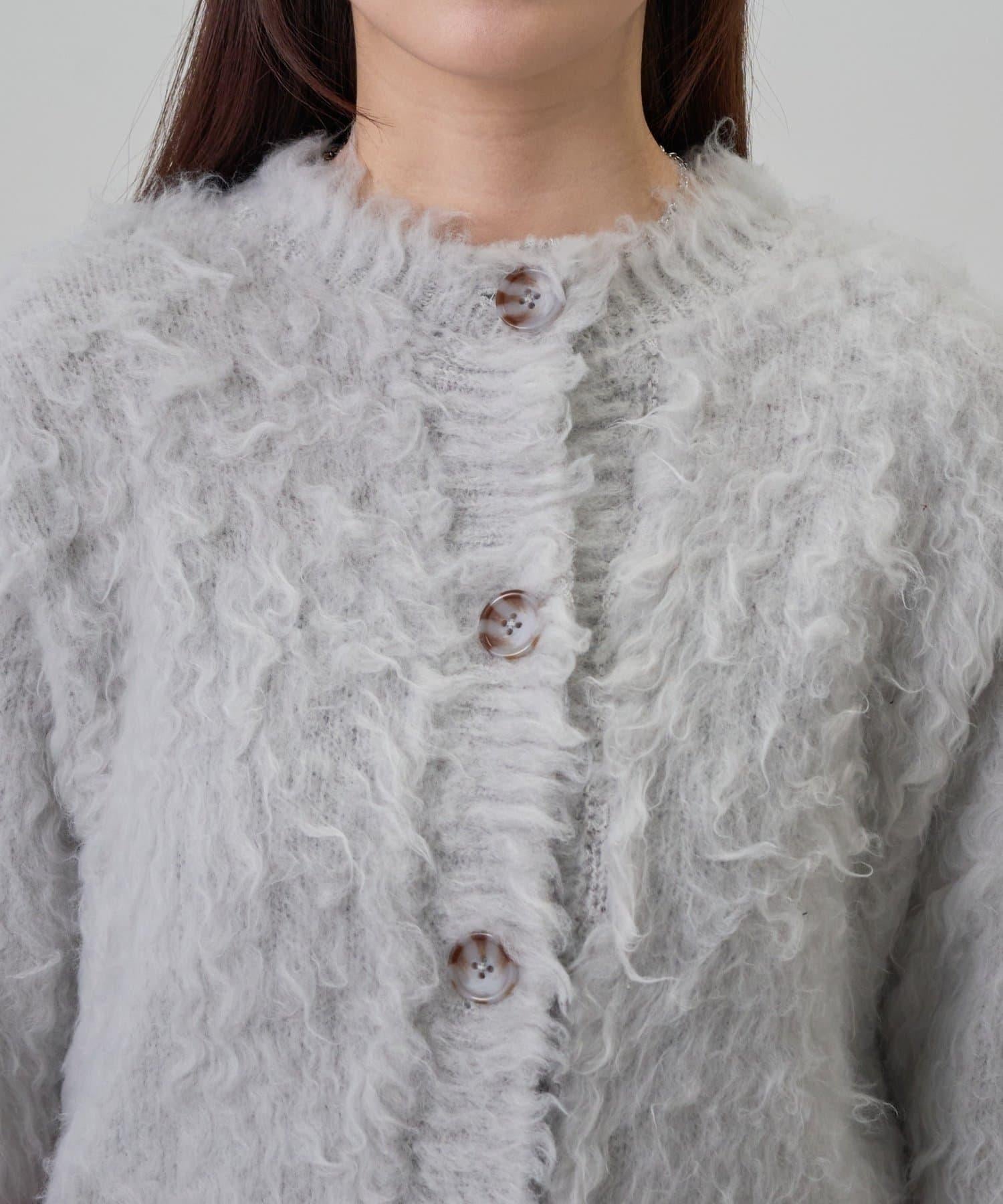 這款圓領開衫採用柔軟蓬鬆的絨毛面料製成,充滿季節感。