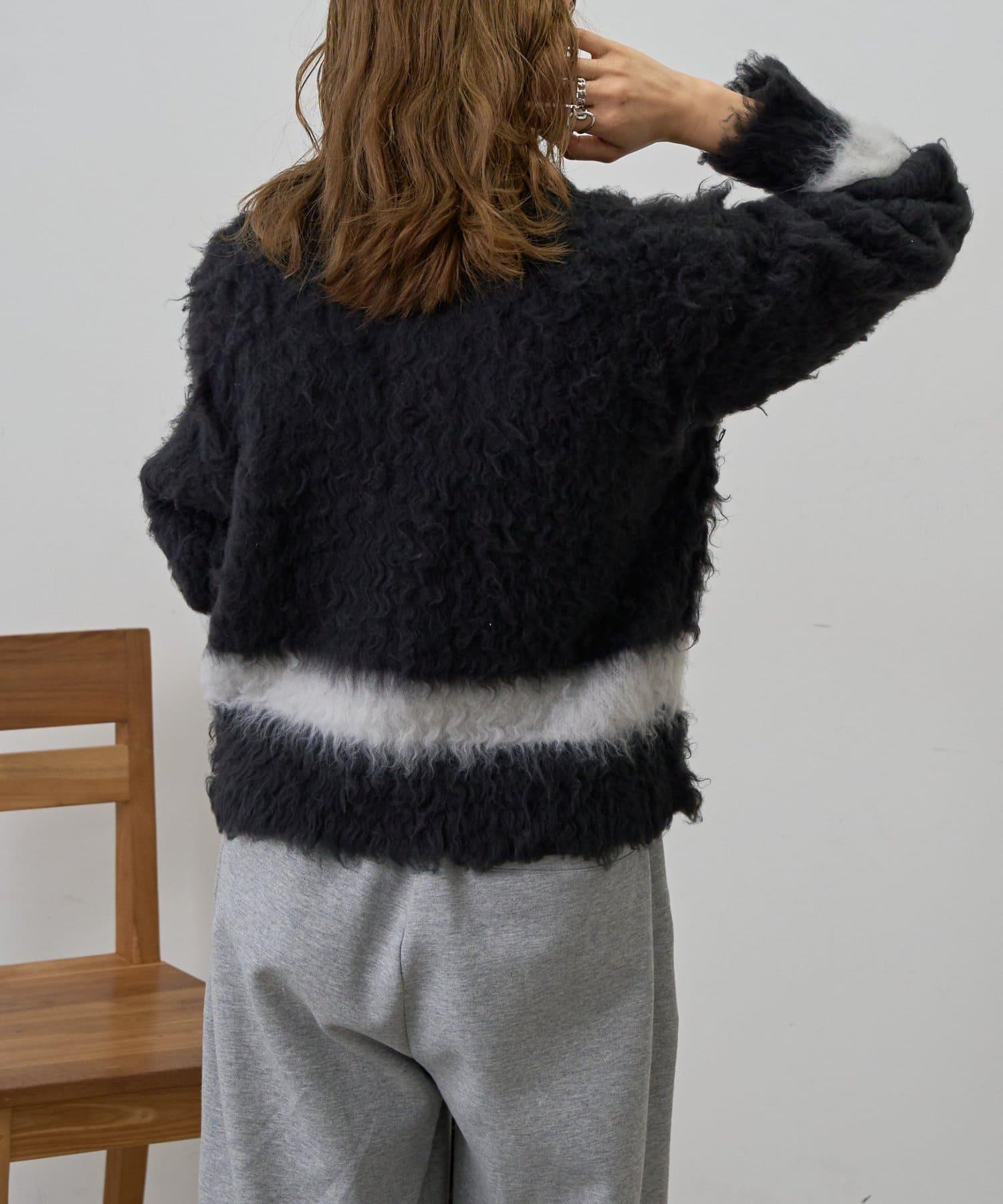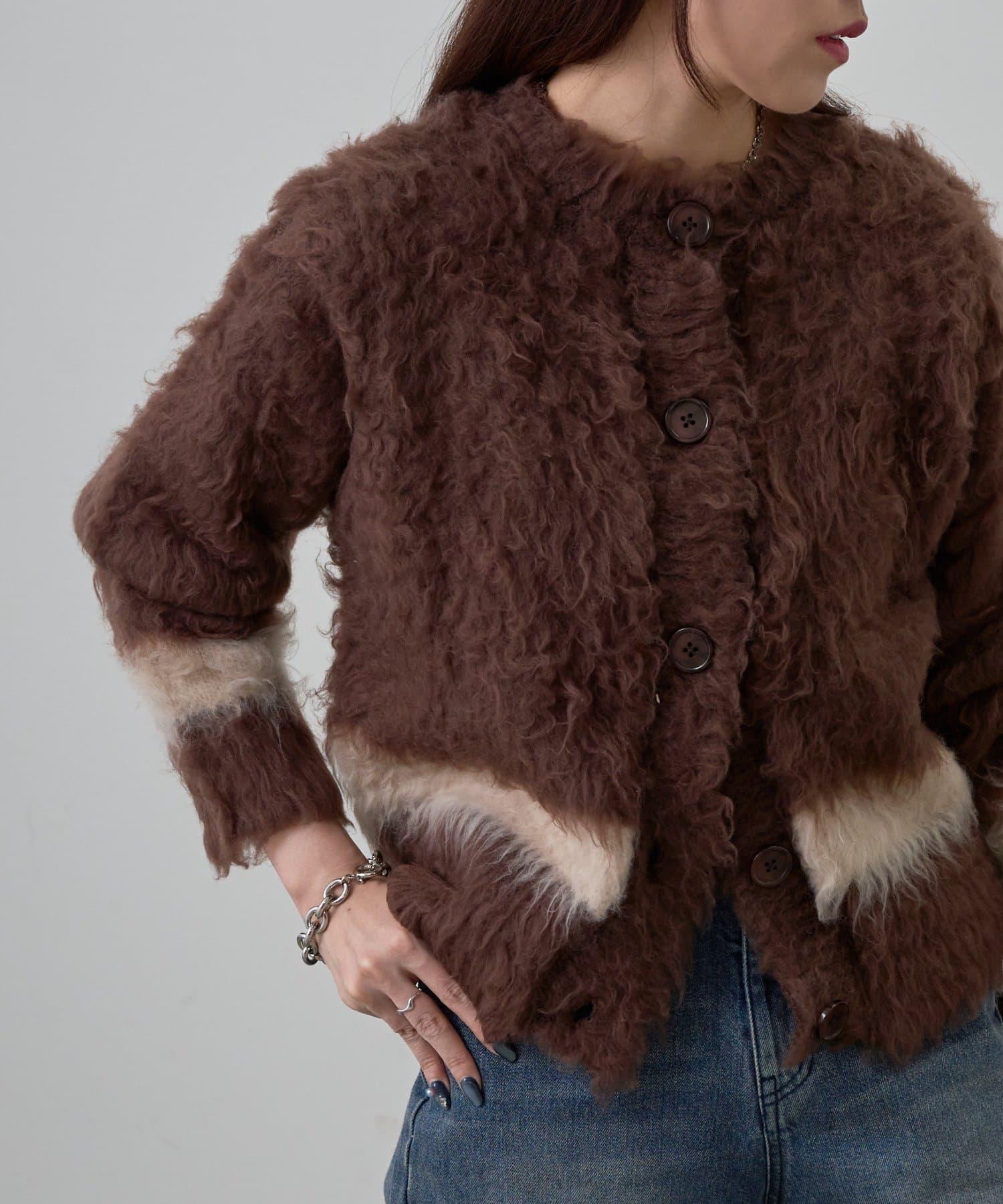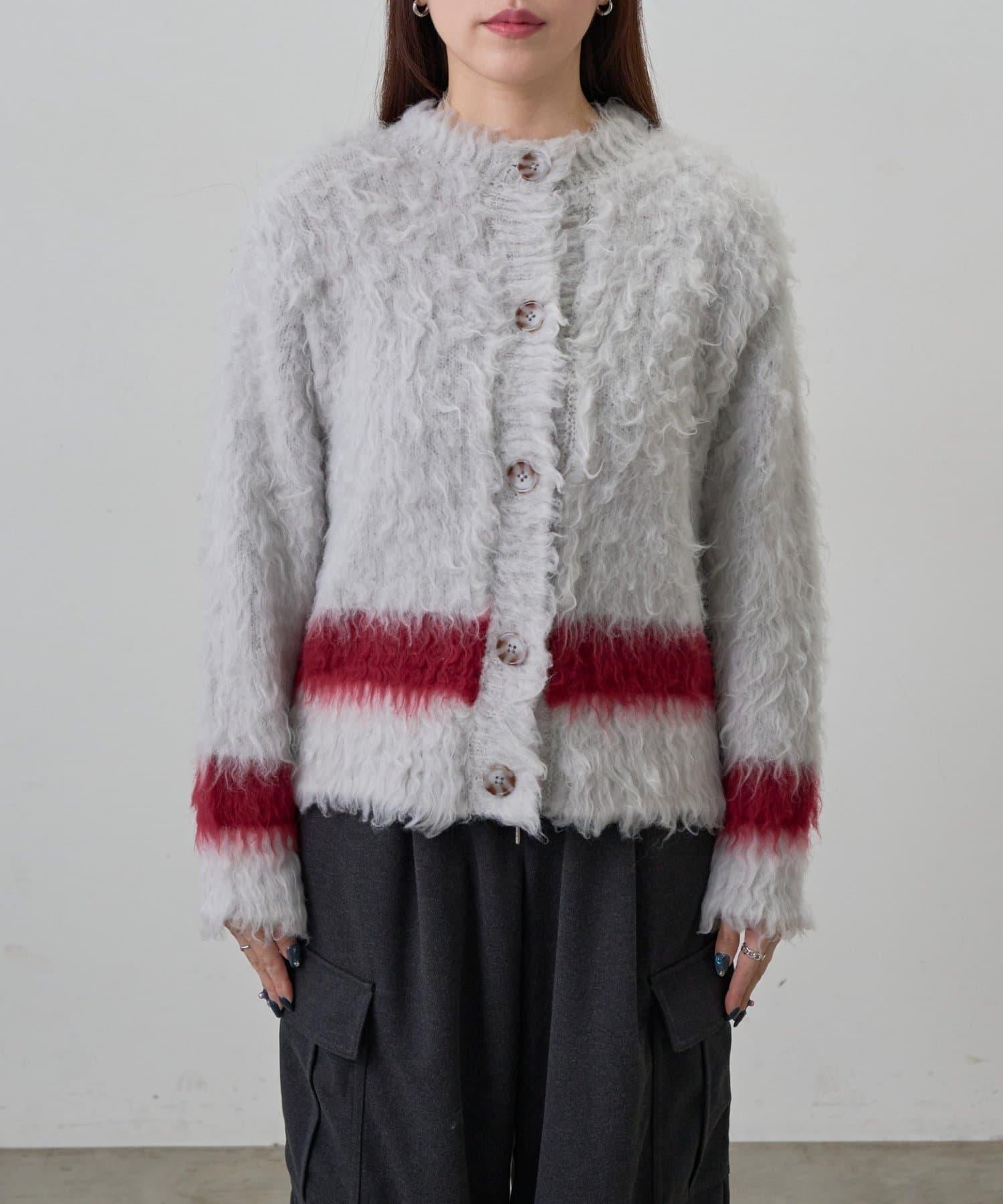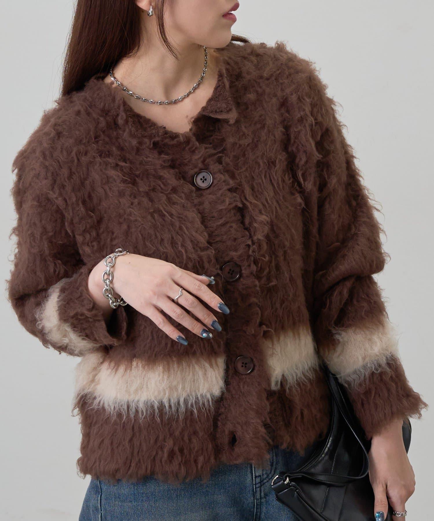 這款圓領開衫採用柔軟蓬鬆的絨毛面料製成,充滿季節感。