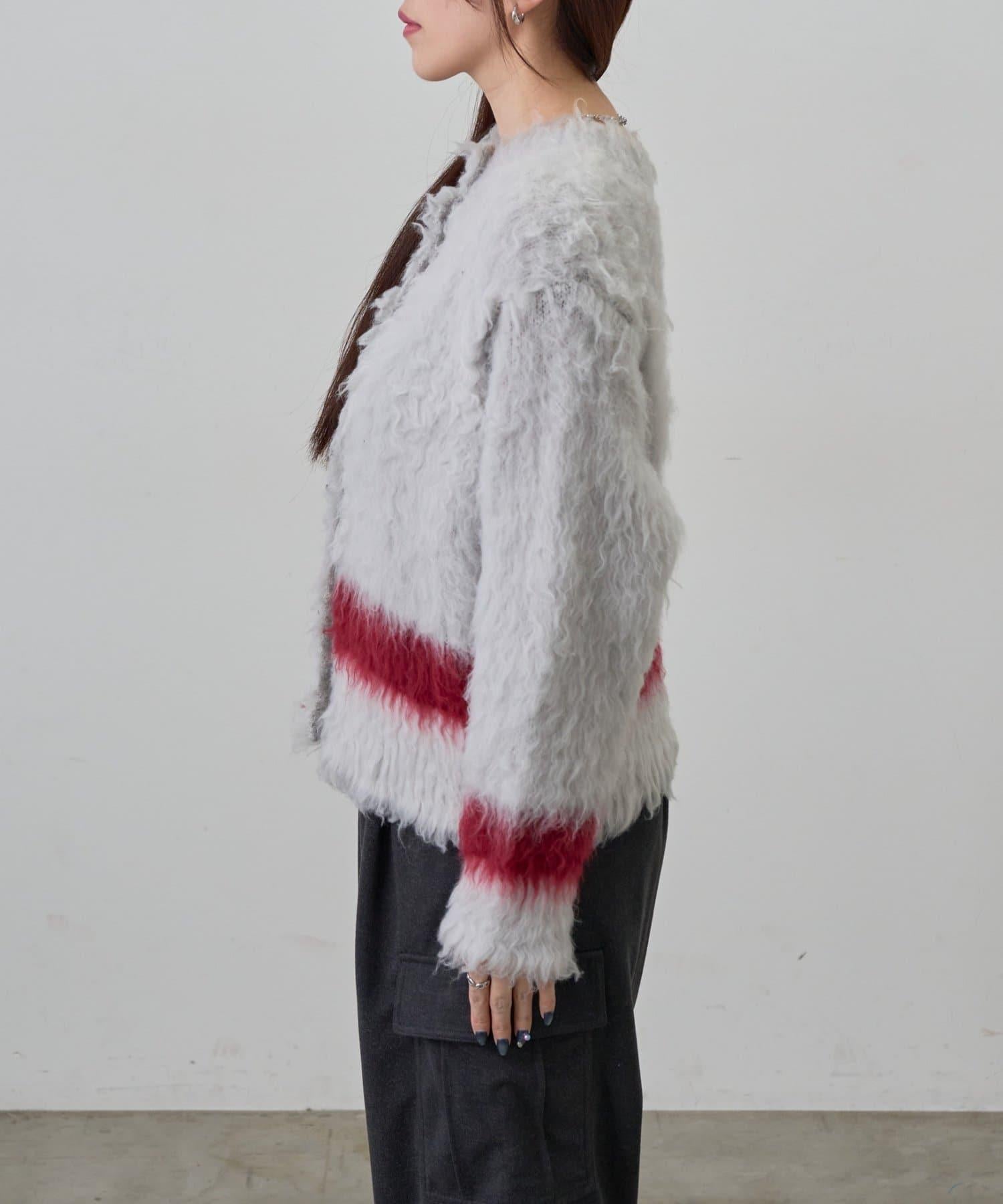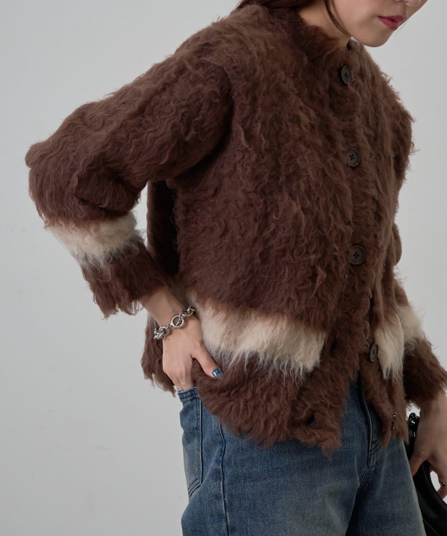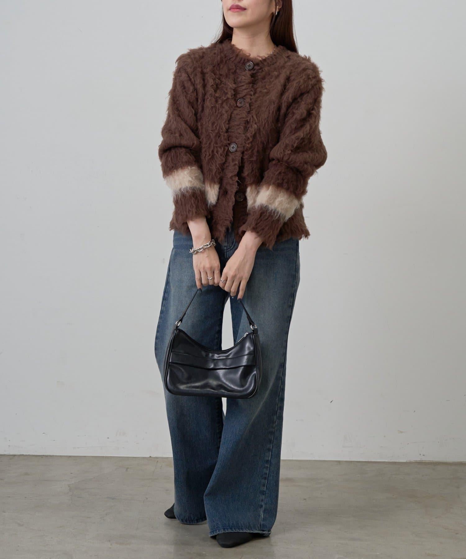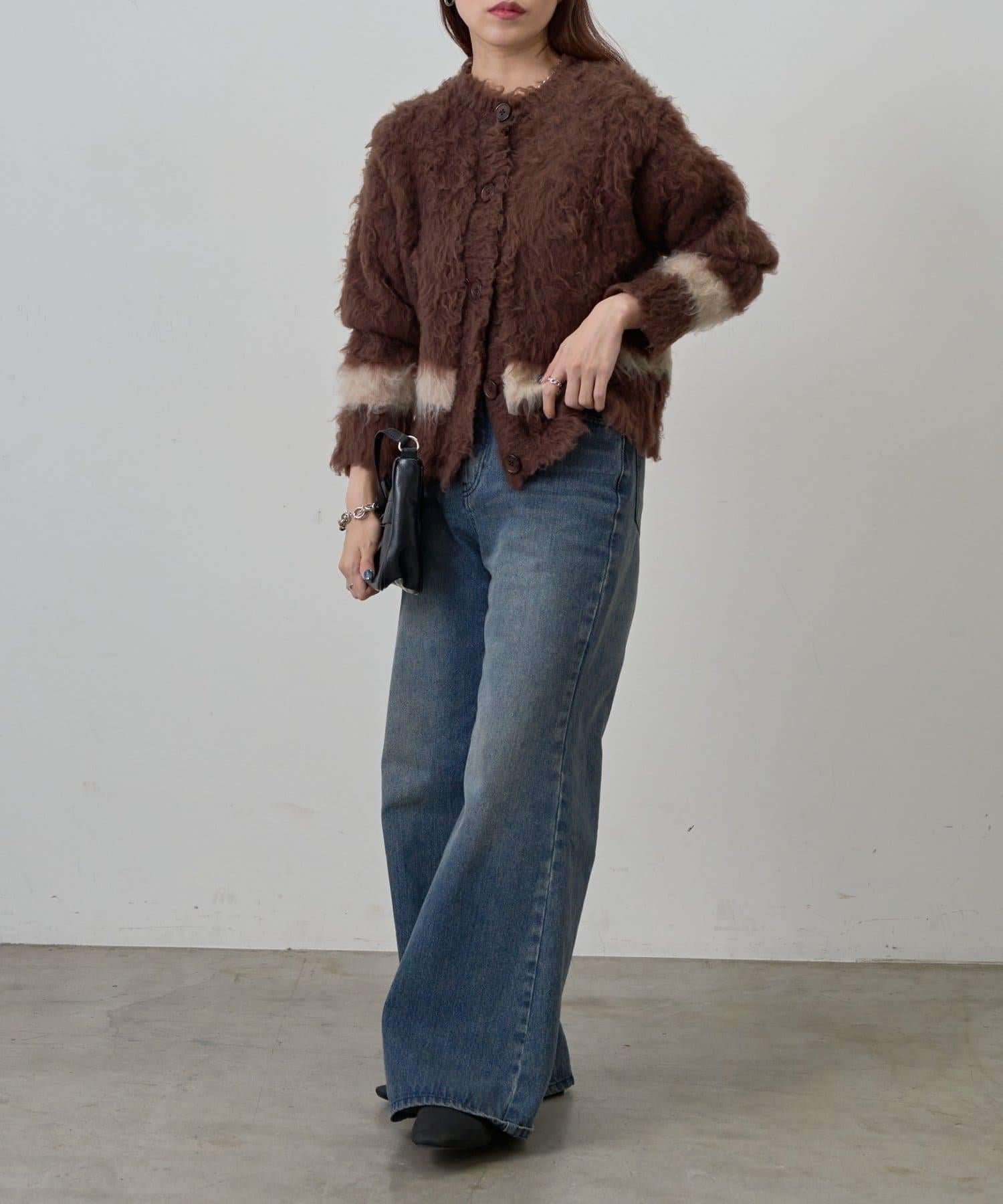 這款圓領開衫採用柔軟蓬鬆的絨毛面料製成,充滿季節感。