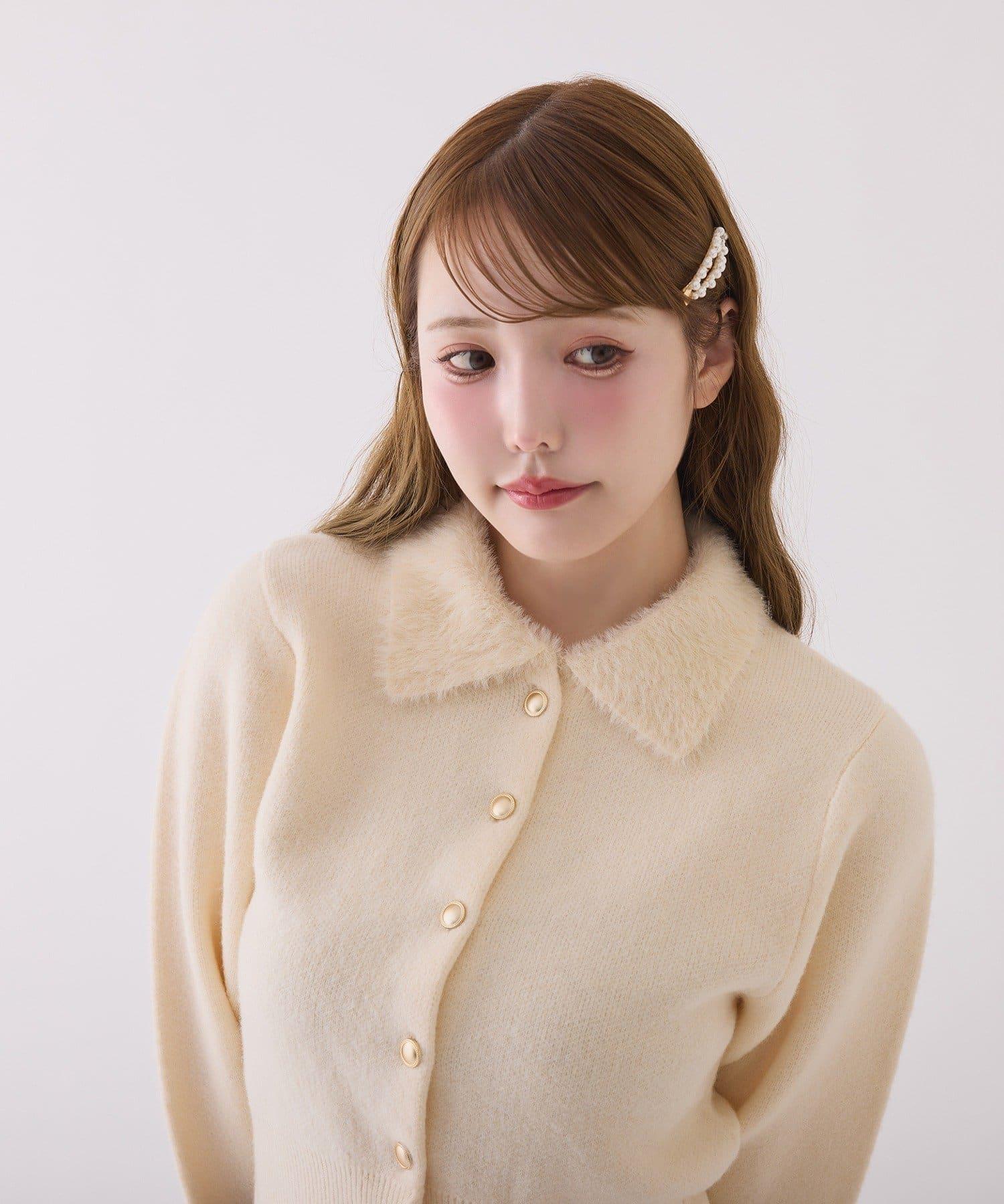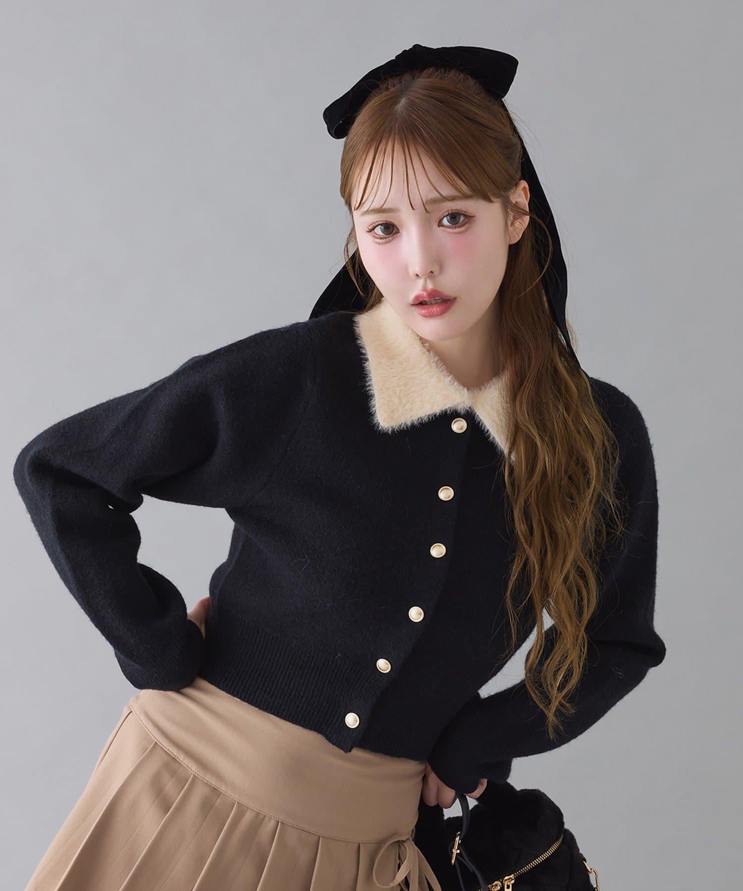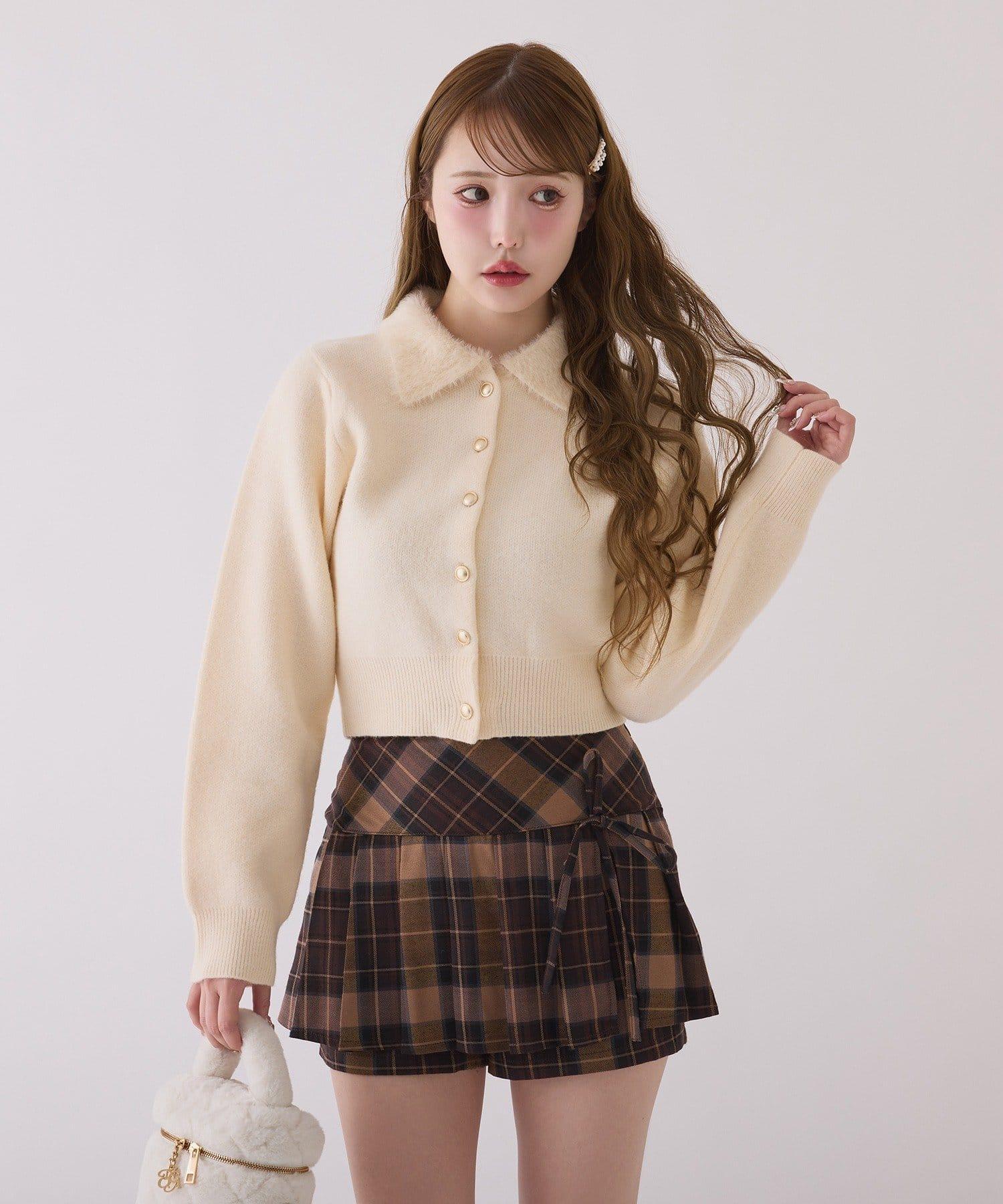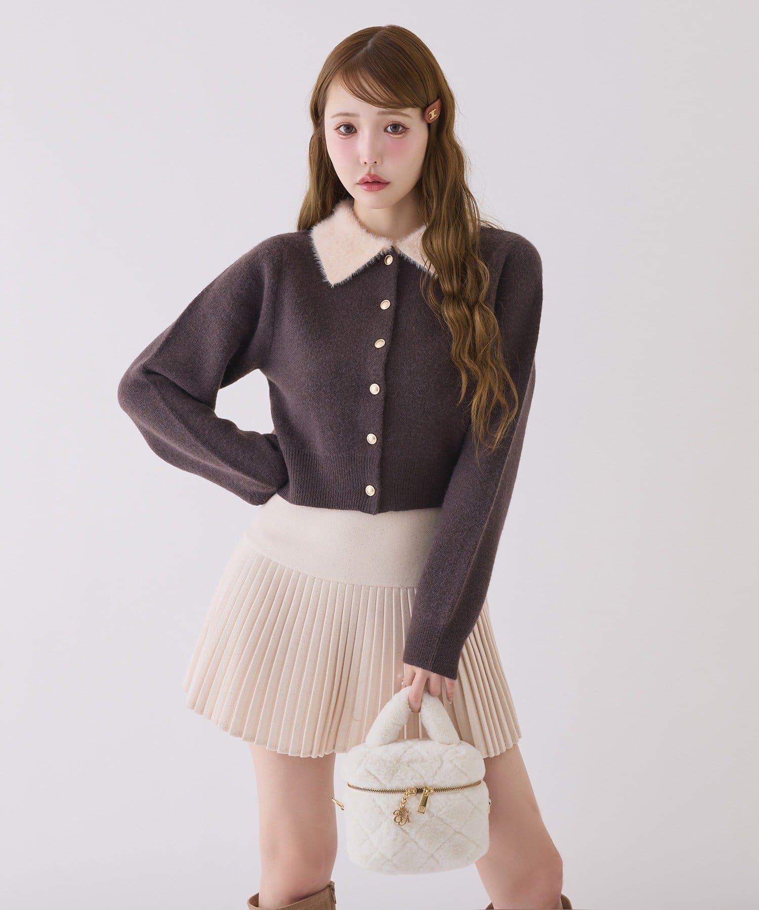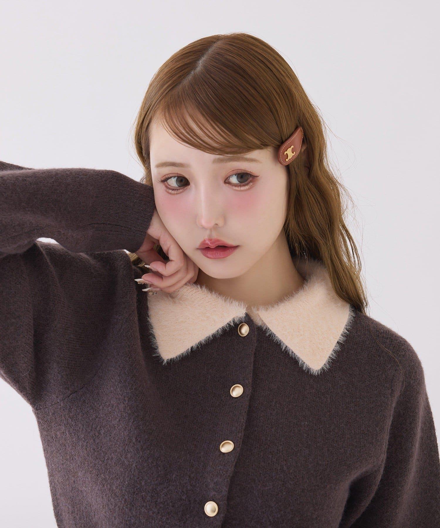 開襟羊毛衫,領口飾有蓬鬆羽毛,前襟飾有金色紐扣。