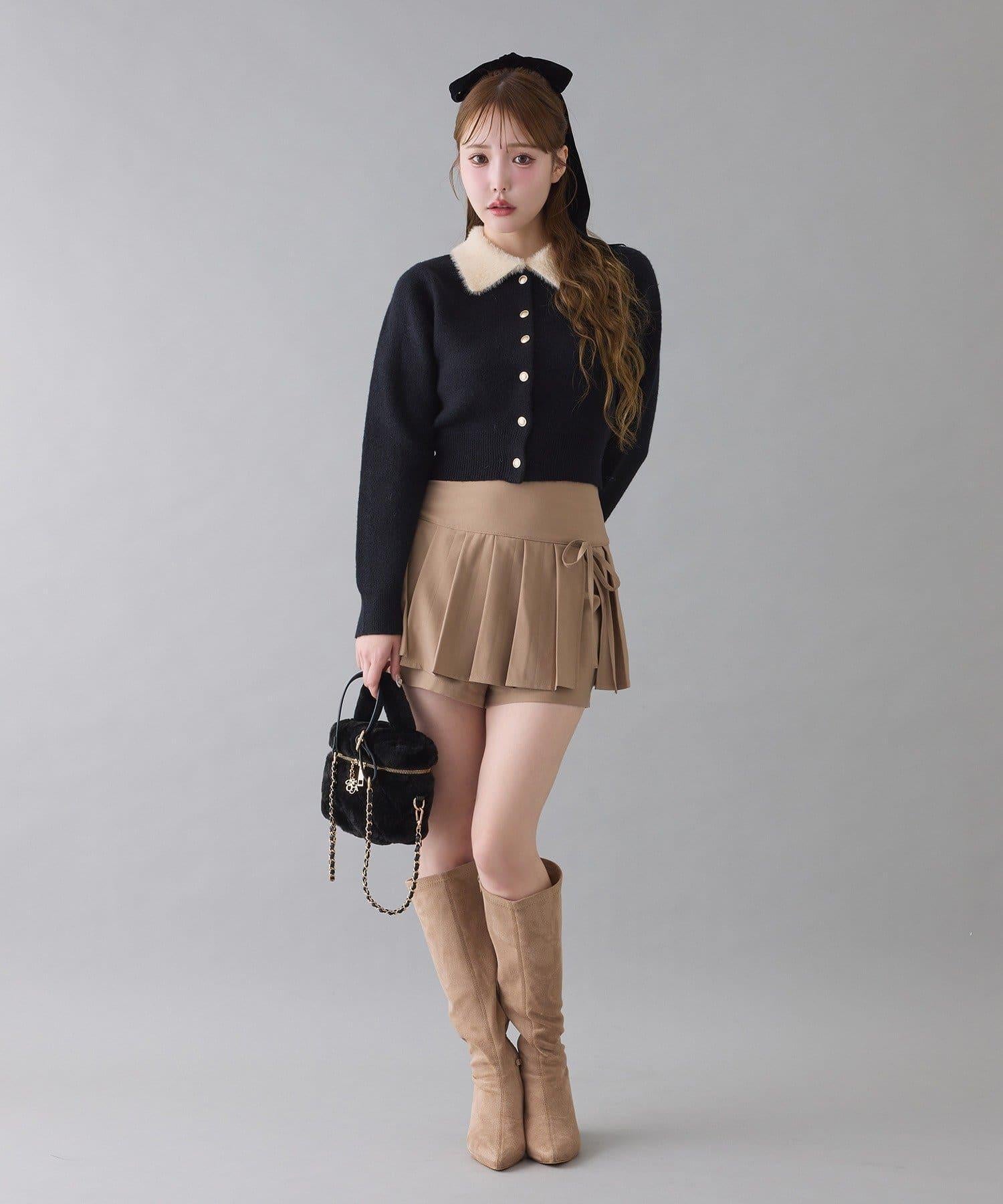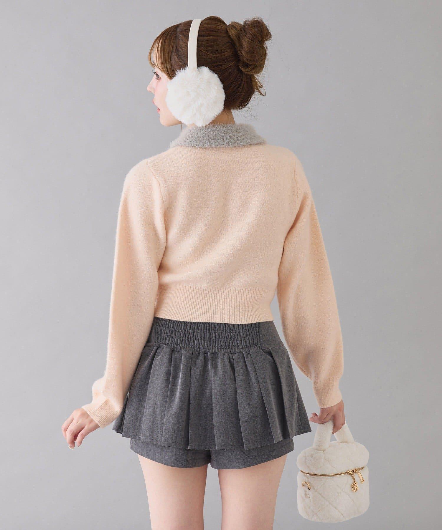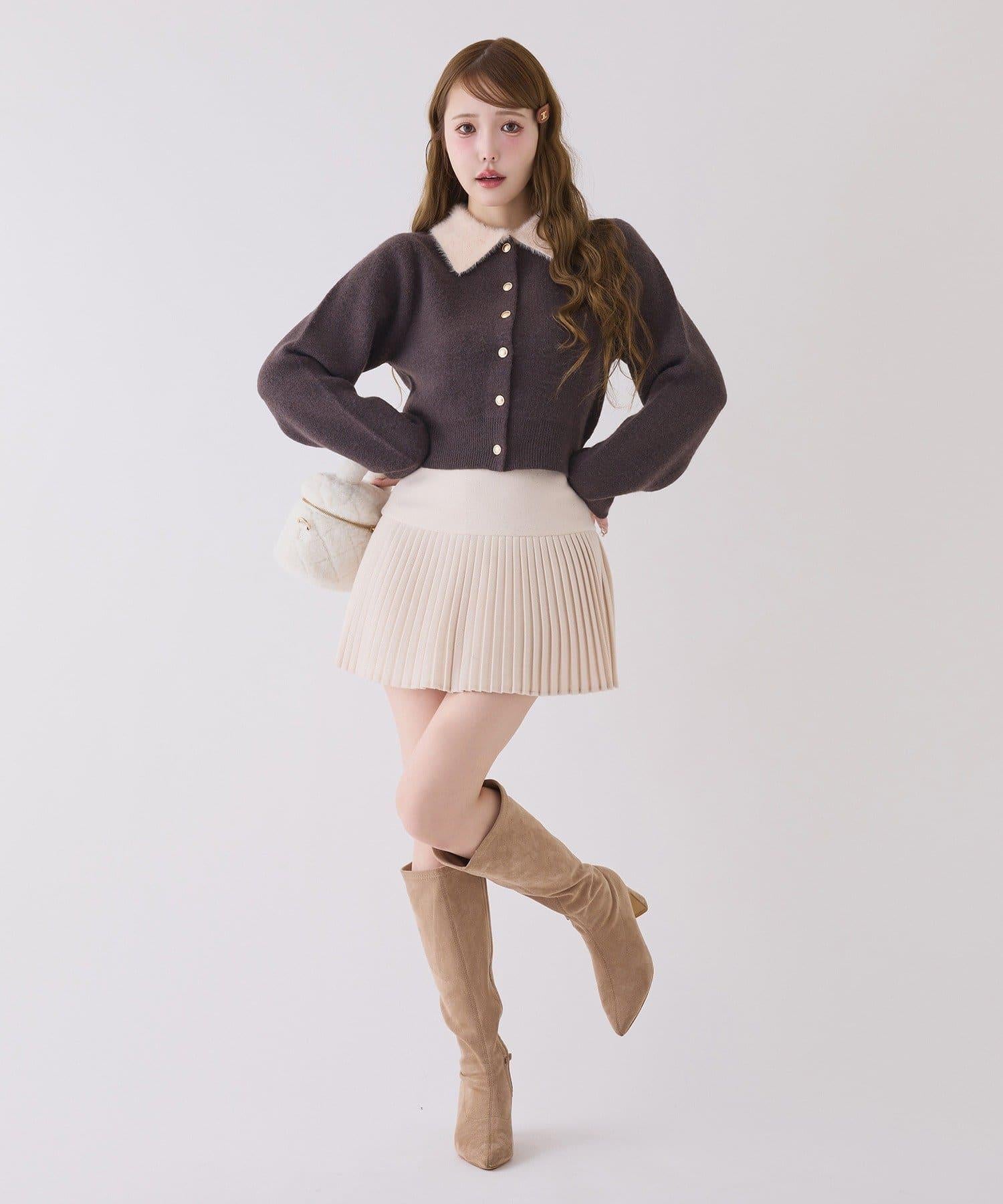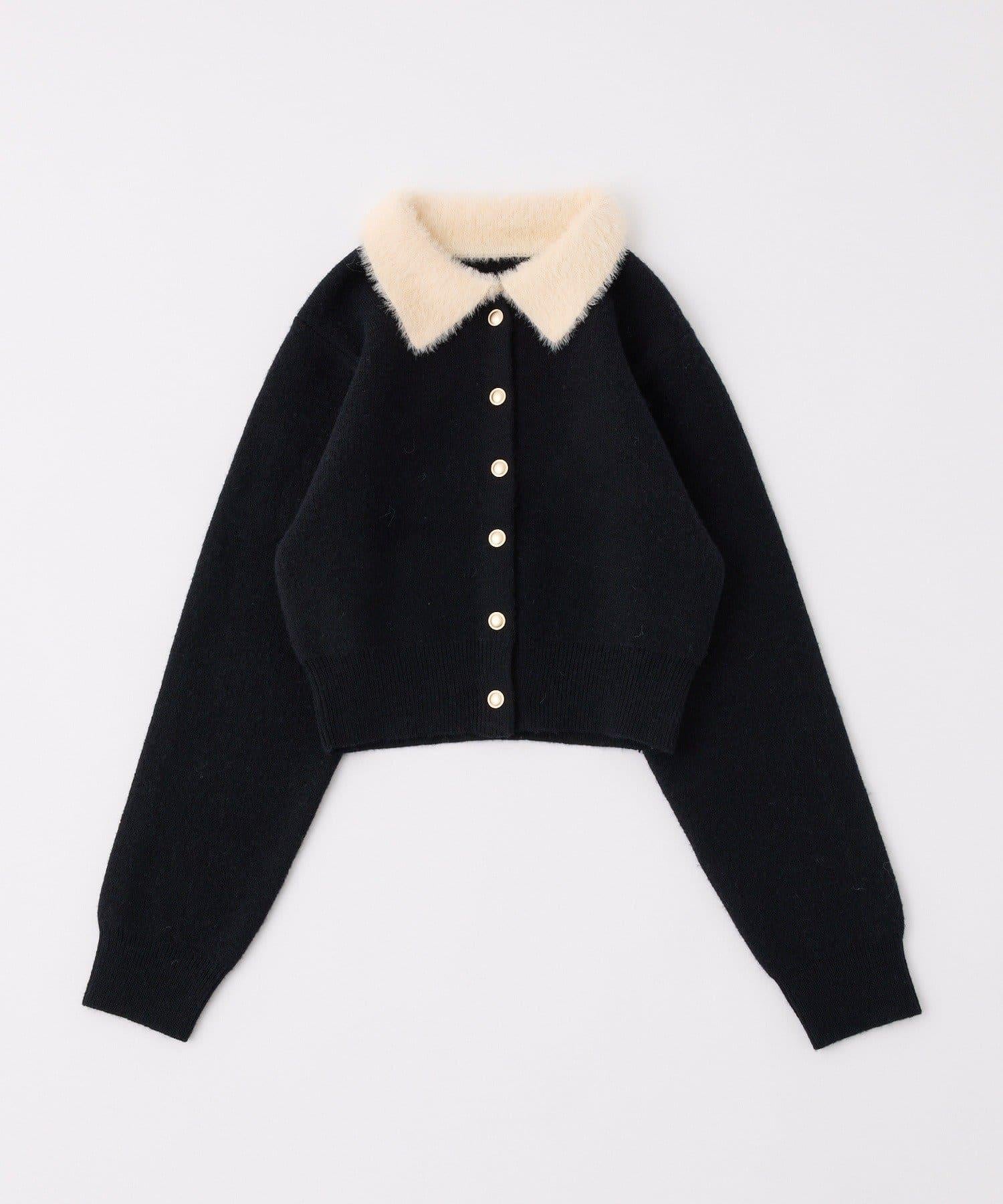 開襟羊毛衫,領口飾有蓬鬆羽毛,前襟飾有金色紐扣。