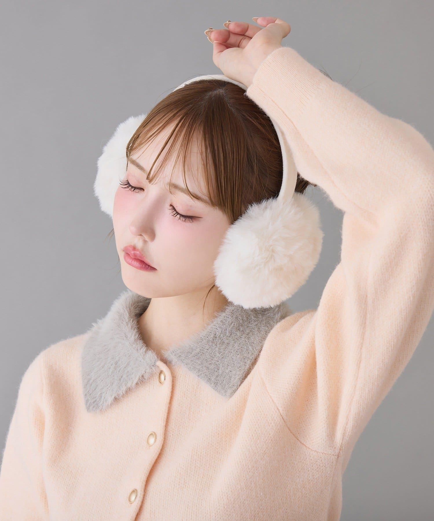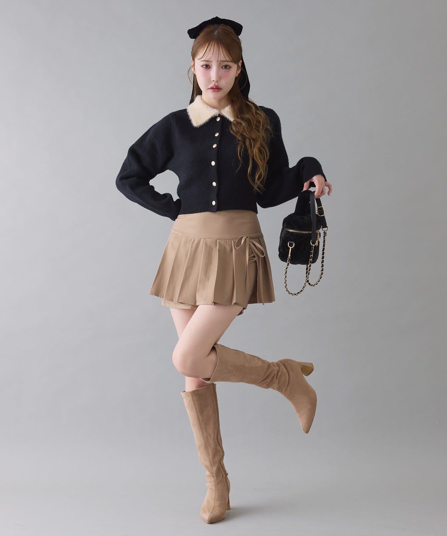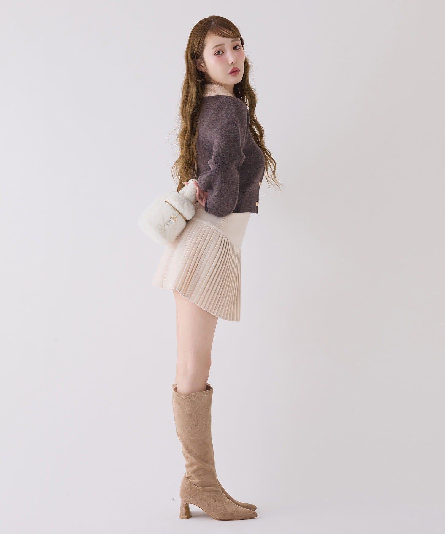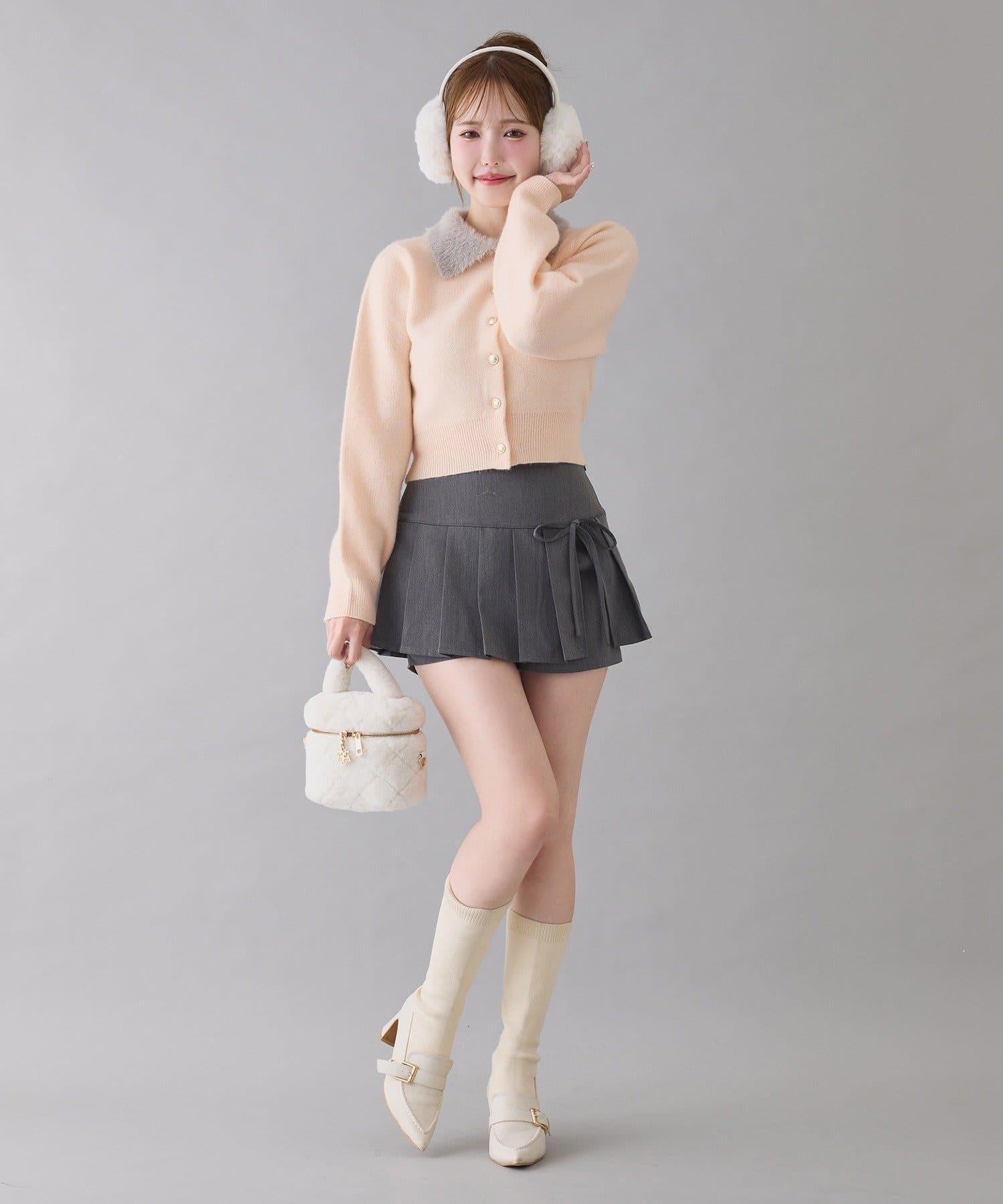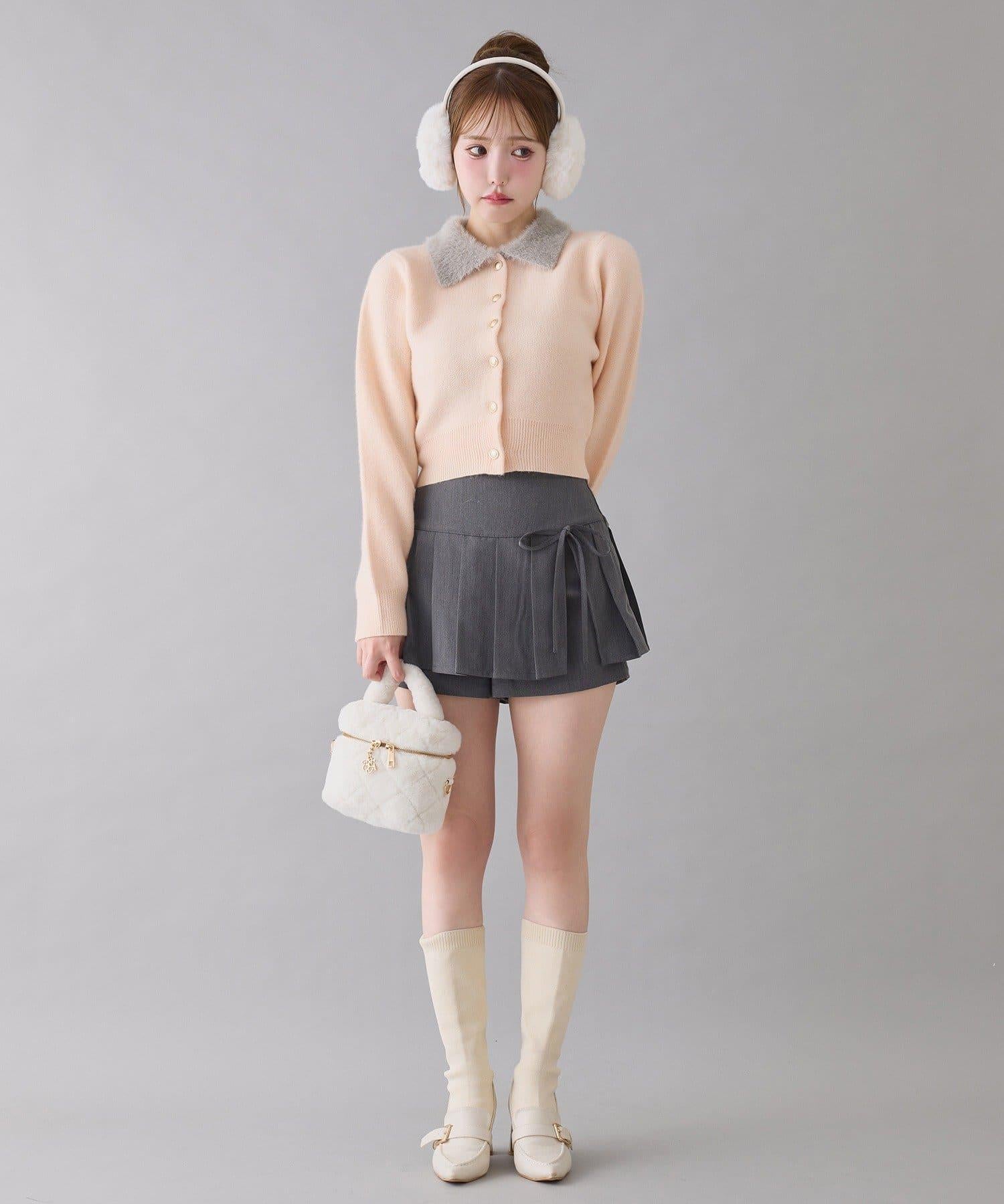 開襟羊毛衫,領口飾有蓬鬆羽毛,前襟飾有金色紐扣。