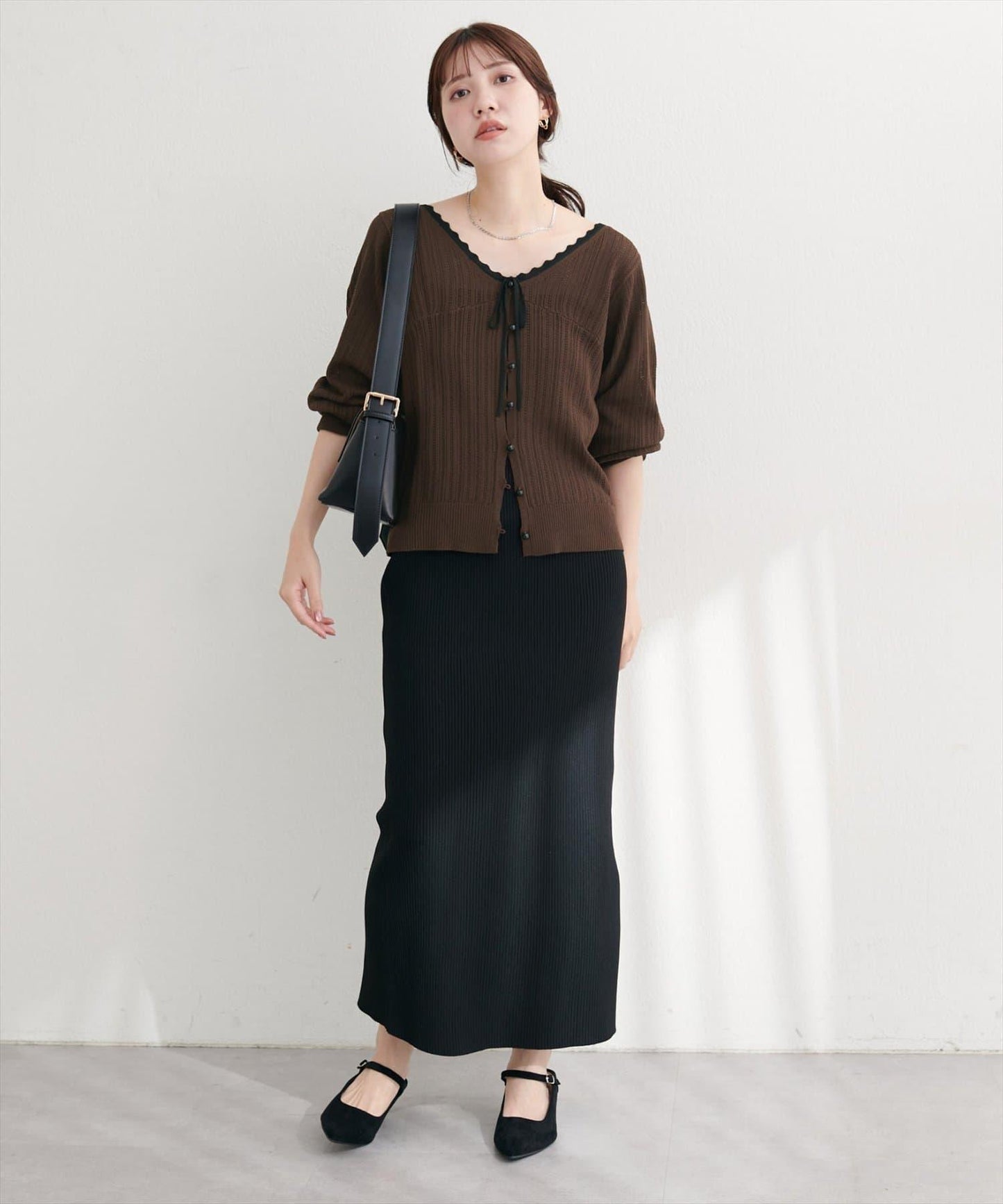 胸前飾有緞帶和蕾絲邊的開襟羊毛衫,更顯成人的可愛。